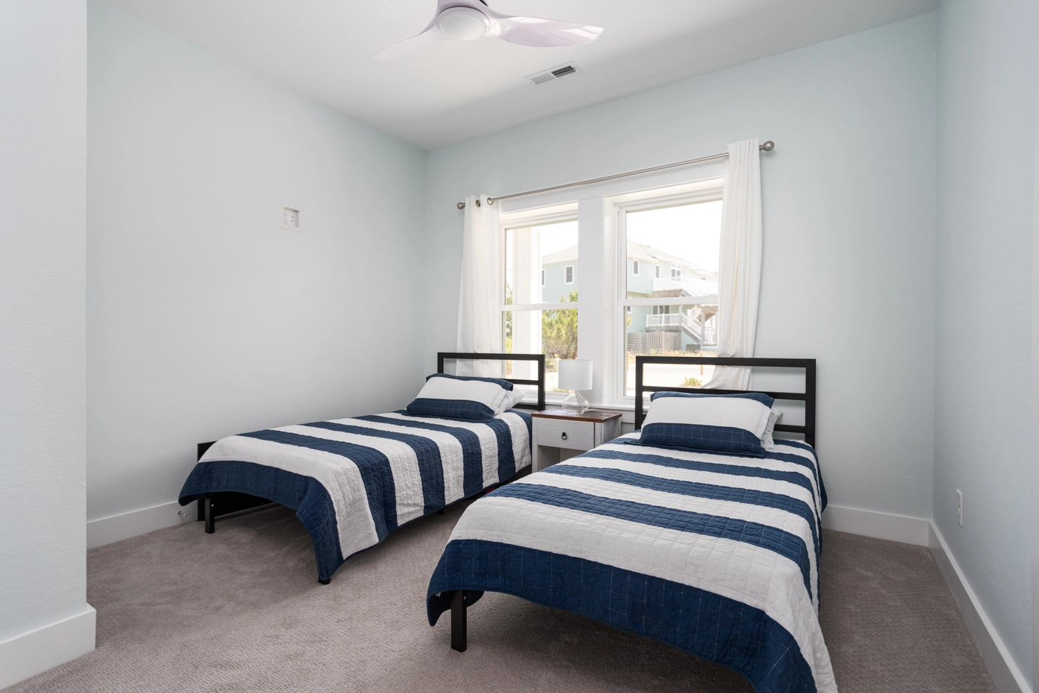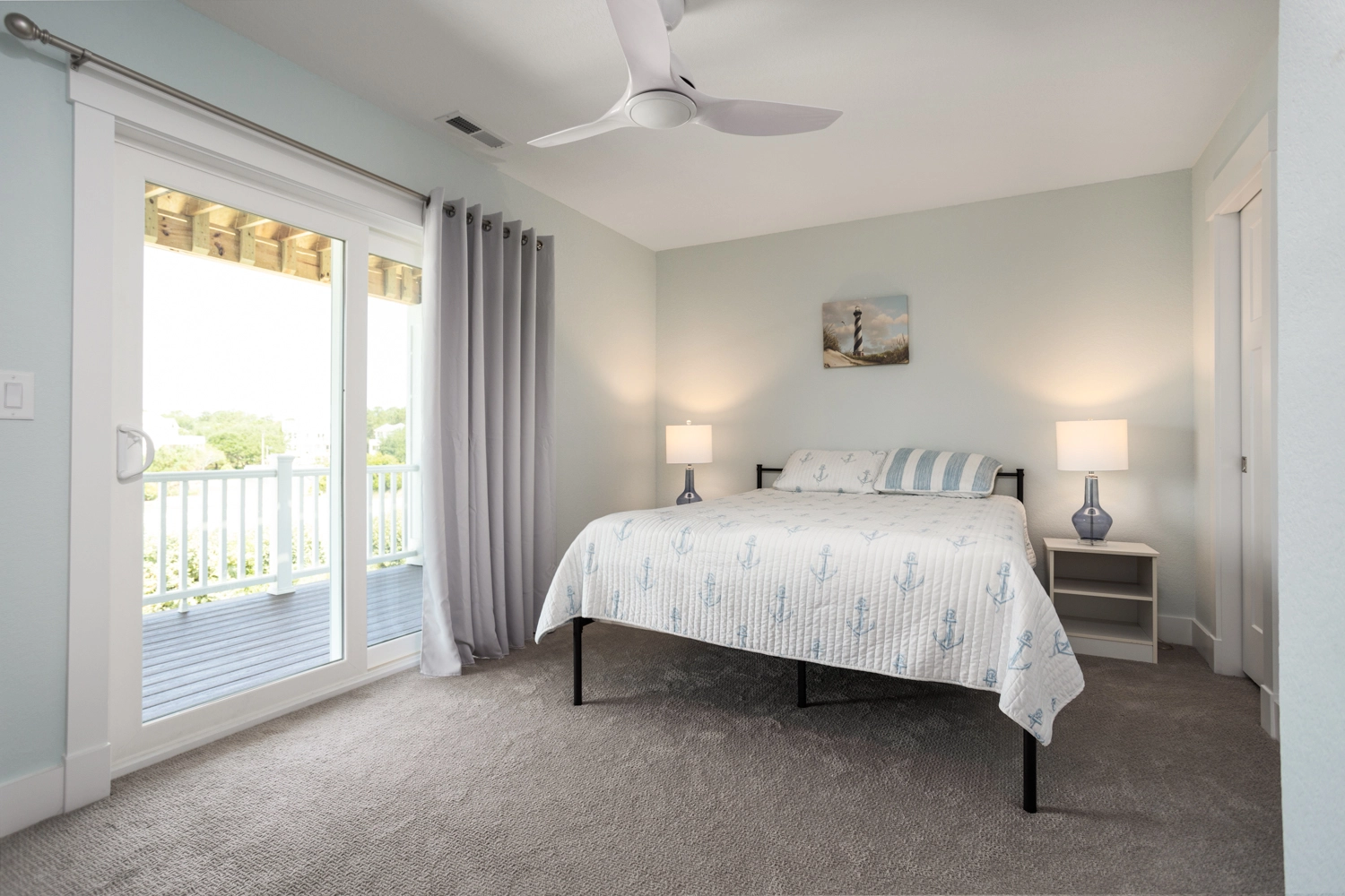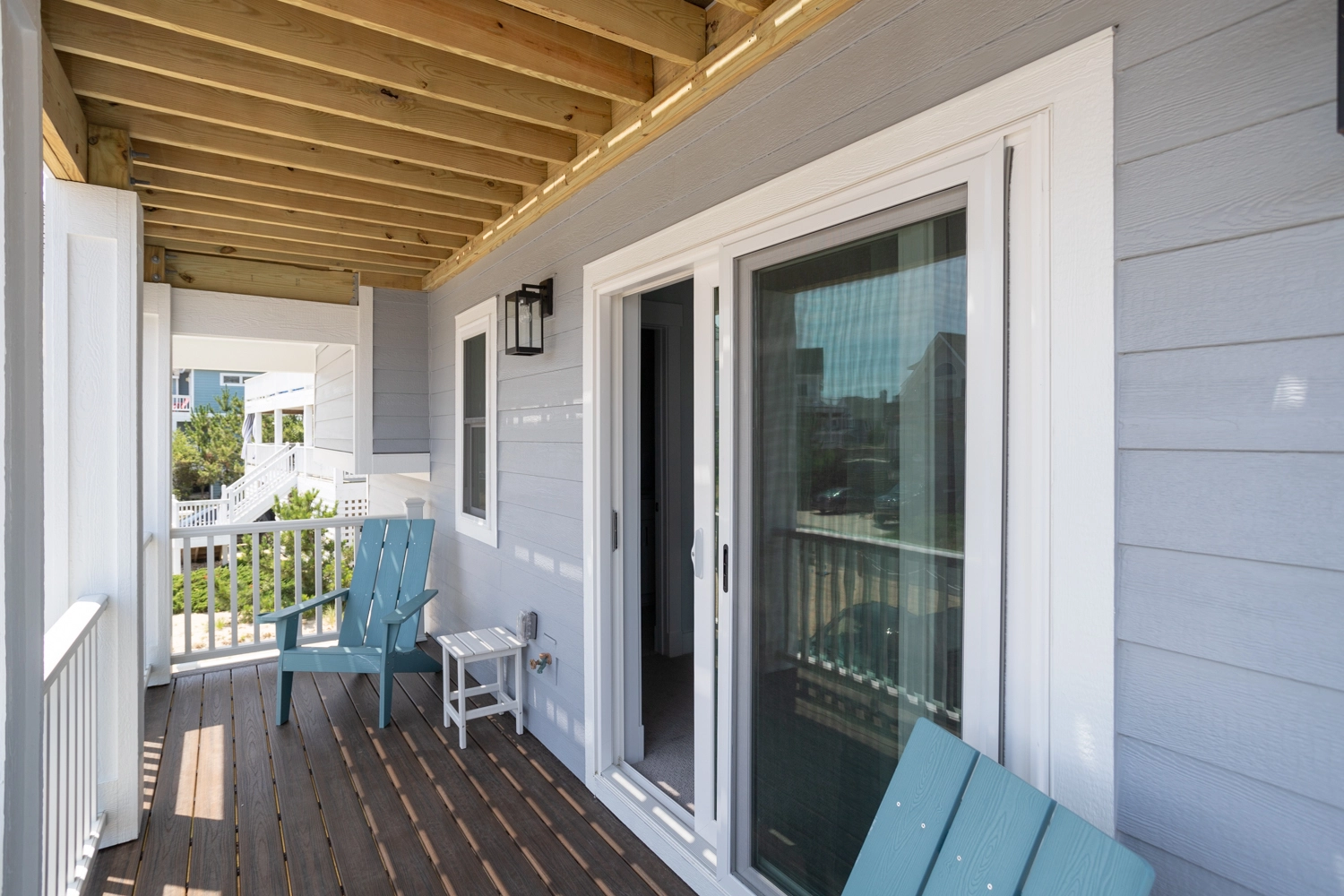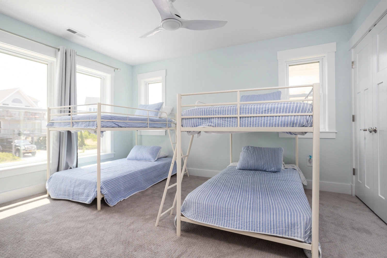 "The house is only about a 5 minute walk to the beach. The house is well built with lots of closet space in the bedrooms. The decks and railings are made from composite materials so no need to worry about splinters, and plenty of chairs are provided. A full size refrigerator on the ground level provides ample space to complement the large refrigerator in the kitchen. The pool area, along with the tables and chairs provided, is very nice. The pool has a large tanning shelf (about 6') which would be good for smaller children. The issue we had with this house is a lack of privacy as there are 2 windows in the 3rd floor bedroom that do not have window treatments and they face the house to the left, the same applies to the "kids" bedroom on the 2nd floor with 2 sets of bunk beds. The dining/living room also lack window treatments on the side facing the house to the right."