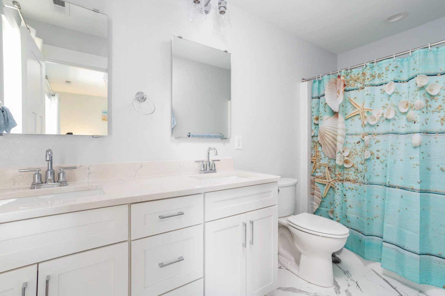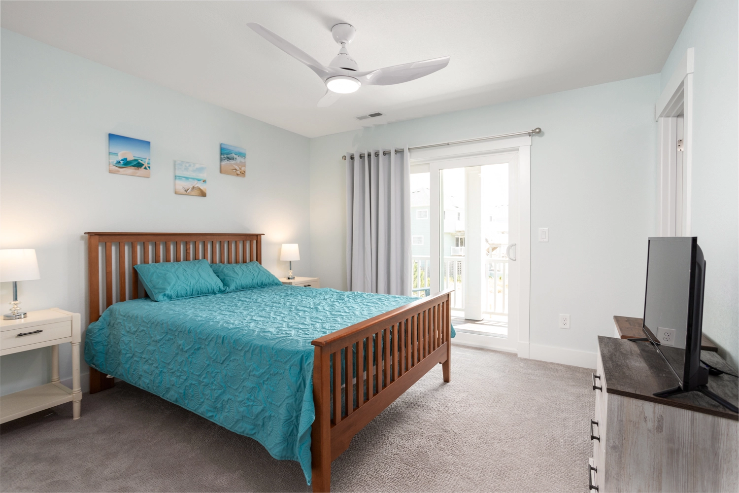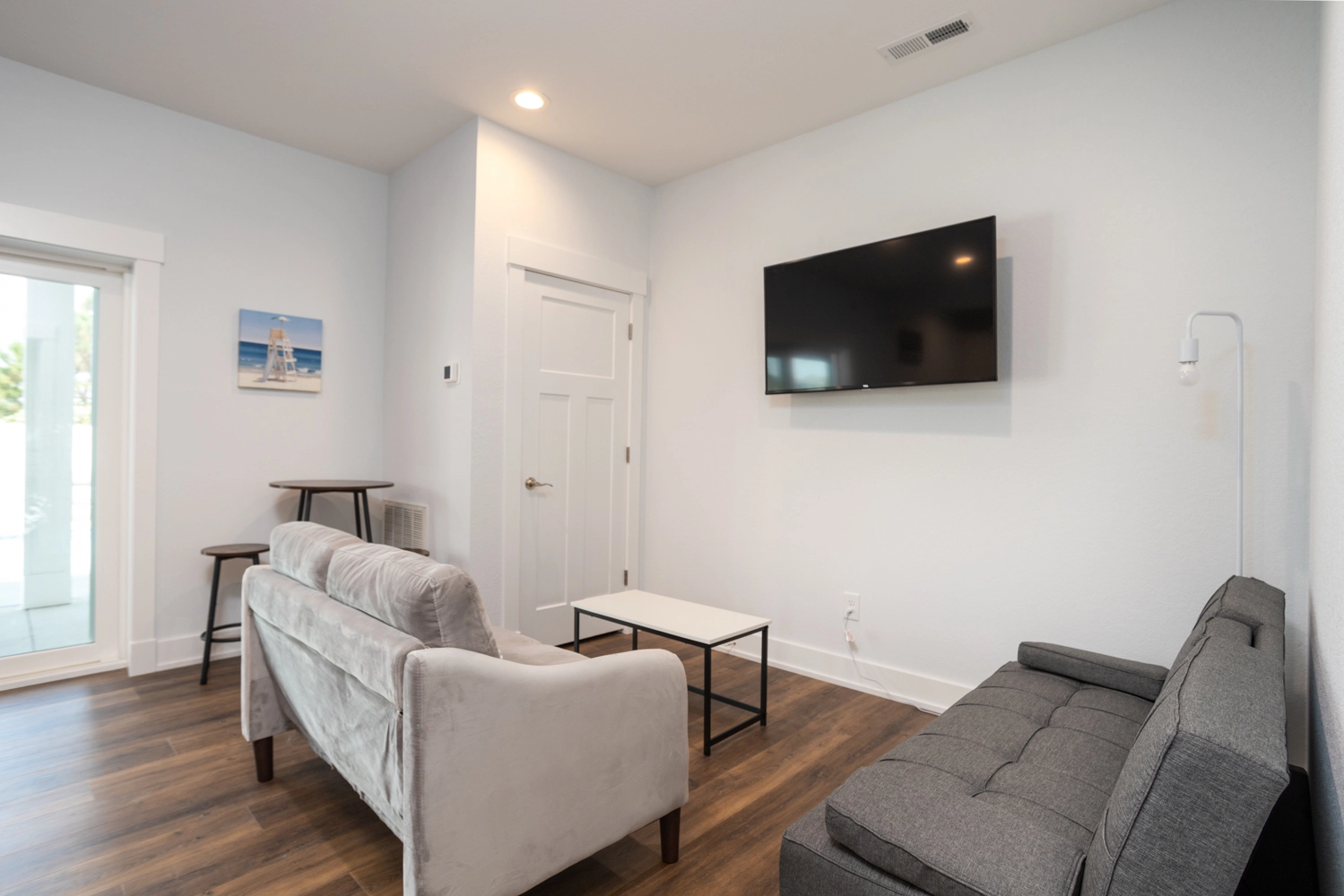 "We liked that the home was new and it wasn't cluttered with a lot of knick knacks and things that weren't necessary. It was in a good location, walking distance to the beach. We loved that every room had its own bathroom and private decks. At first we thought it was weird that the decks didn't have stairs but we actually really enjoyed not having the stairs because we could let the dogs out to enjoy the weather without them running off. The pool area was nice and we loved that it was fenced in, but it would have been even better if it had some grassy area for the dogs The extra full size refrigerator and freezer with the wet bar downstairs was a great bonus. I was also very pleased to see that there was a lot more window coverings in the home then when I initially booked the home. All of the photos when I originally booked showed that the majority of the windows did not have any curtains on them and one of the reviews noted that they did not like the lack of curtains either. I was so happy to see that when we arrived there were plenty of curtains. The only place I would suggest adding a curtain would be the sliding door in the kitchen."
