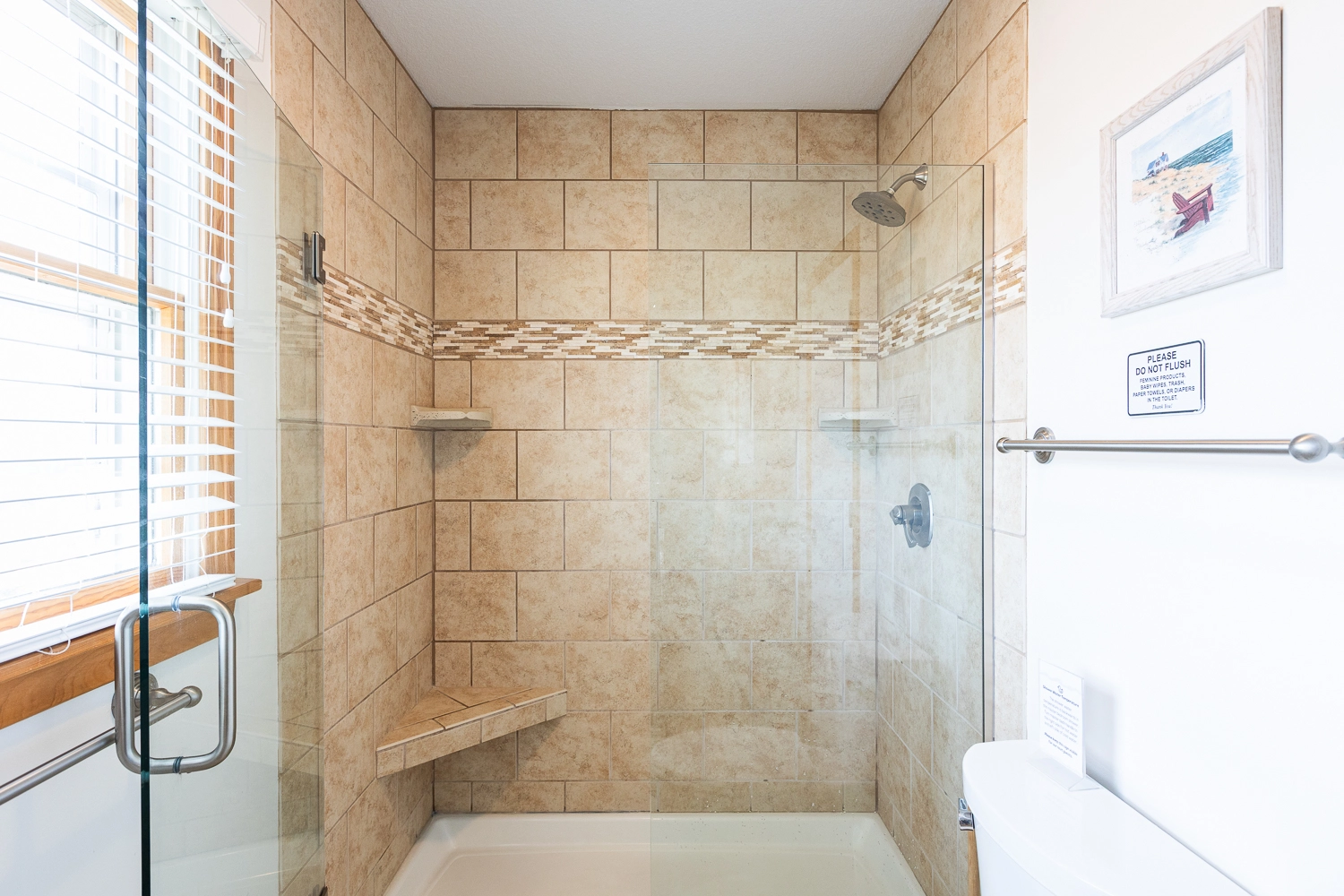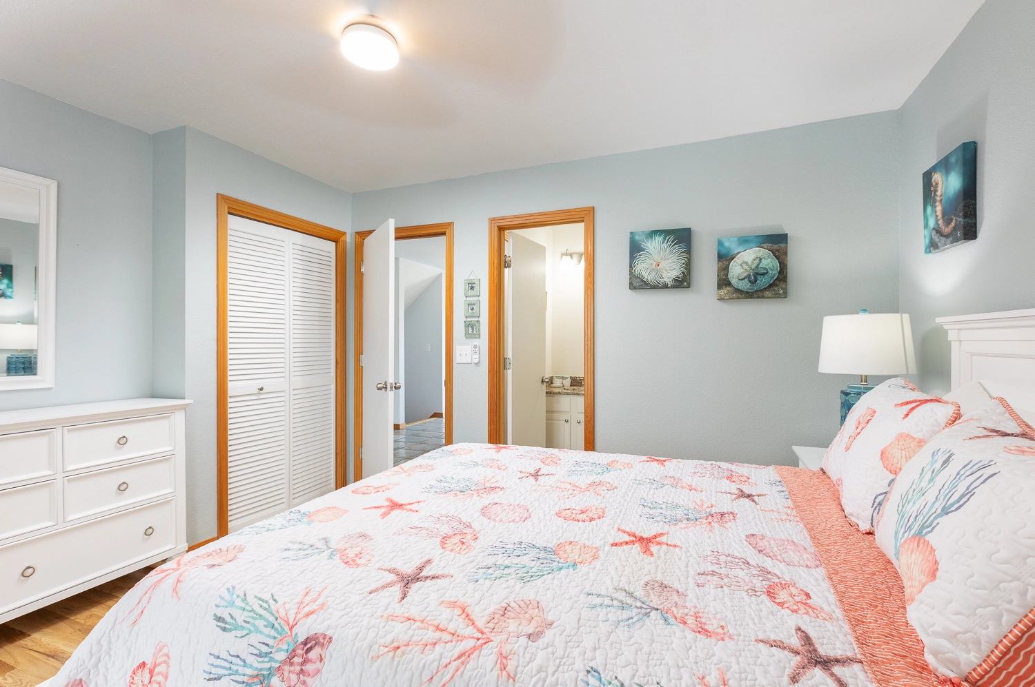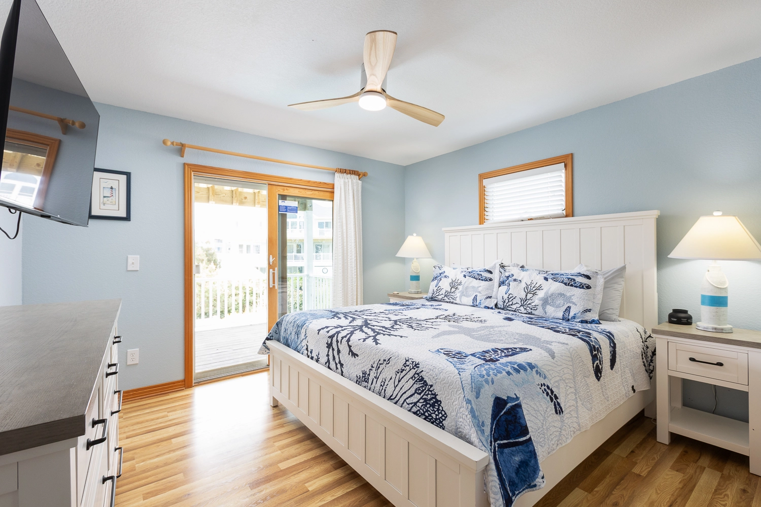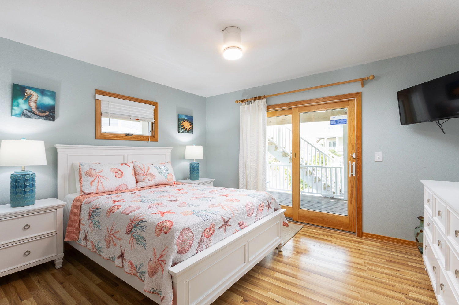 Queen, Semi-private bath, Shower/tub combo, Deck access