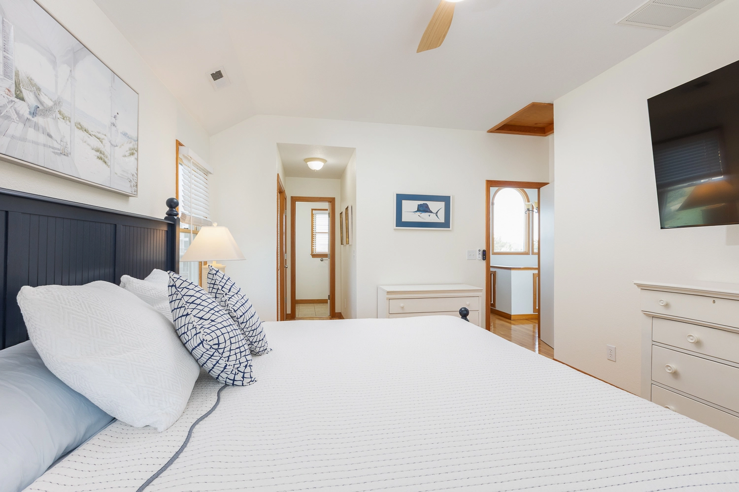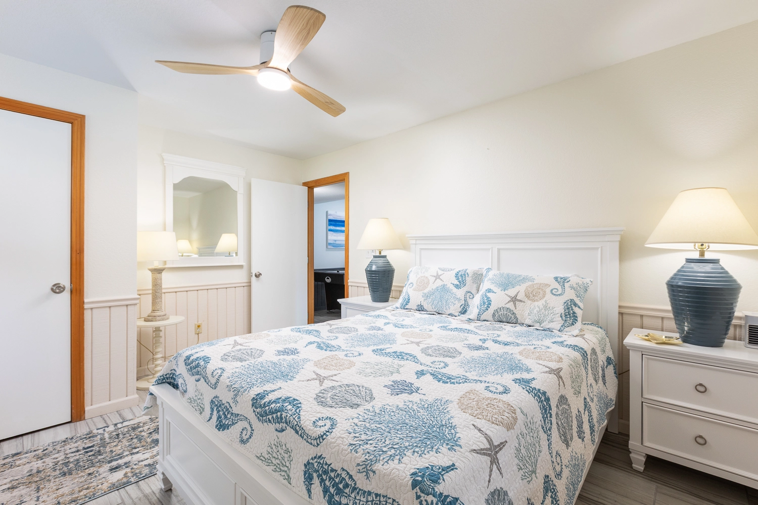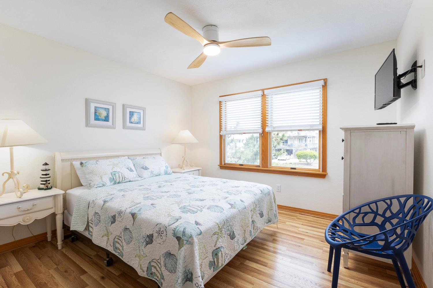 Queen, Semi-private bath, Shower/tub combo, Deck access