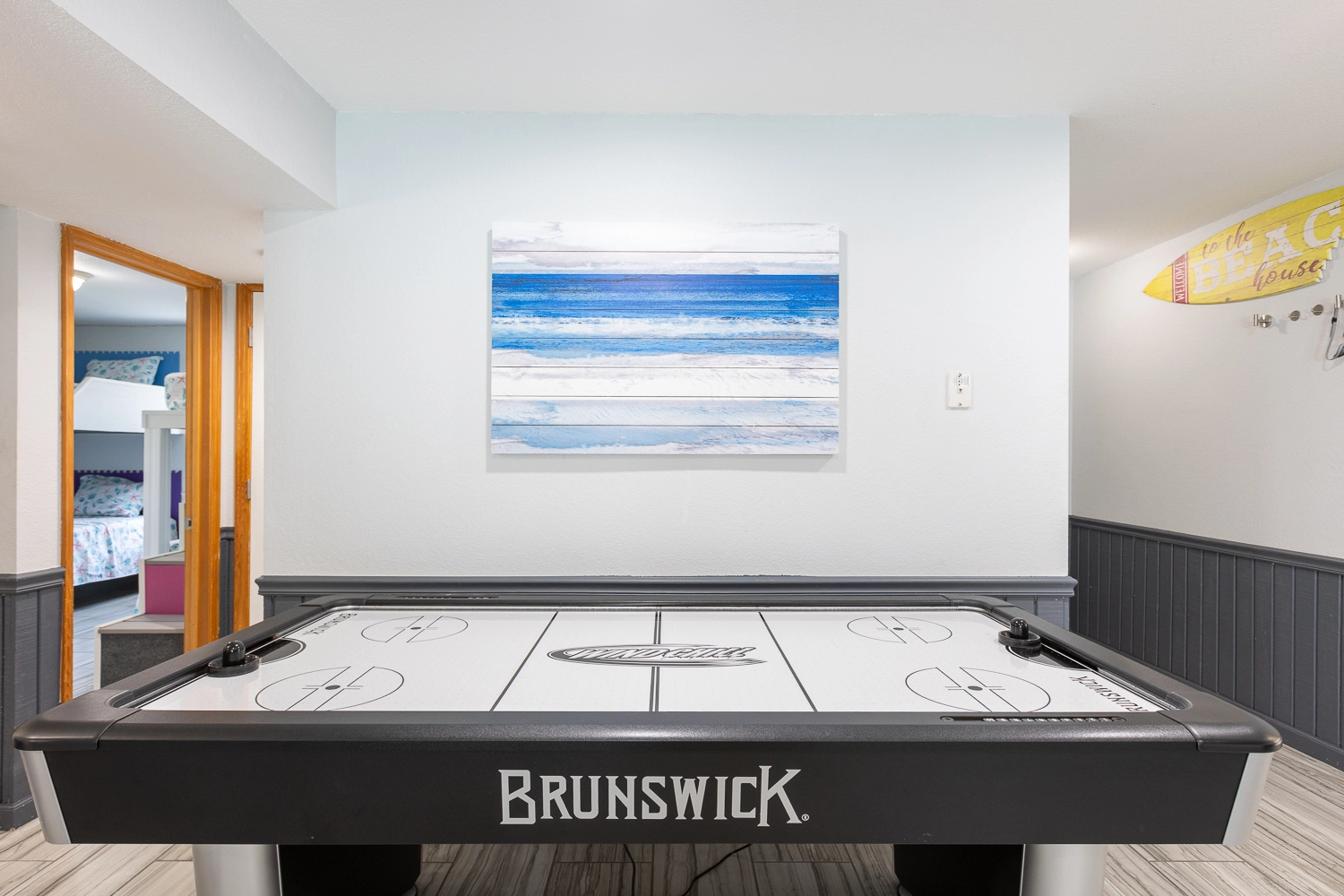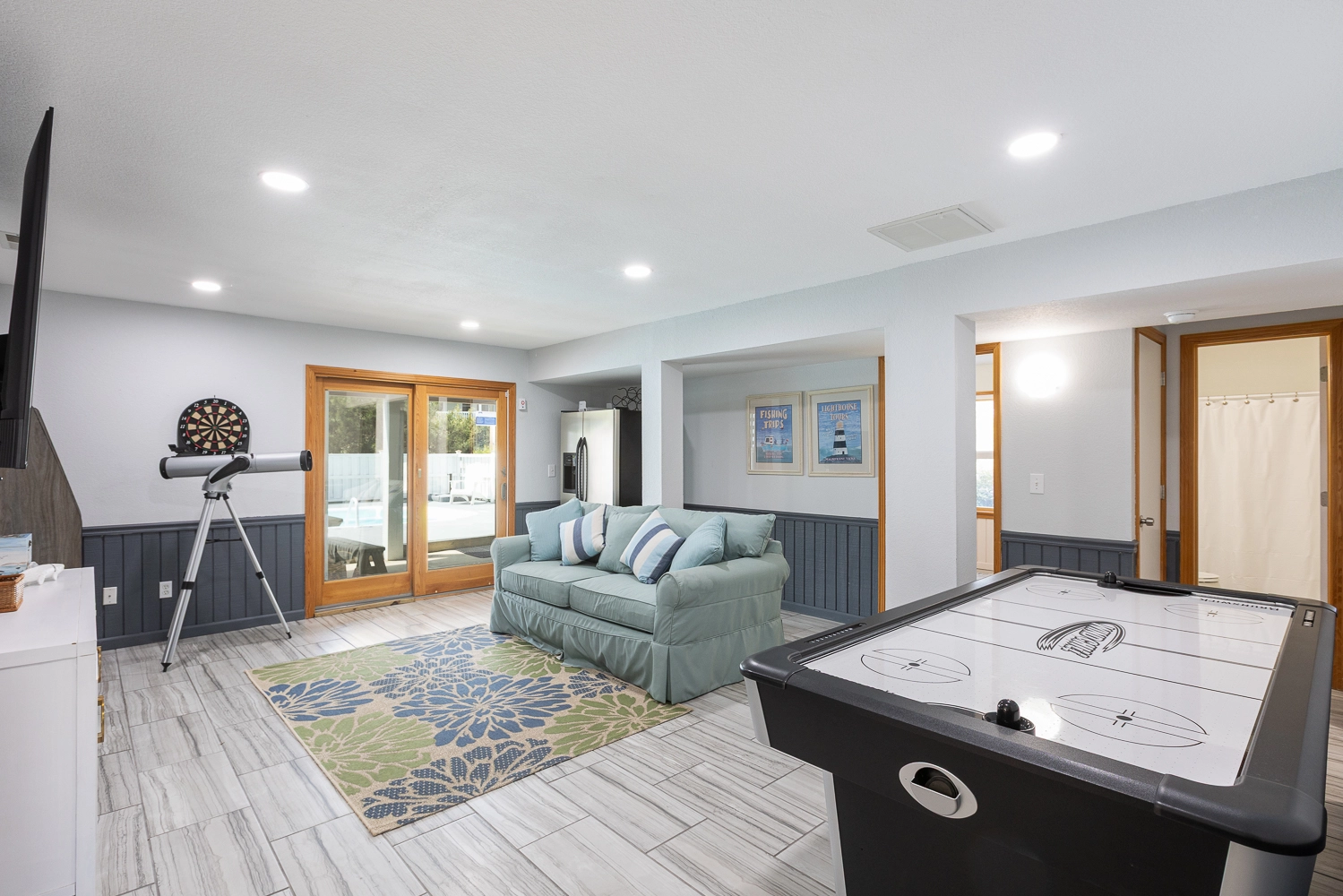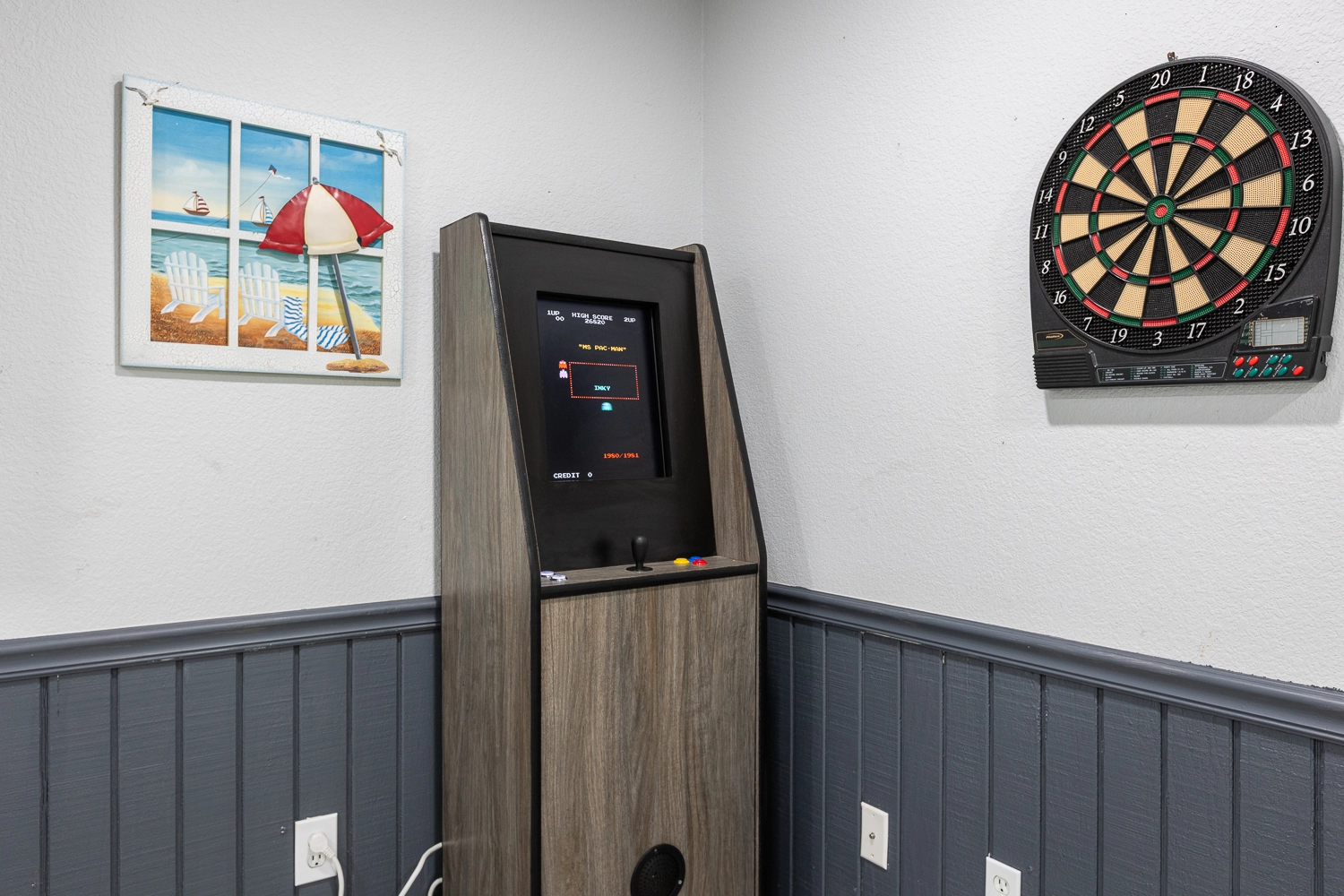 Rec room with air hockey table, arcade game with 200+ games, and a bean bag toss.