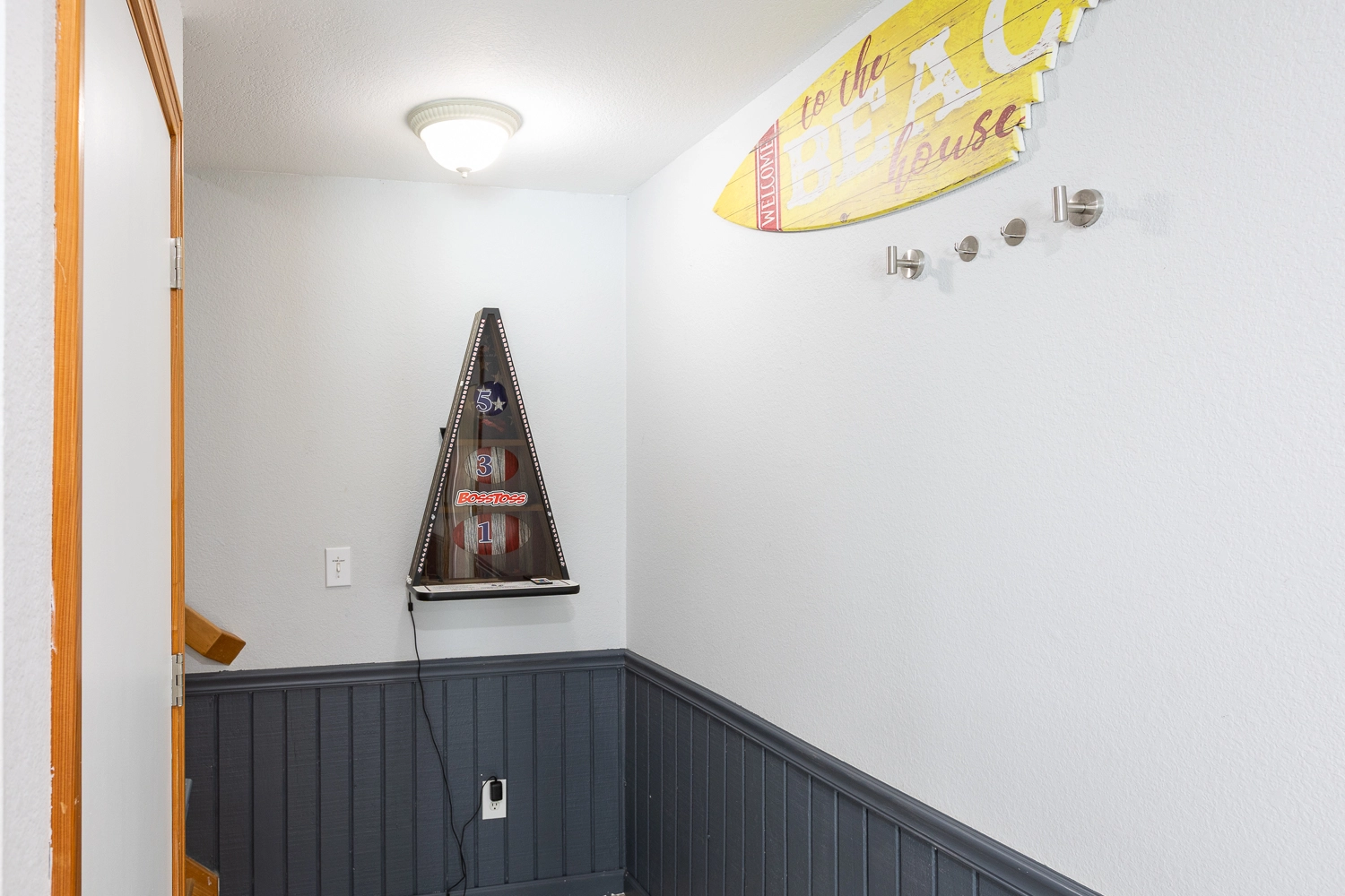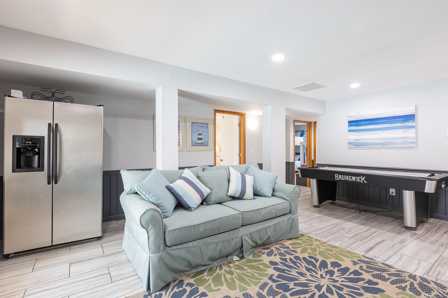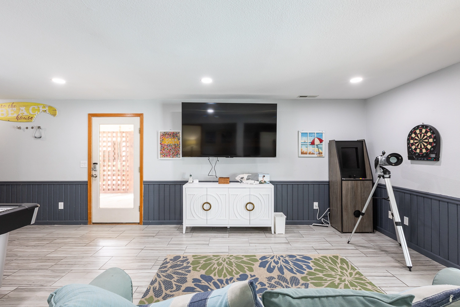 Rec room with air hockey table, arcade game with 200+ games, and a bean bag toss.