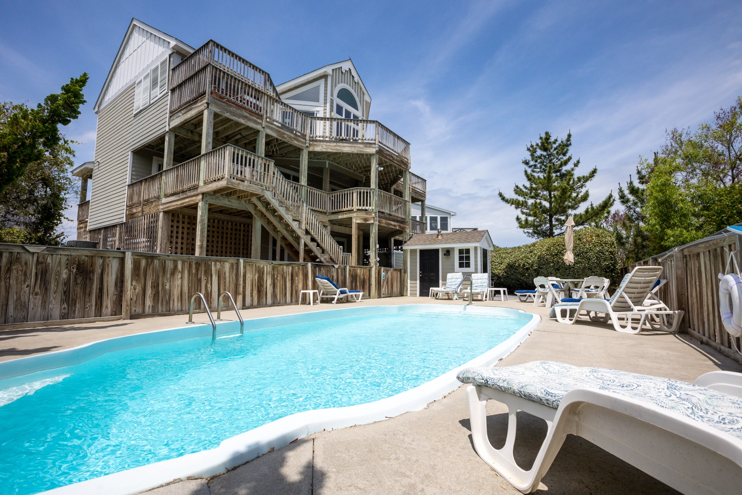 "This house was THE BEST we’ve ever stayed in on the Outer Banks. We just booked again for next year. Pool is always in the sun, and the walk to the beach is less than five minutes. Very comfortable and roomy. Nice beds. Two outdoor showers. Hot tub. Wet bar, bathroom, and fridge on the pool level. TVs in every room. Ocean view. Well furnished. I mean… honestly. The best. Well done!"