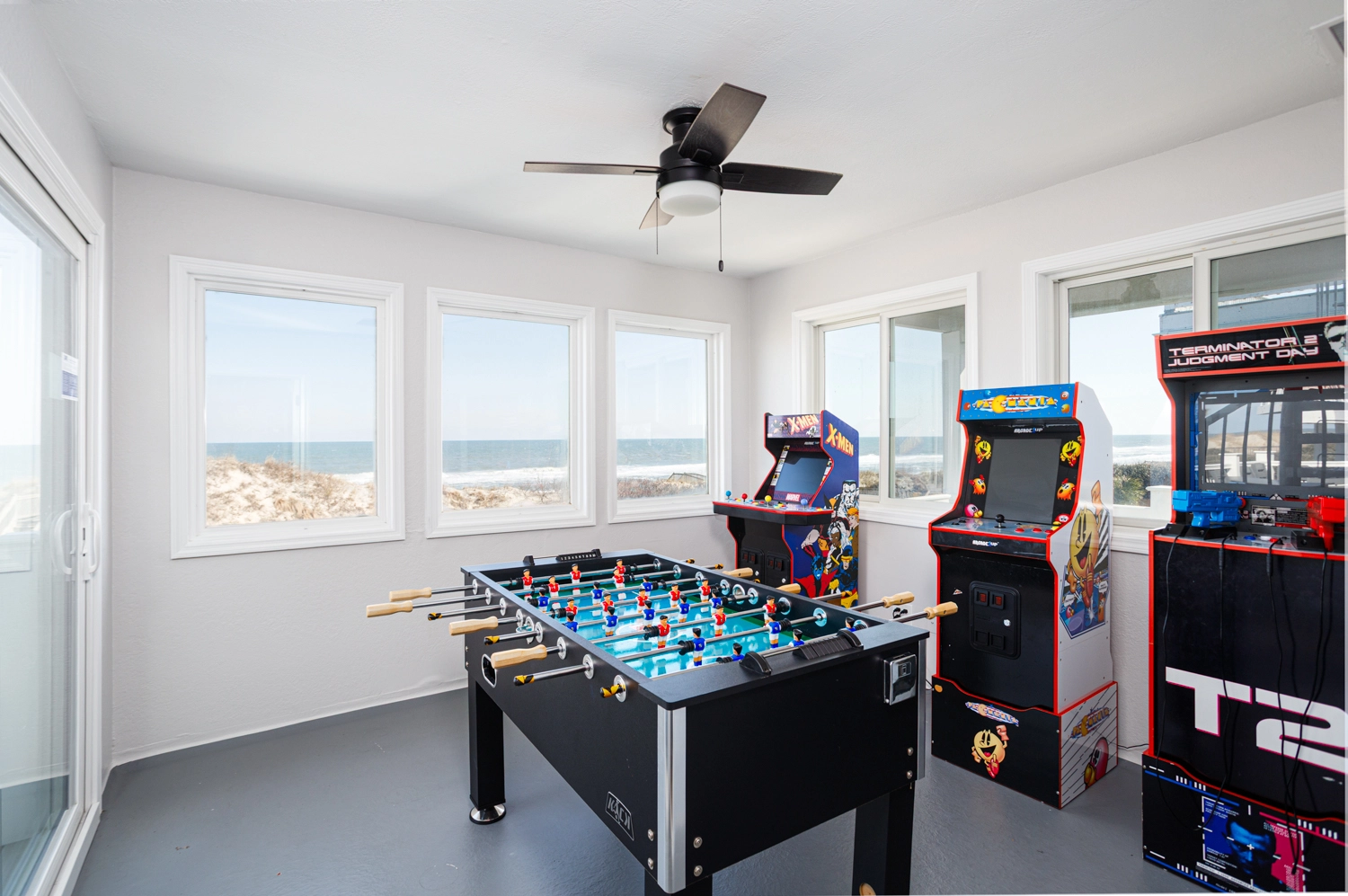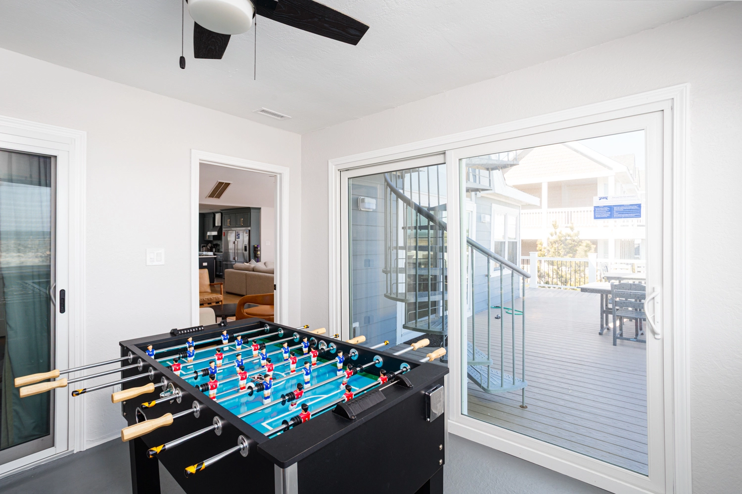 Great room; kitchen with induction stove, two ovens, and two refrigerators; dining area; rec room with arcade game and foosball, screened porch.