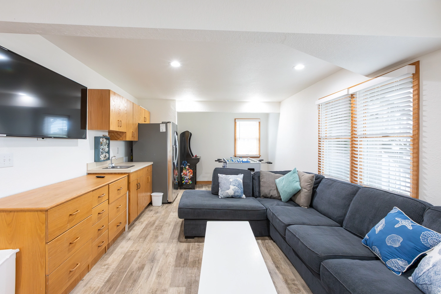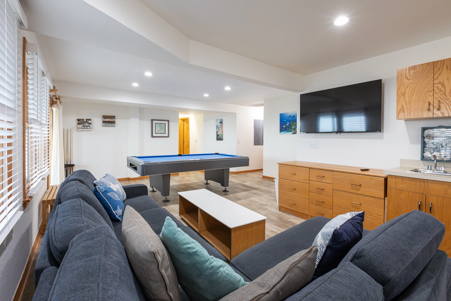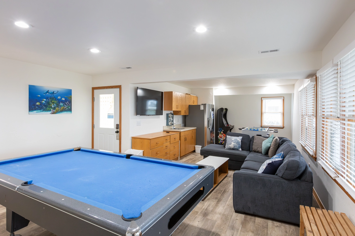 Rec room (QSS) with pool table, foosball and wet bar with refrigerator.
