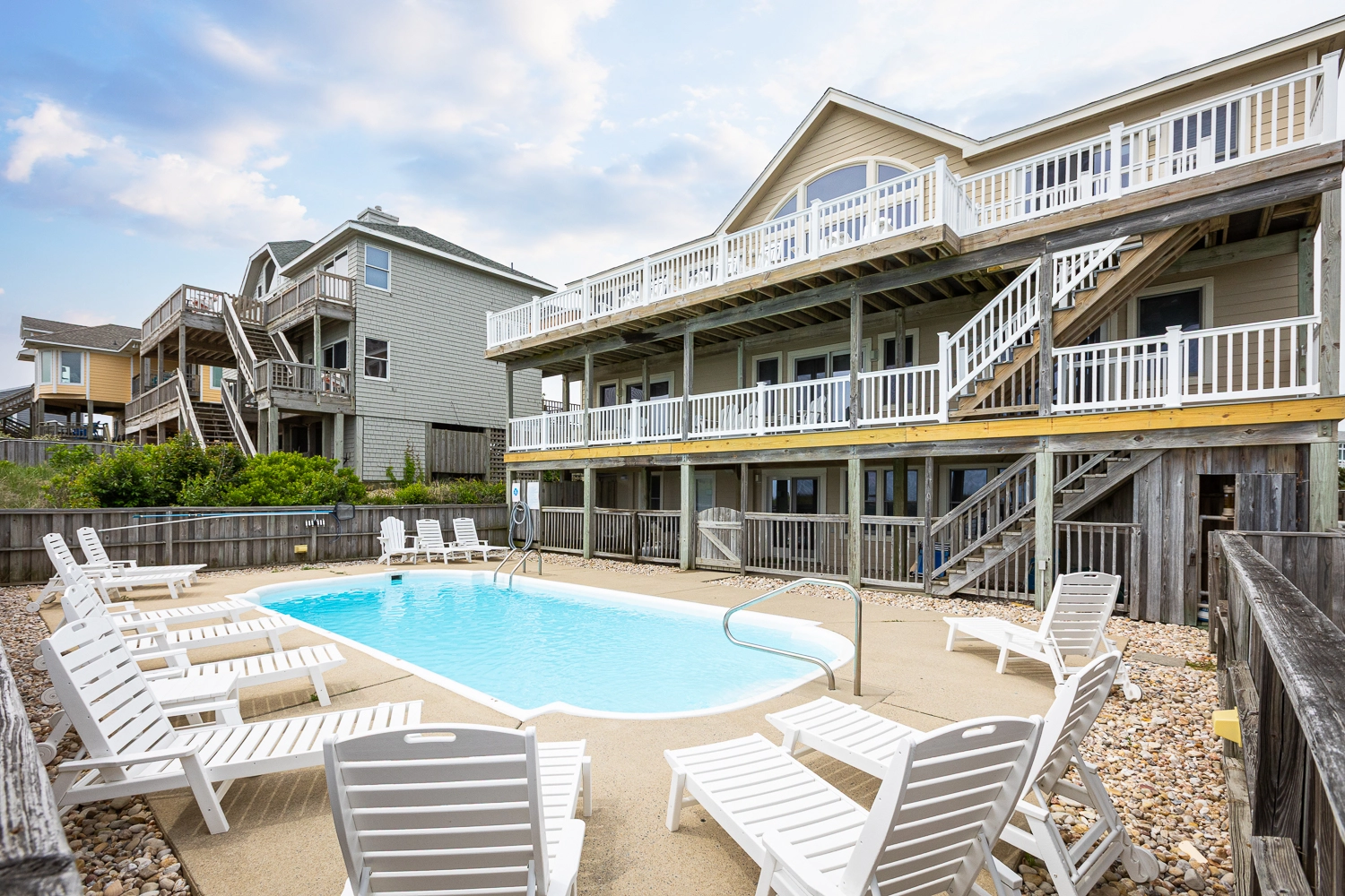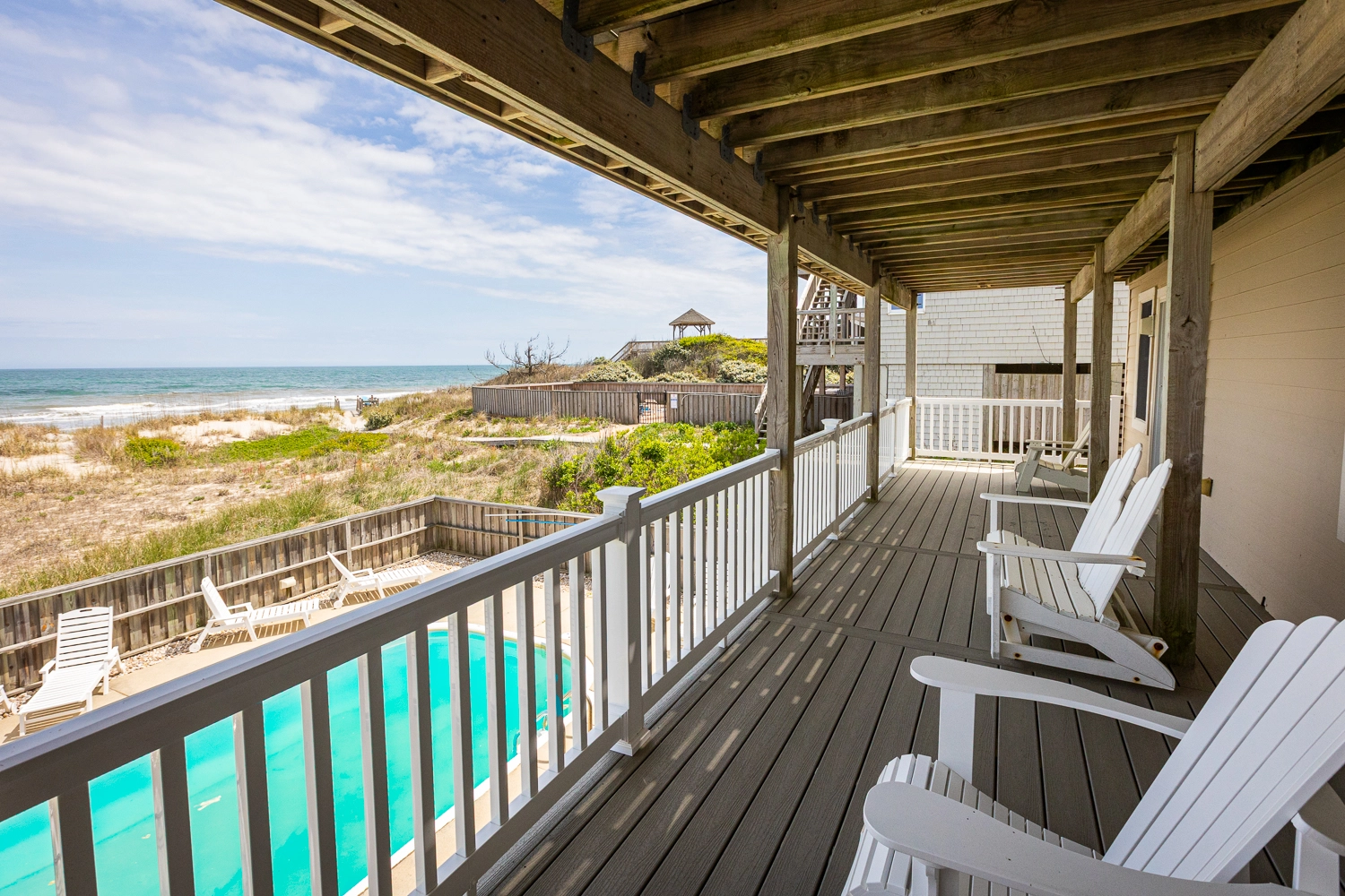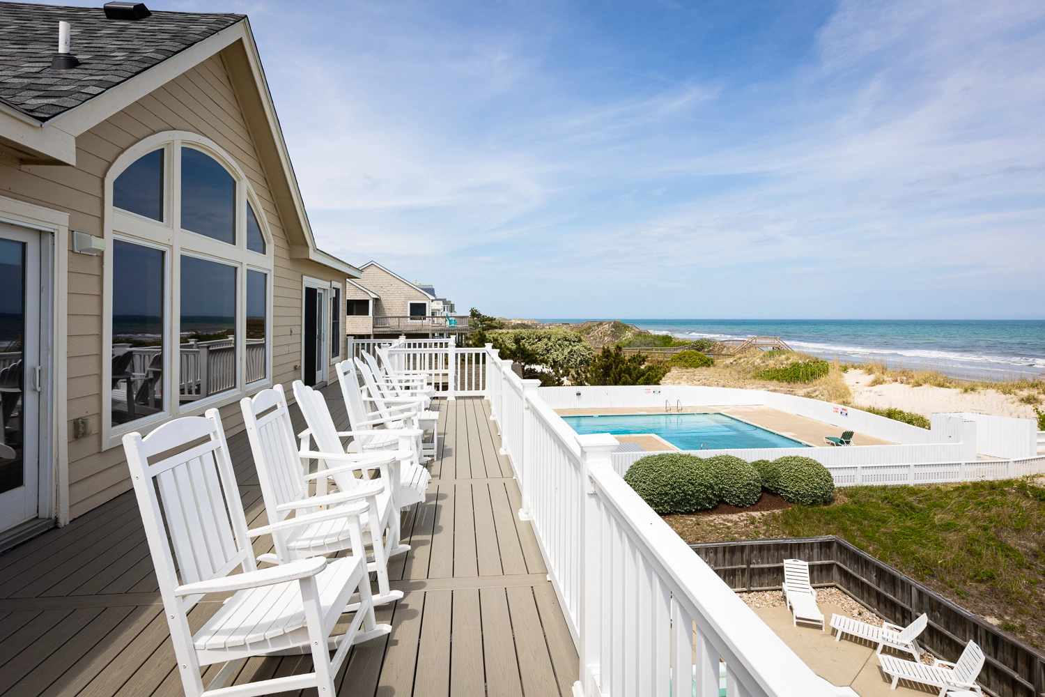 "Old Friends, New Friends is a HUGE house conveniently located near the public beach access. Its main level - up top - has amazing views of the ocean and dunes + an inviting kitchen island, a massive dining room table, three comfy sofas, and a dining nook perfect for card games. The middle level is a parade of bedrooms, three of which face the ocean. There are many decks and alcoves to strike up conversations and watch nature (in the back) or people watch (front). The pool is located right off the rec room and has many chairs to sun in. There is no shortage of parking and the grocery store is a short 6-7 mile trip. This was a great house to host family and friends in for a week."