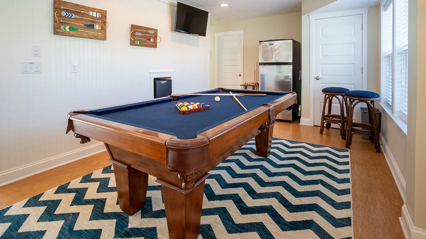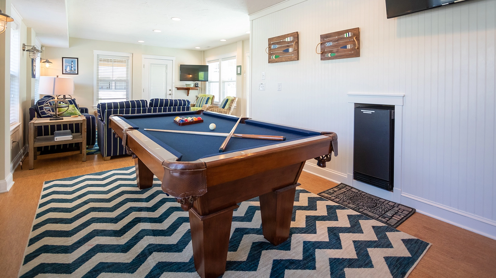 Rec room lounge with large TV, refrigerator, and pool table.