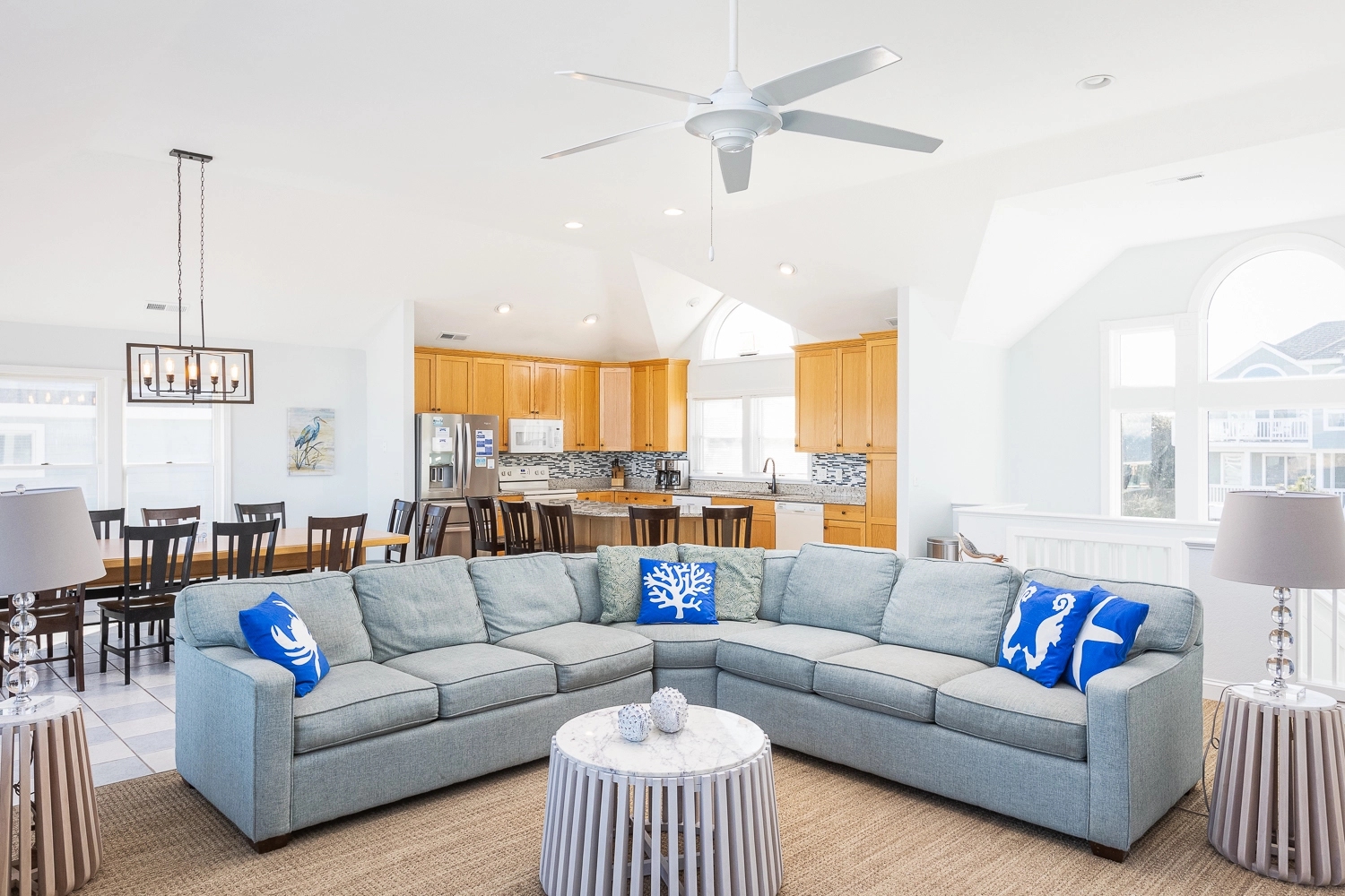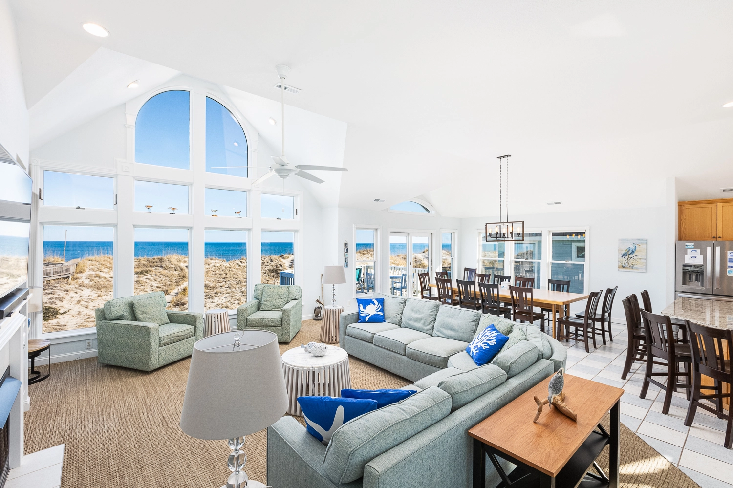 Great room; kitchen with 2 dishwashers; dining area; open decks.