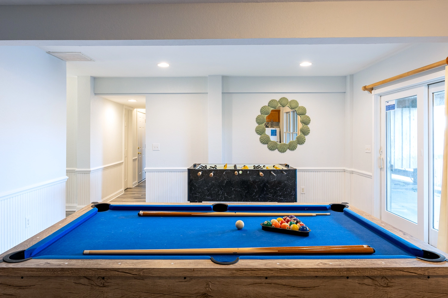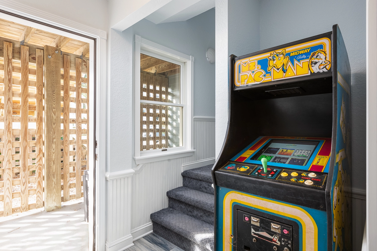 Rec Room with pool table, wet bar, and Pac-Man arcade game with 60+ games; laundry; patio with gated pool and hot tub; garage.