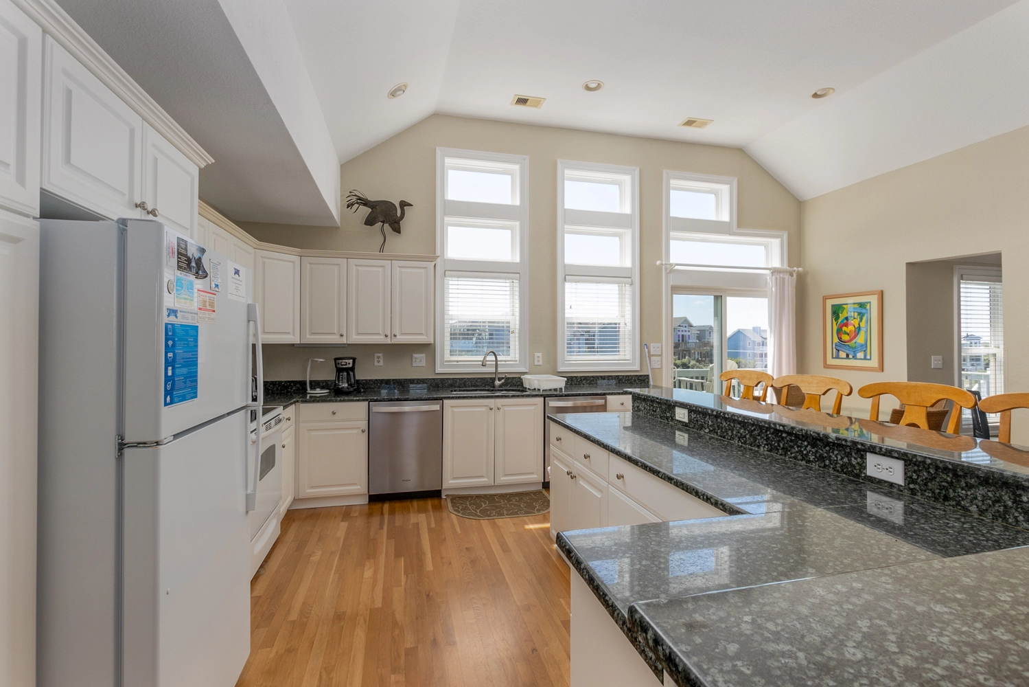 Great room with gas fireplace; kitchen with two dishwashers; dining room; wrap-around deck with views of the ocean, wildlife sanctuary and Currituck Lighthouse.