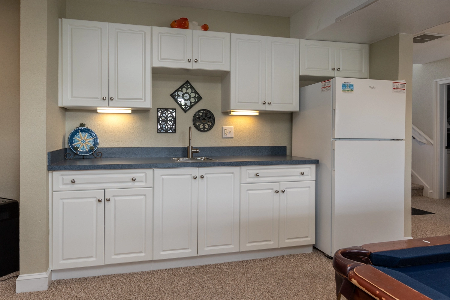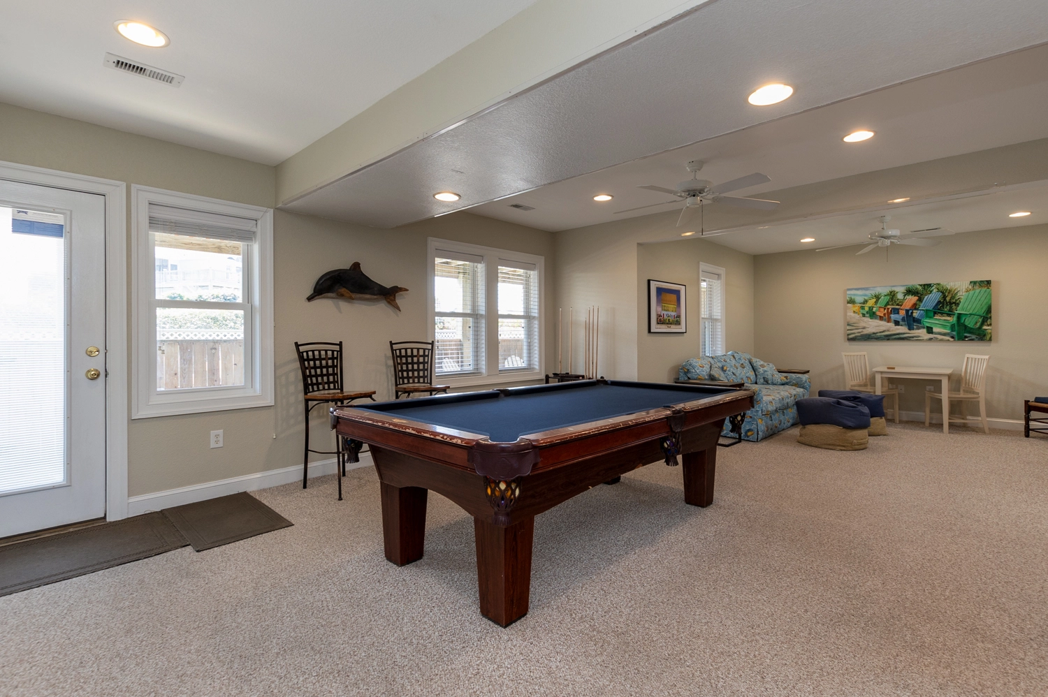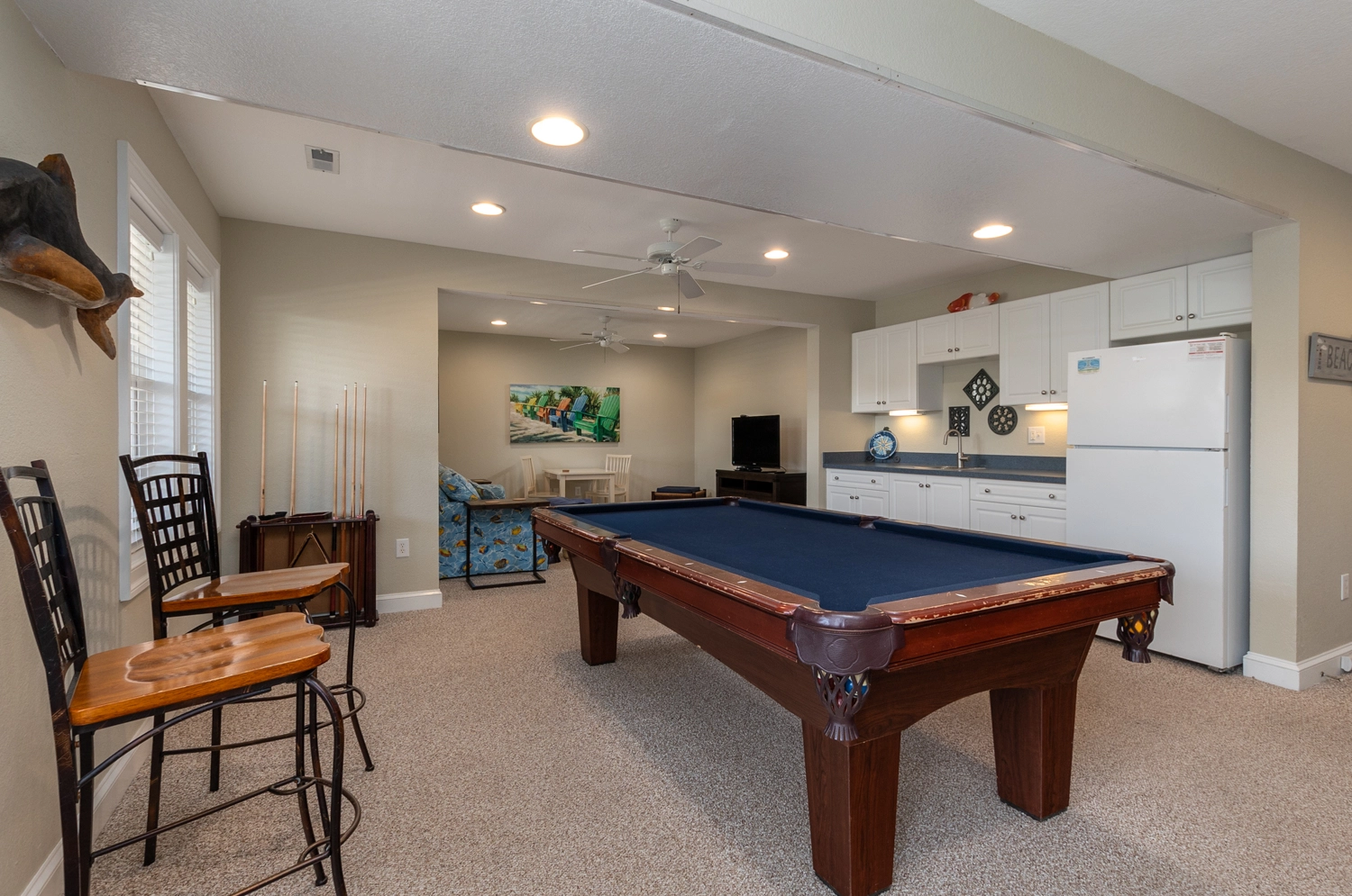 Rec room (QSS) with pool table, card table and kitchenette with refrigerator; access to the pool and hot tub; outdoor shower; foot wash; gas grill; parking.
