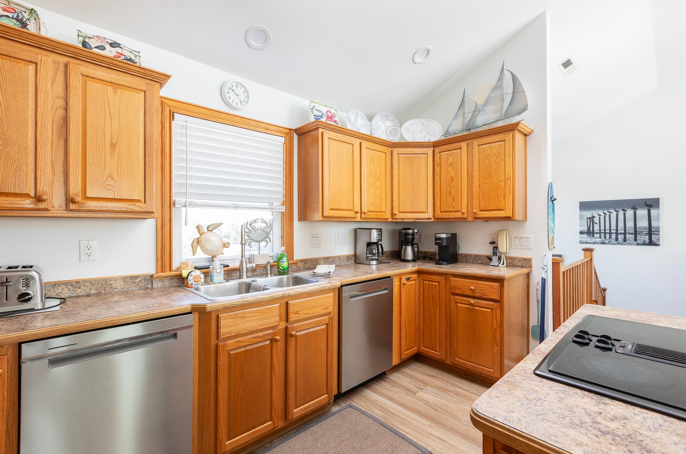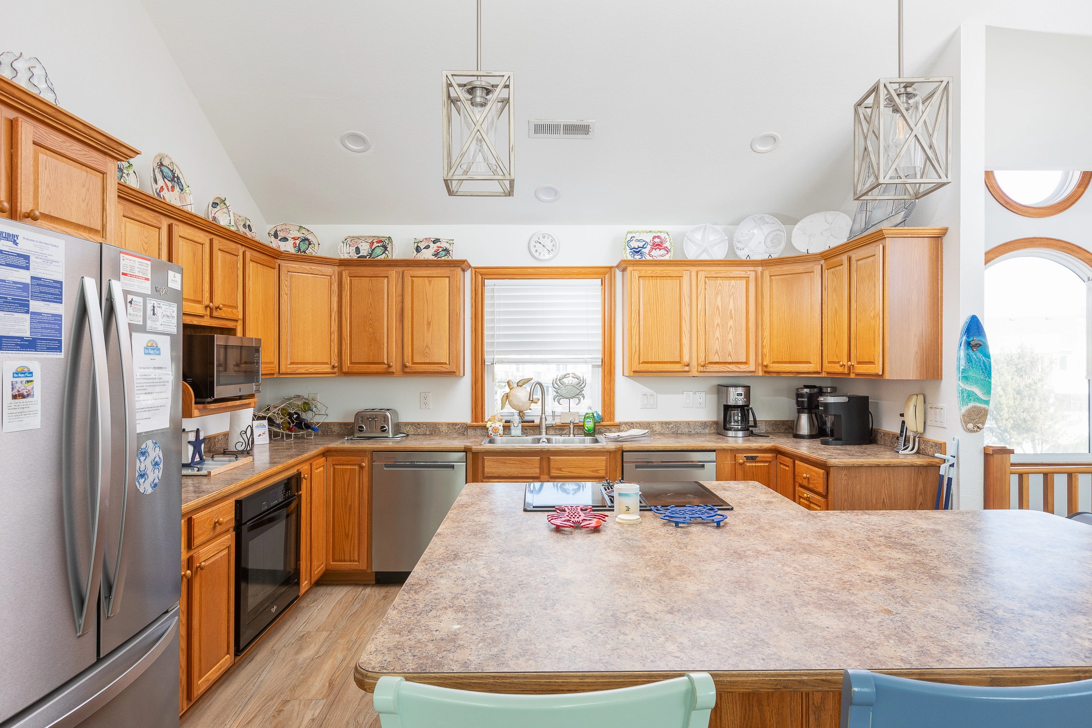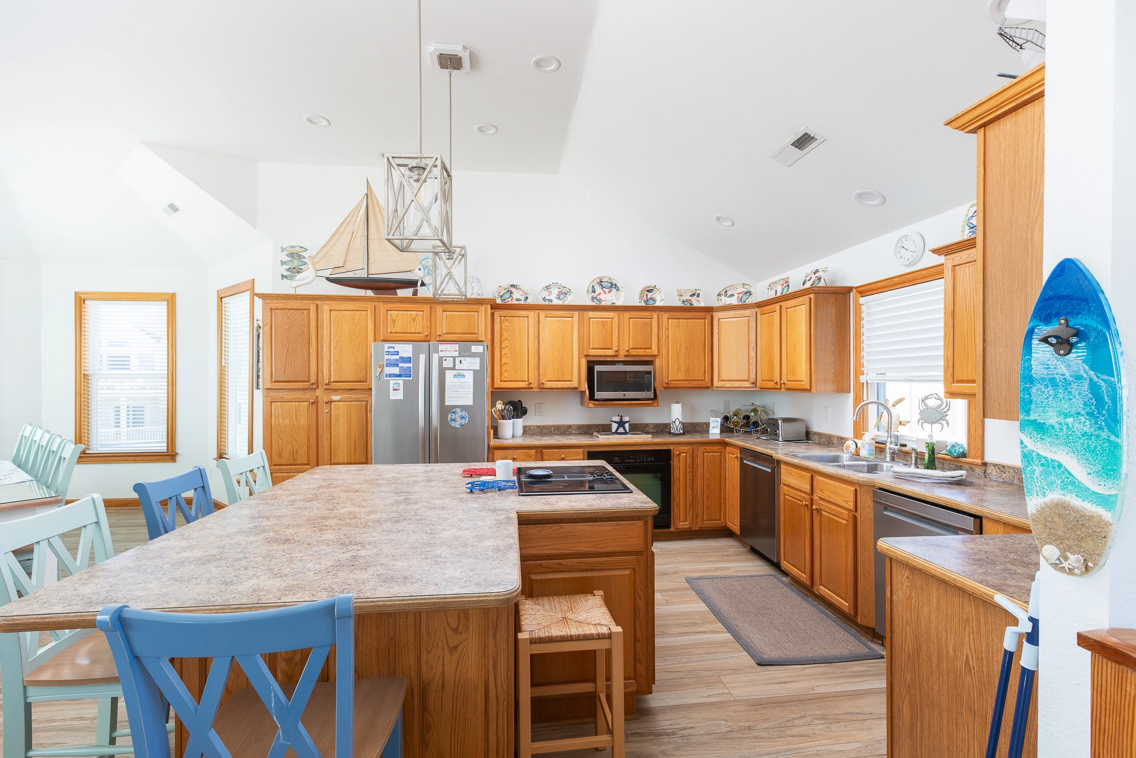 "Fully and well-equipped kitchen. Two dishwashers. An over-abundance of coffee cups, glassware, and dinnerware. A full-pot Keurig and a single-cup Keurig. Three crockpots. Private pool with a very nice under deck patio attached with picnic table and outdoor shower. Beach chairs to utilize, and nice, sturdy, outdoor furniture for just sitting and/or dining. Second deck porch swing and hammock. Second floor den area with fold-out couch. This house was perfect and so very well maintained. Also main floor washer and dryer and lower floor washer and dryer. So very nice for extra laundry, beach towels, etc. Basement den was so nice to be able to come in from off the beach, change clothes is you needed to, bring in groceries and luggage and gather everything together when we had to leave."