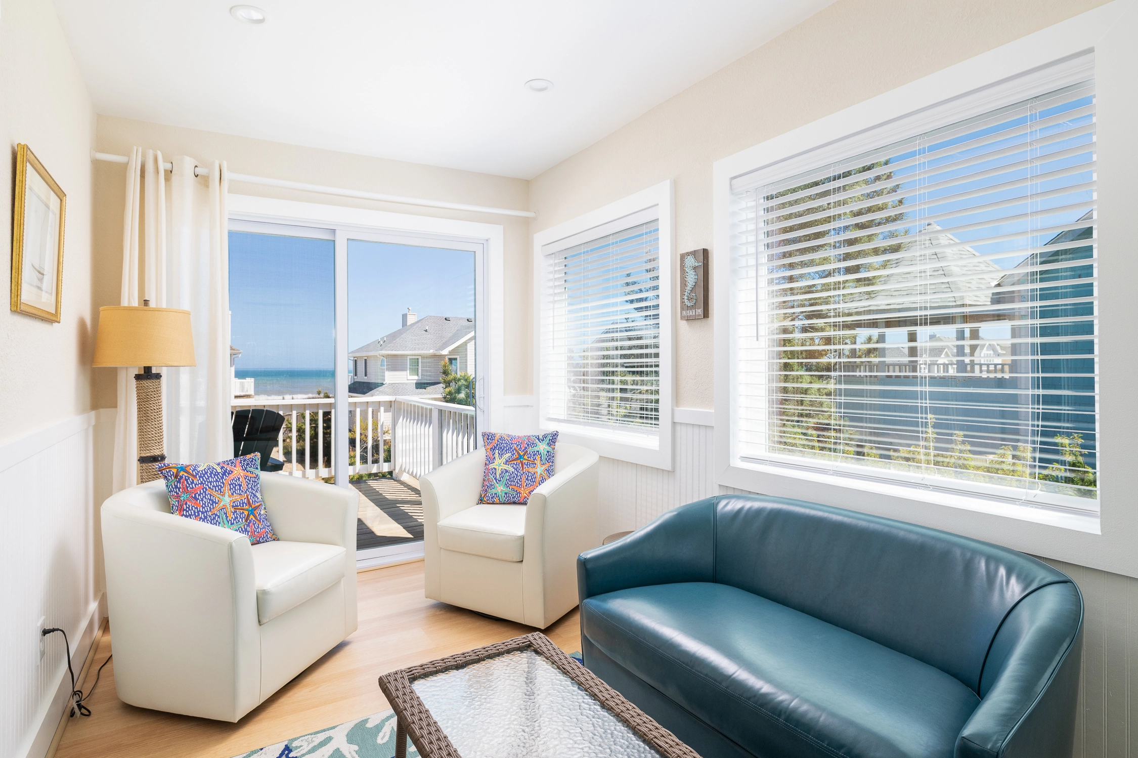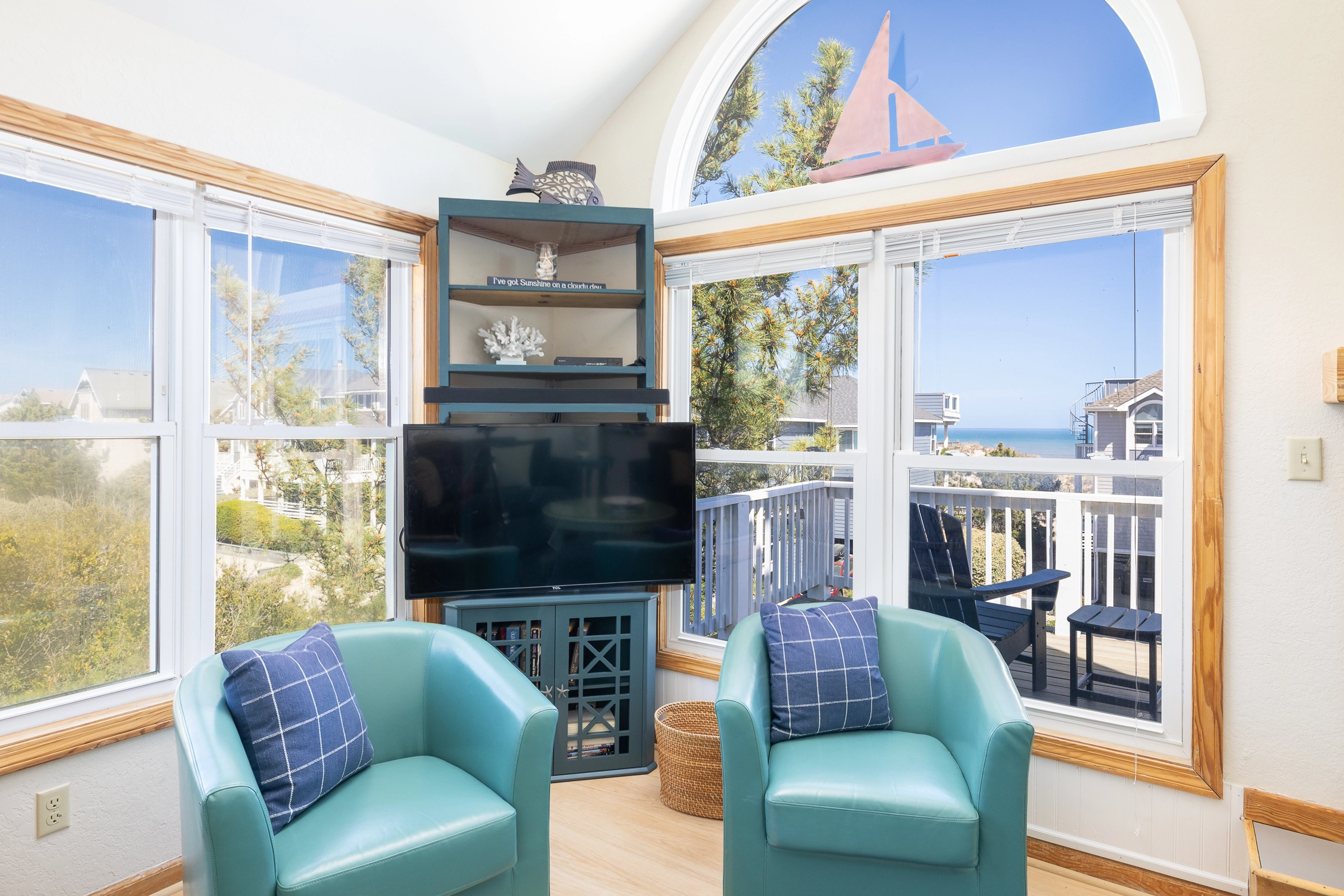 Loft/Den (QSS) with table and chairs, reading nook, foosball, and panoramic ocean, estuary and lighthouse views.