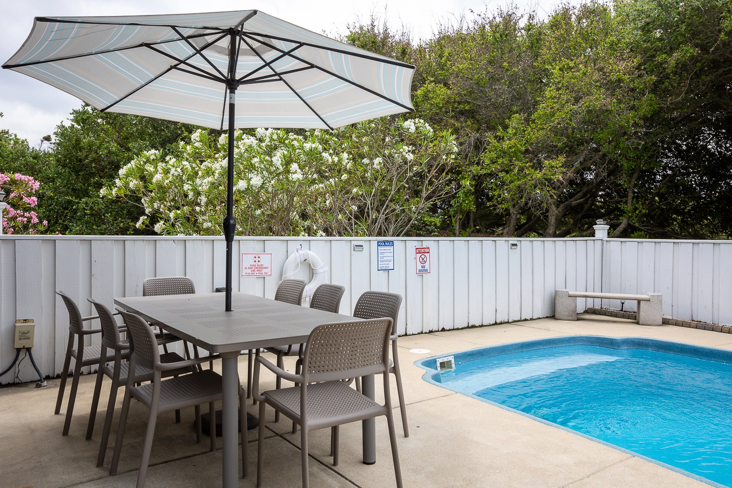 "The house was lovely and very well appointed. The access to the beach was easy and it is located at the quiet end of the beach. We went in the pool almost every day (the salt-water pool really eliminated the chlorine smell). The beach toys were great and the cart in the garage were a God-send for getting our tent down to the beach. I went running down the 4X4 every morning and got to see the wild horses one morning. Thank you for providing a wonderful vacation home for our family"