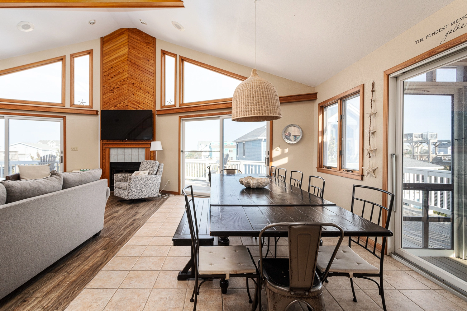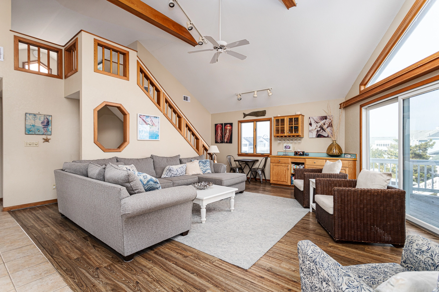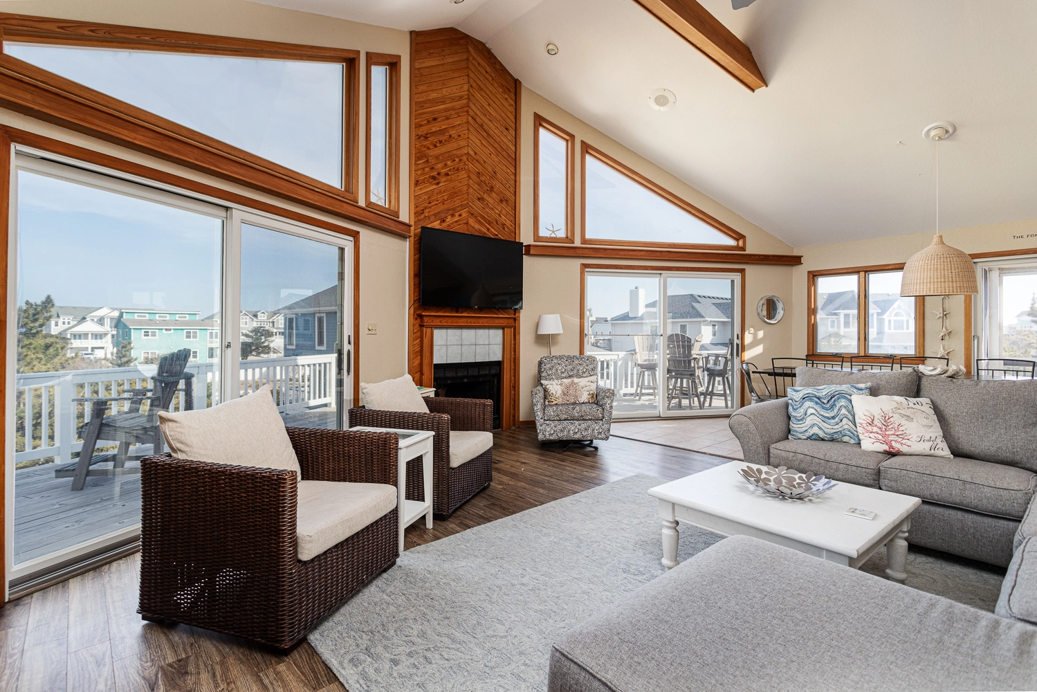 Great room with wet bar; kitchen with dining for 15; dining area; screened porch, open decks with ocean views.