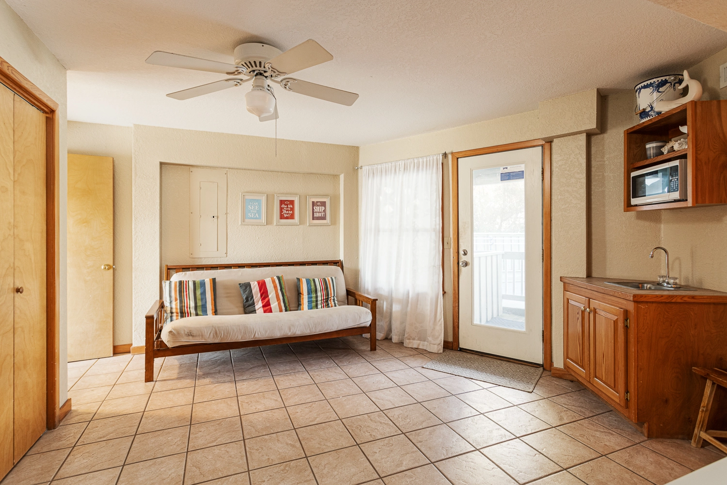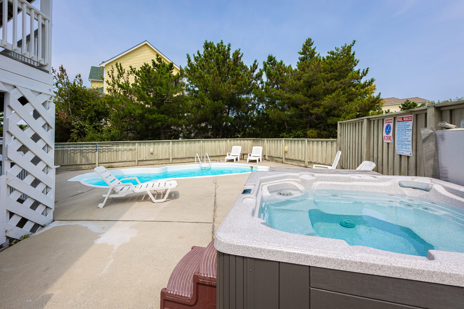 Private den with Futon and full-size refrigerator; laundry; covered patio with pool and hot tub.
