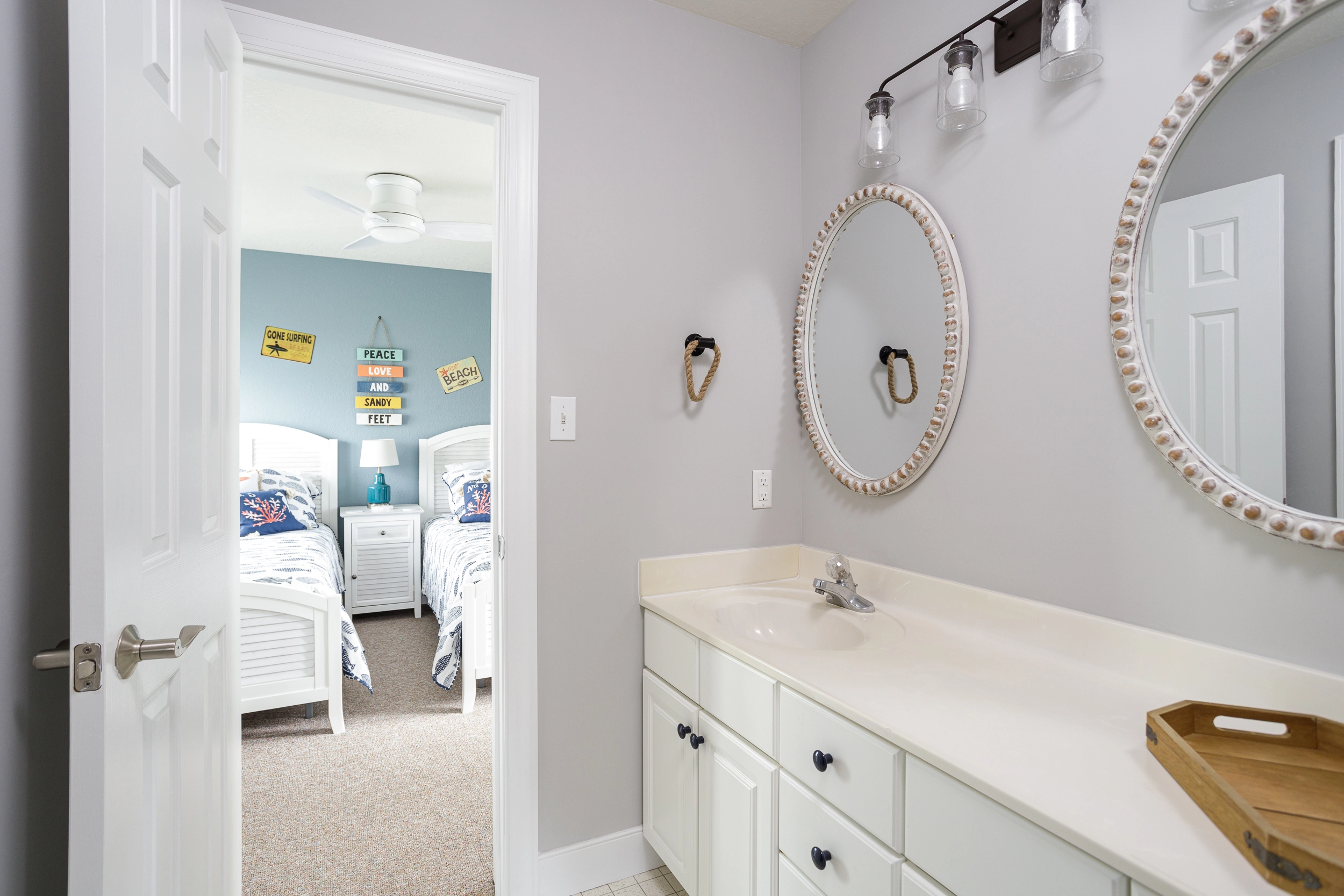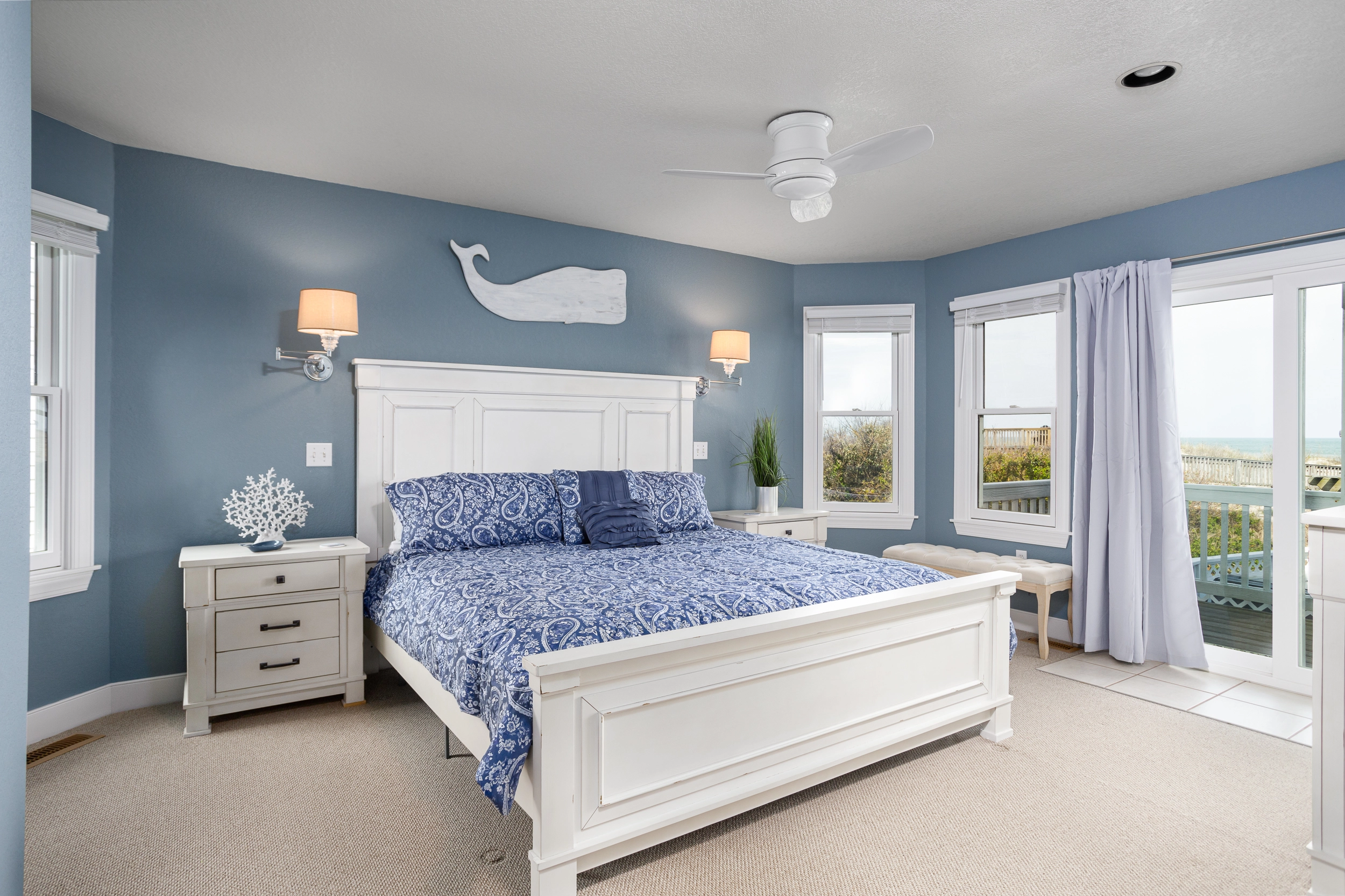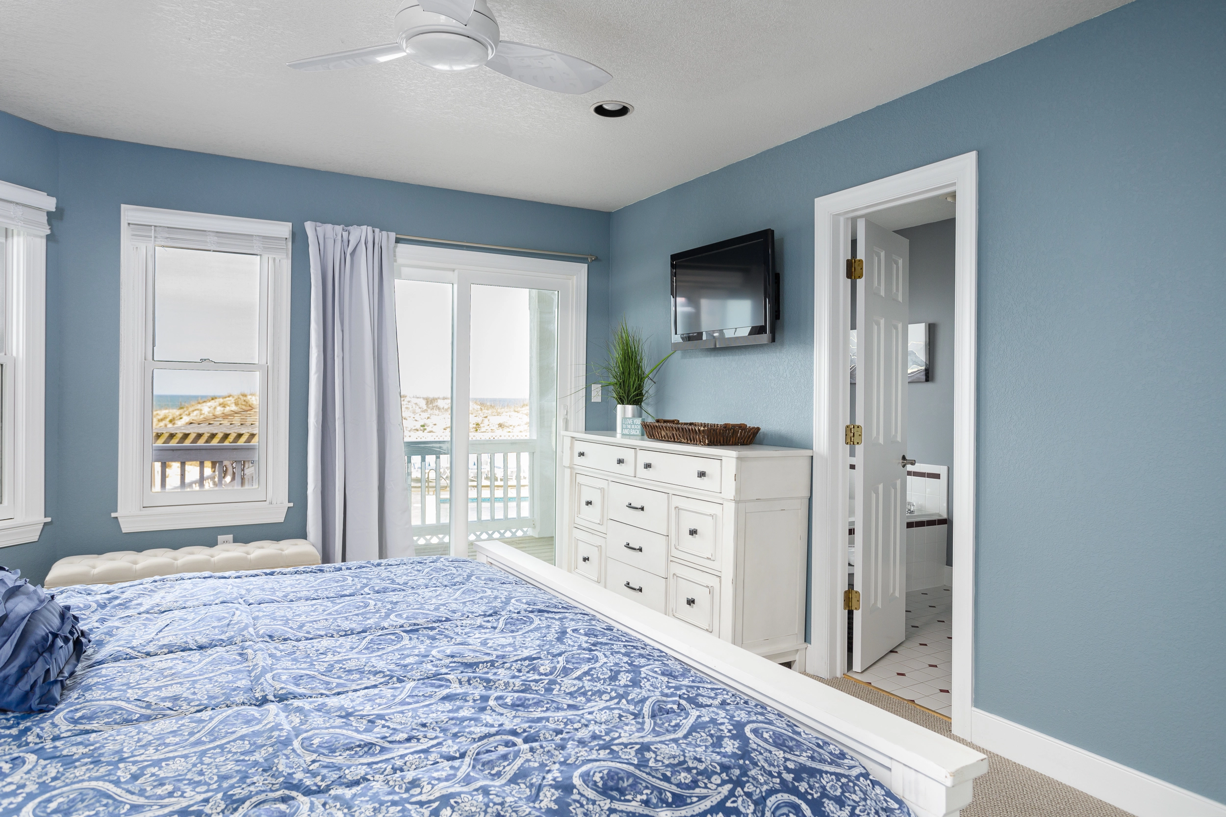 "Beautiful ocean view and great access to the spacious, sandy beach area. We enjoyed the pool and hot tub, outdoor tv and bar, cornhole and ping pong. The appliances are well maintained and the house is thoughtfully decorated throughout. We loved the themed bedrooms. The upstairs area was ideal for hanging out and making meals together. Slow Down Summer is now on our family playlist!"