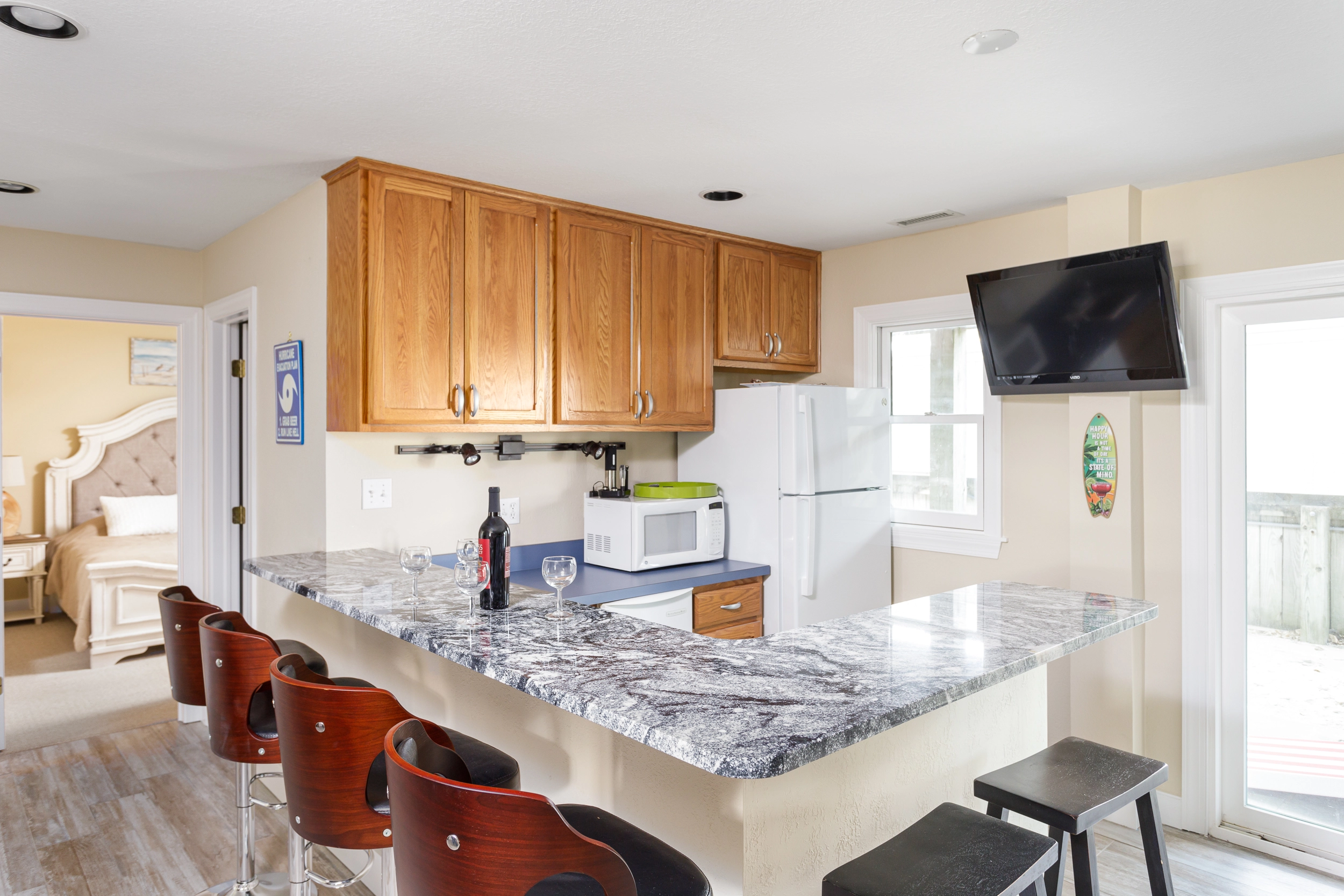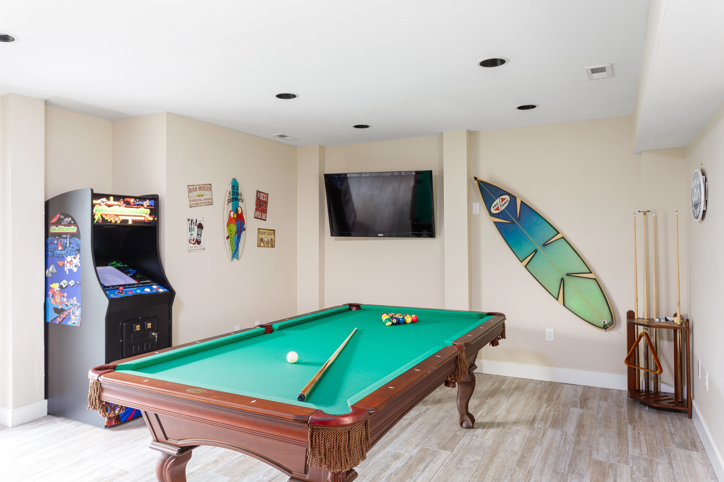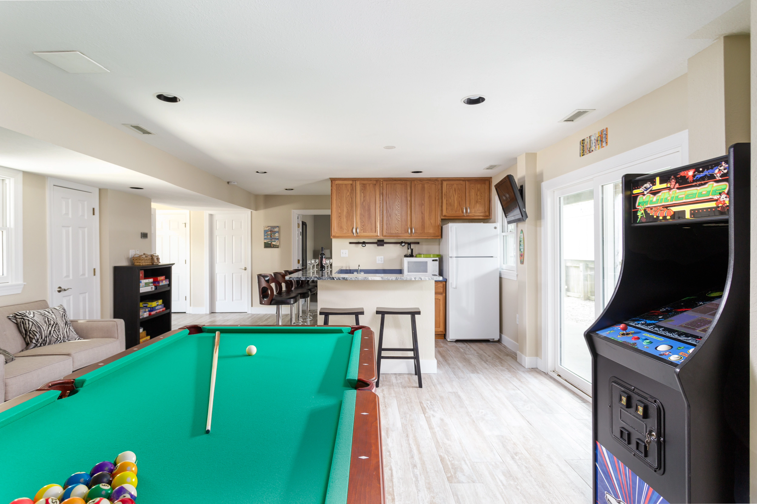Rec room with pool table, wet bar and refrigerator.