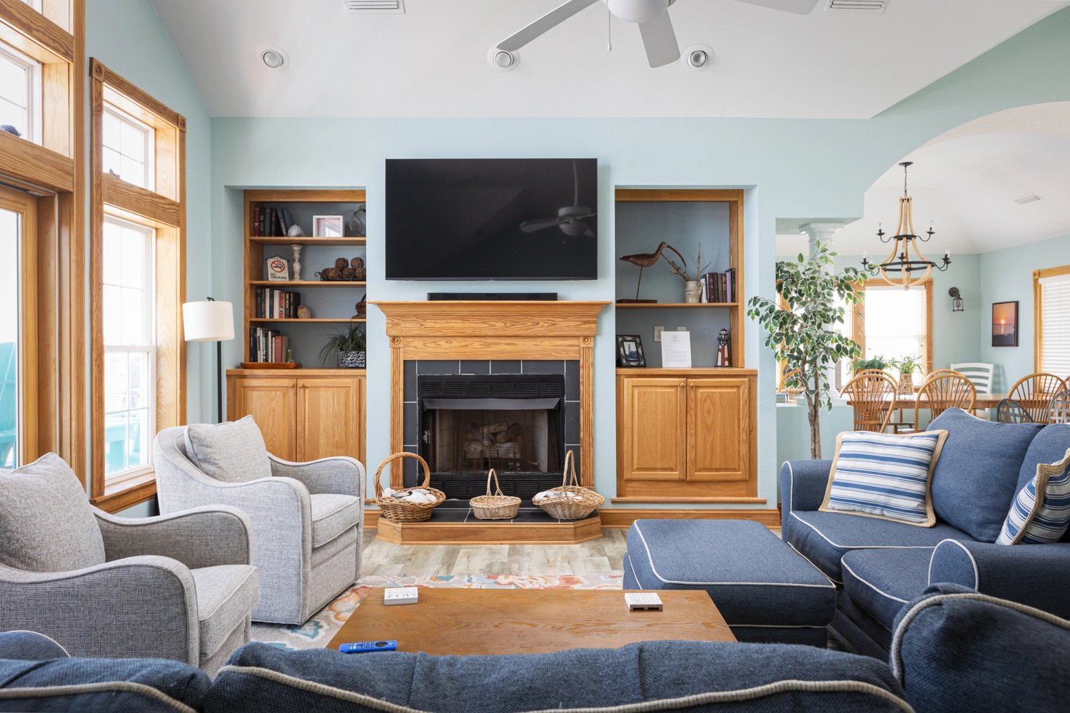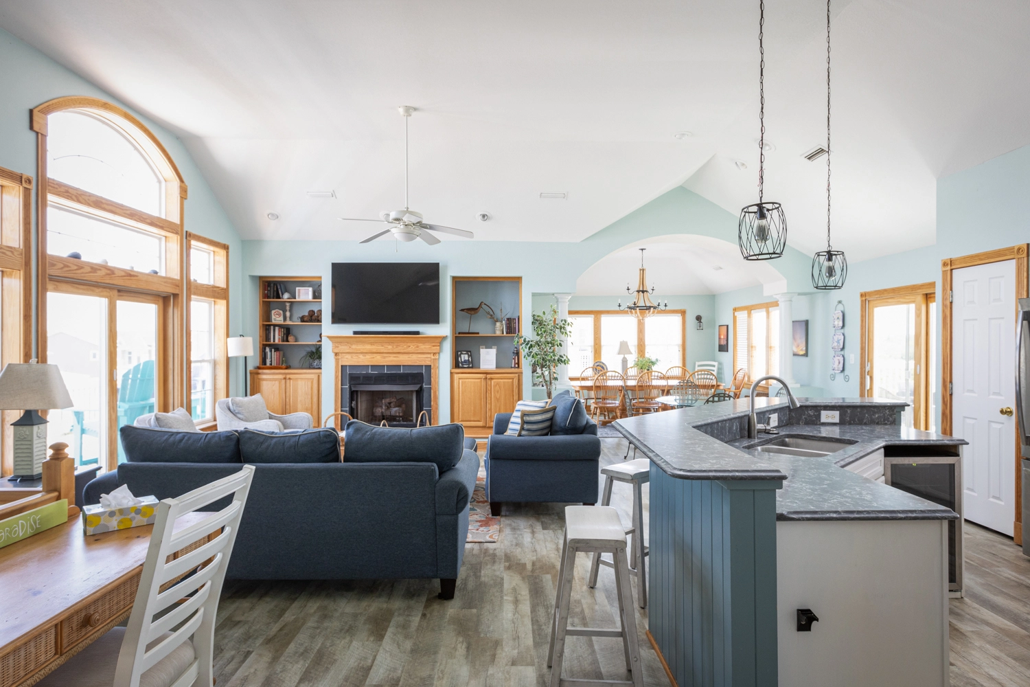 Vaulted living area with open kitchen and bar area; great room with surround sound and gas fireplace; breakfast and formal dining areas seat 16; front and back decks with arbor and dining. Enjoy morning coffee and sunrise on front, sunset dining on back.