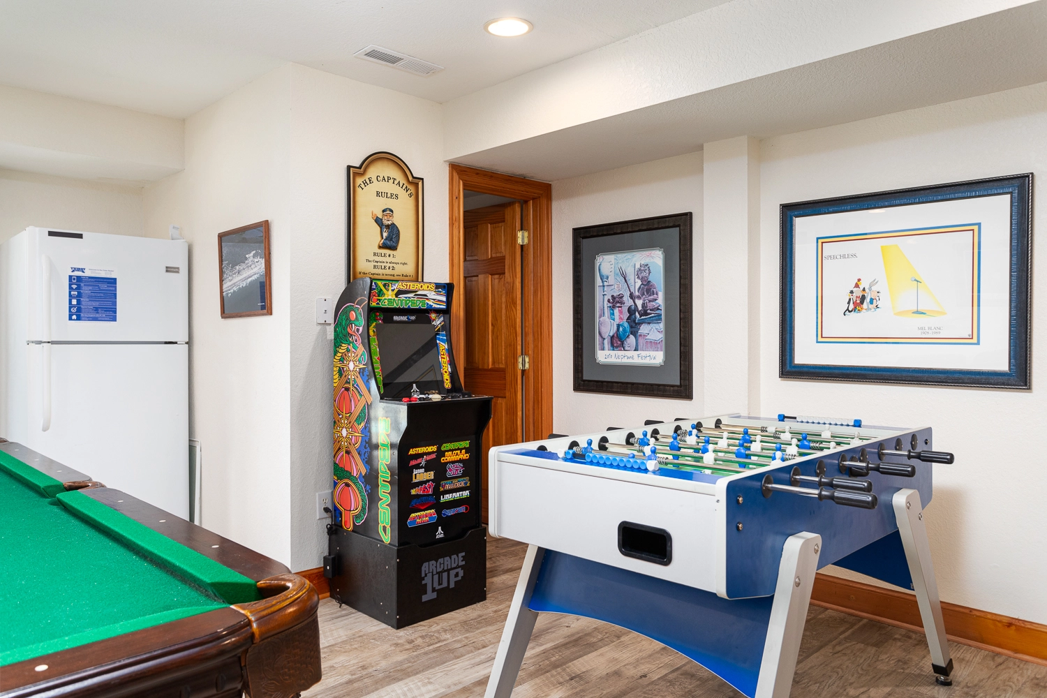 Rec room with pool table, foosball and kitchenette.