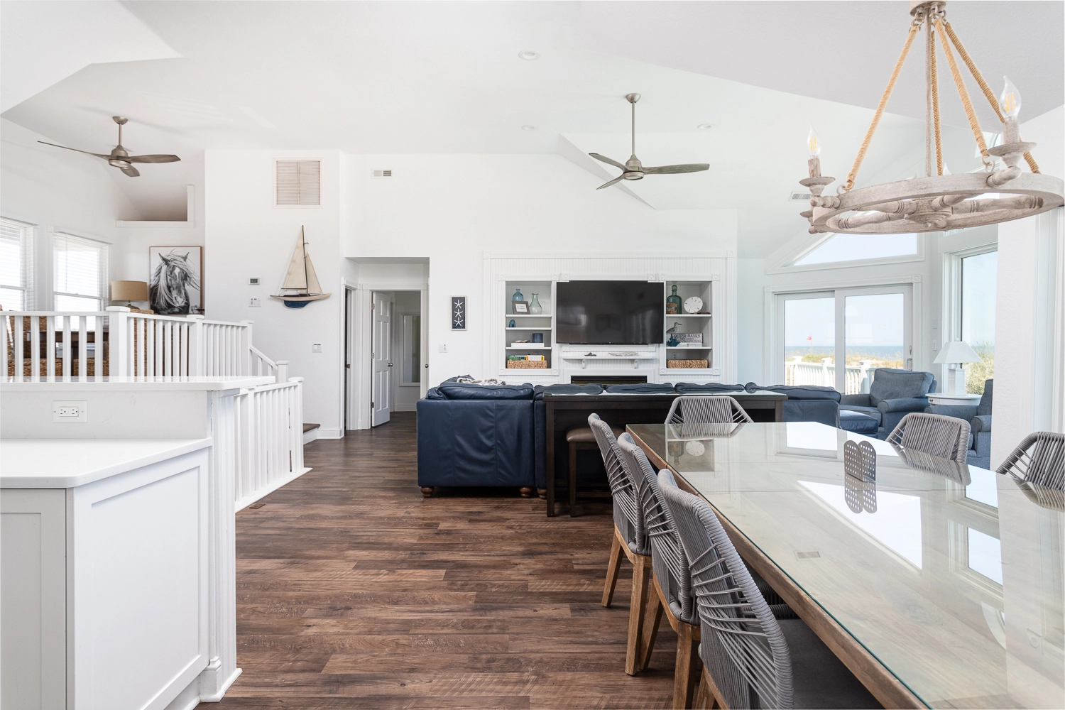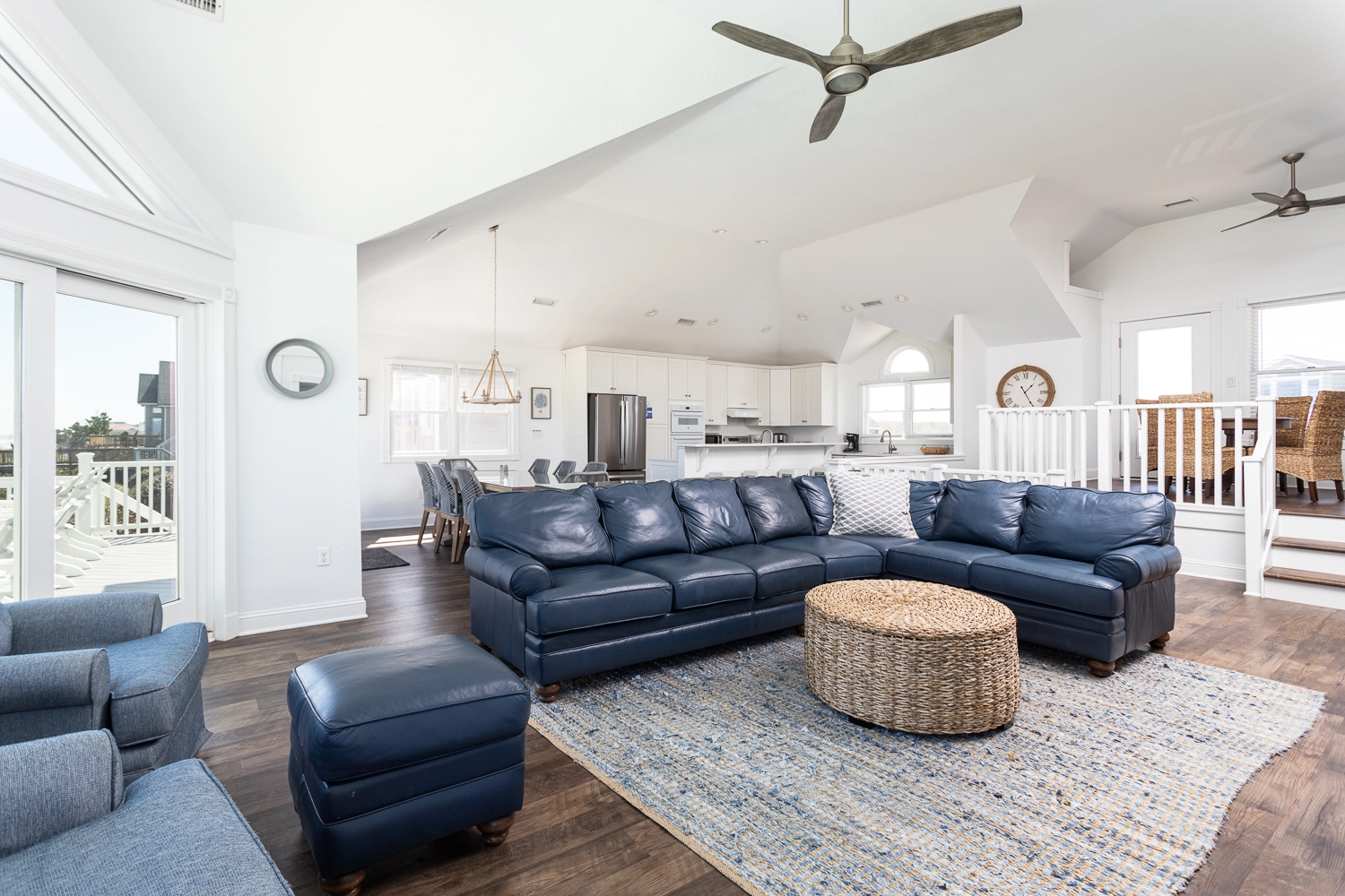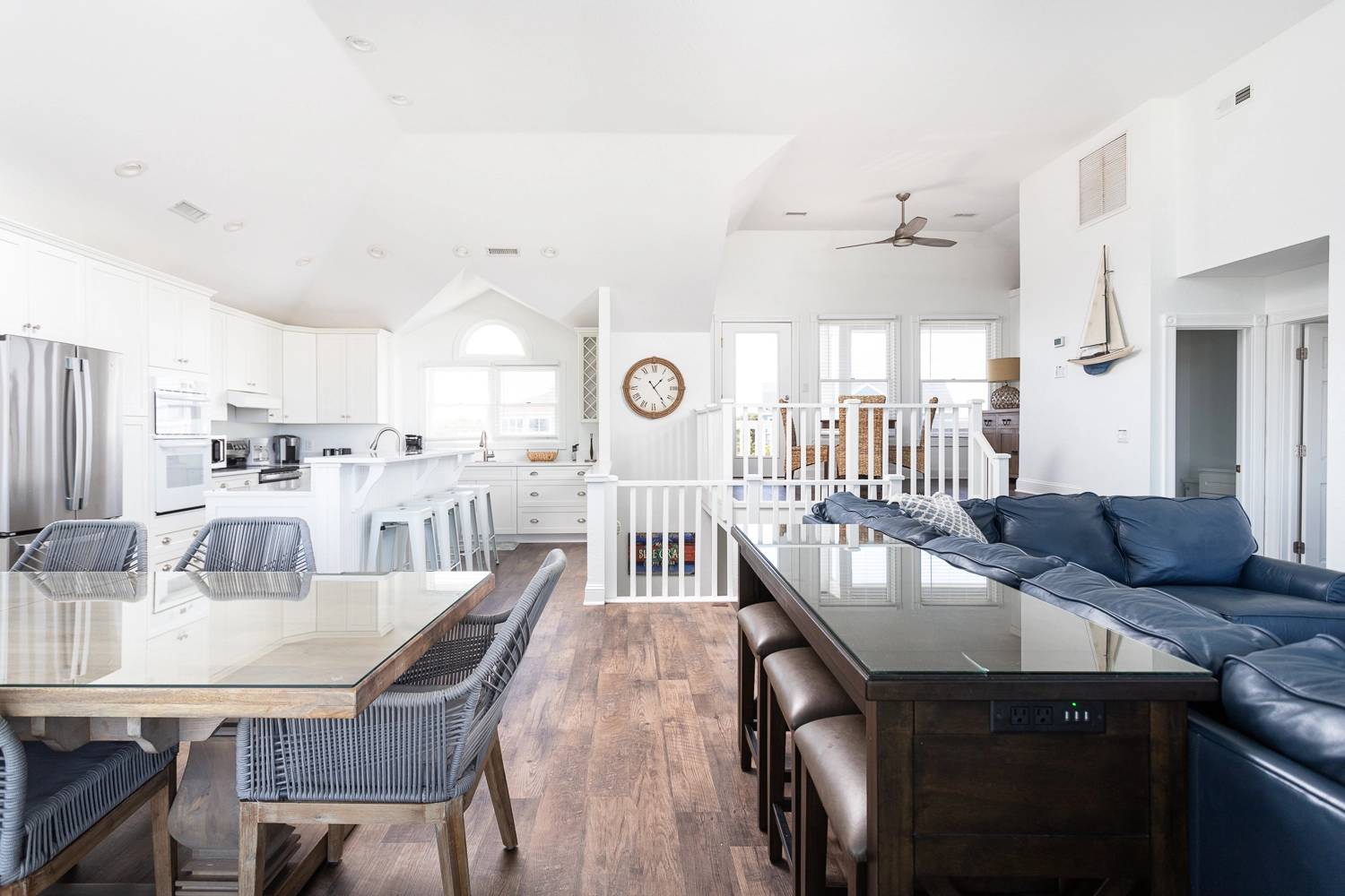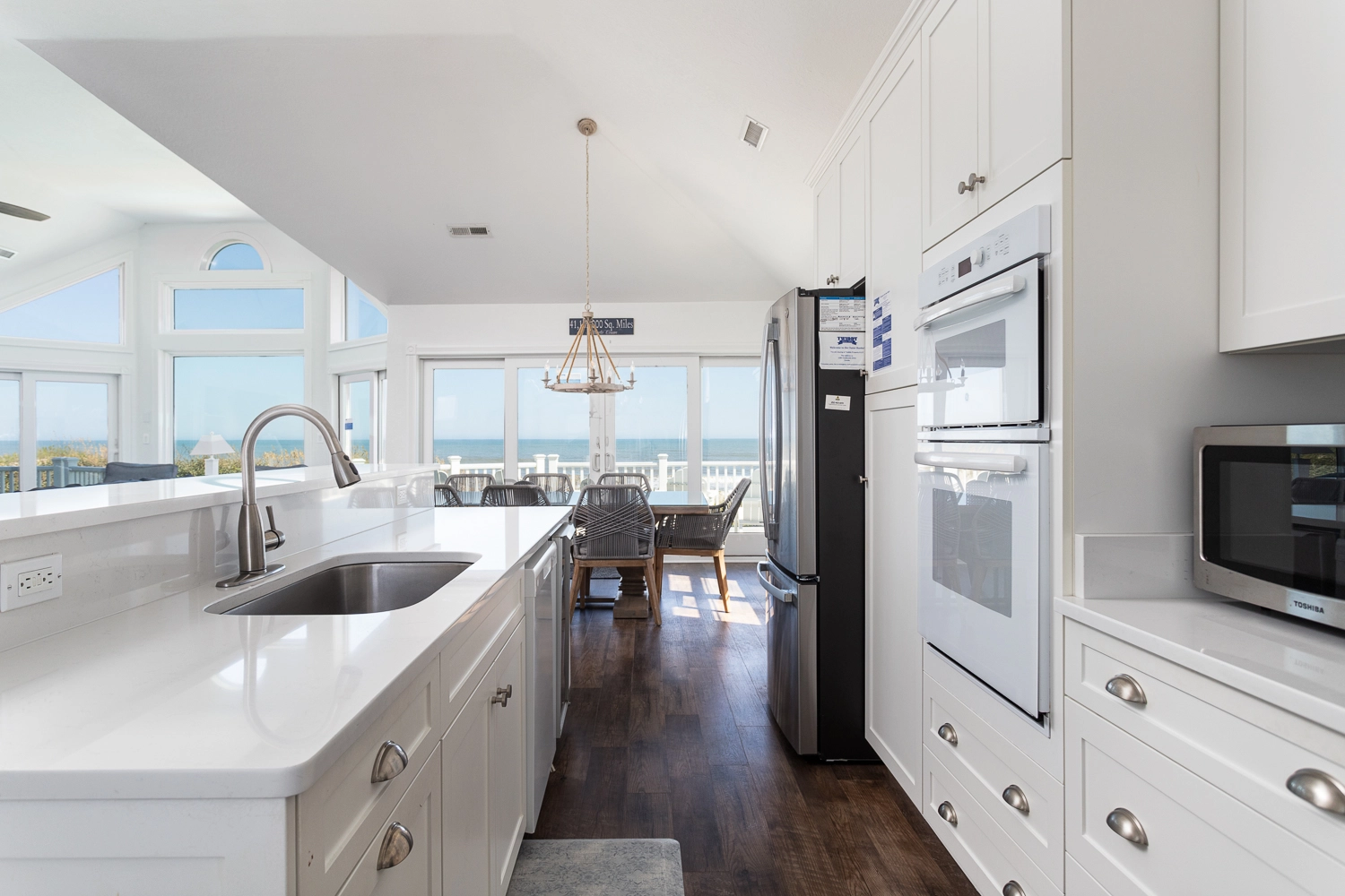 Great room with ocean views, kitchen equipped with two dishwashers, two sinks, two ovens, two microwaves and a free standing ice maker, dining area; ship's watch; covered porch with view of sunset on the sound; large gathering deck with ocean views.