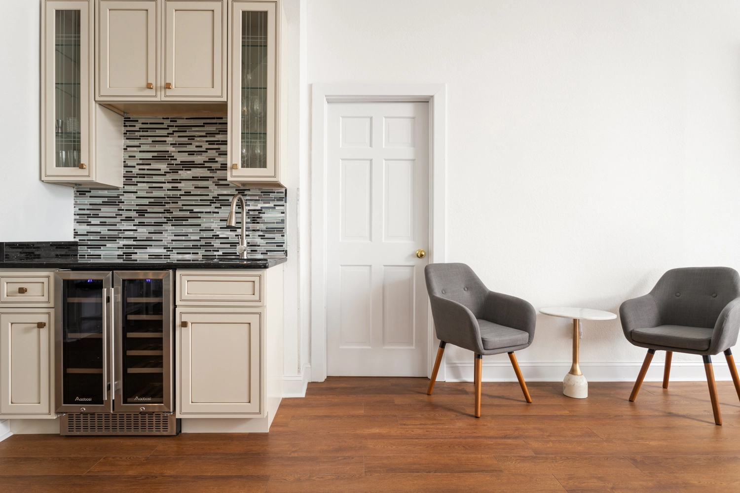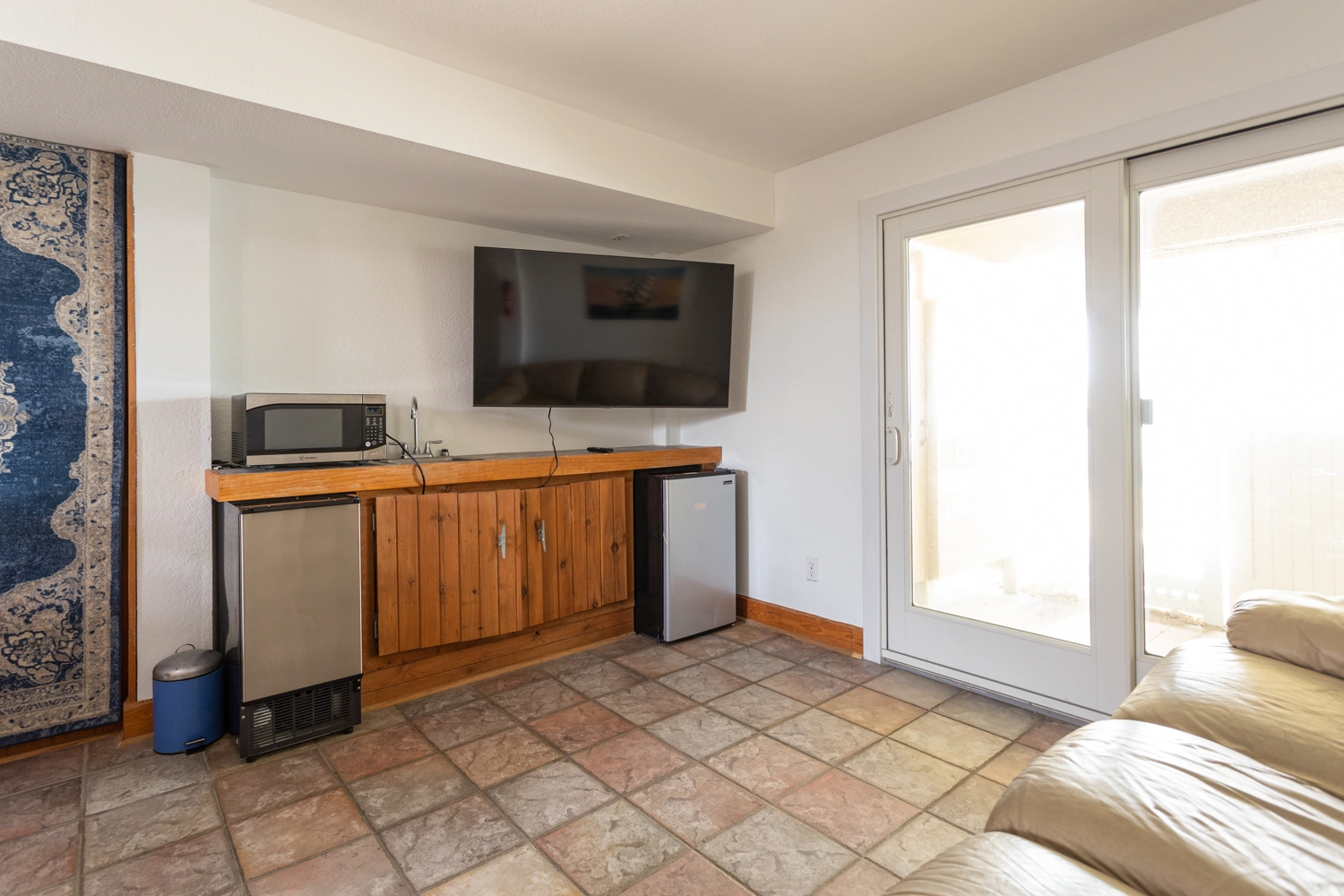 Rec room with foosball table and wet bar with beverage refrigerator.