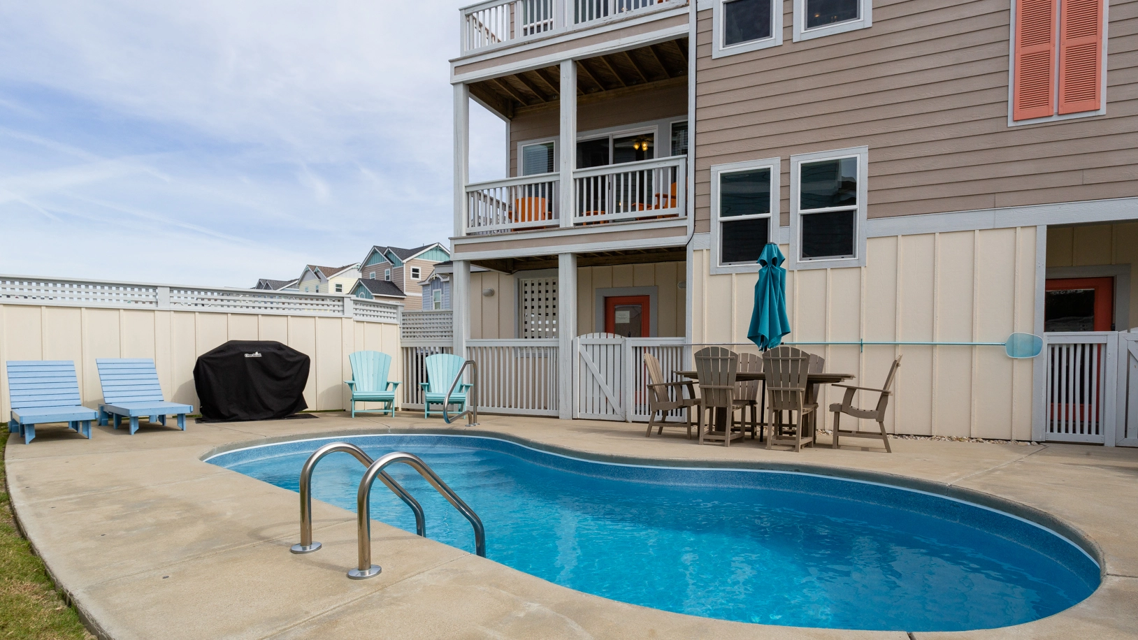 "Nice home. We had 4 people and it was very comfortable. We liked the pool. The beds are extra firm, which we liked. Walk to the beach was on a boardwalk, which made it aan easy hike. The owner provided beach chairs and umbrellas and wagons to carry them to the beach."