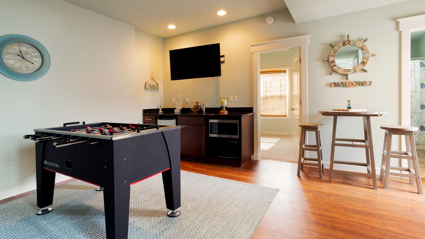 Rec room (QSS) with foosball, wet bar with beverage refrigerator and microwave; garage.
