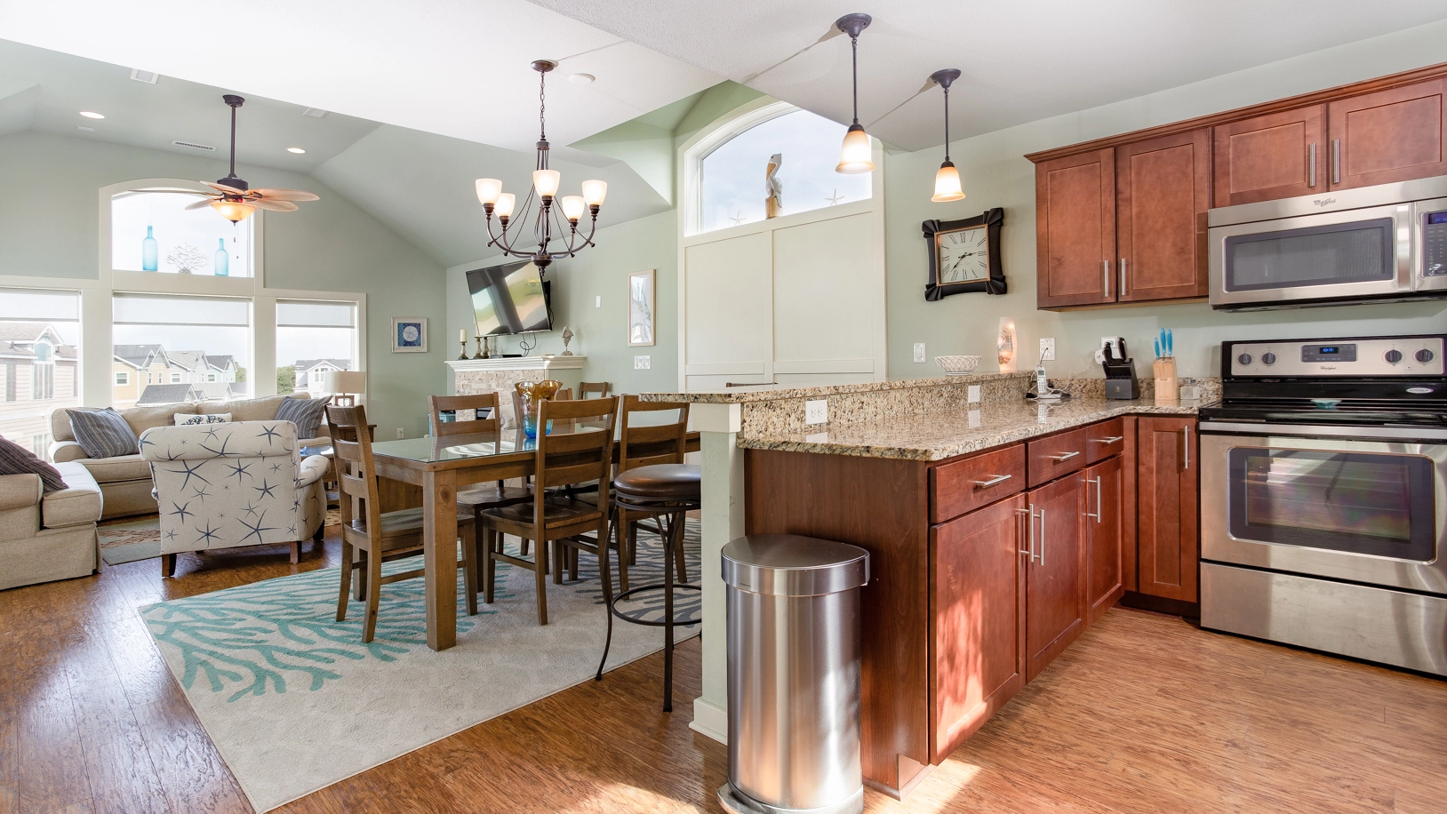 Great room with electric fireplace; kitchen; dining area.