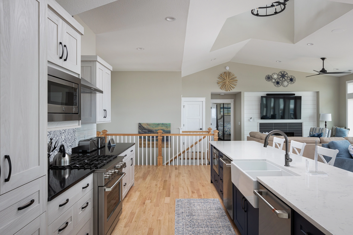 Great room with electric fireplace; kitchen with two refrigerators and two dishwashers; dining area.