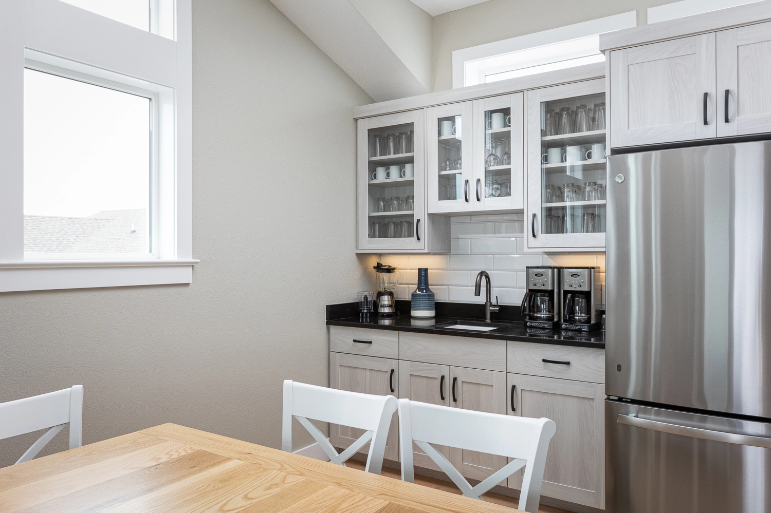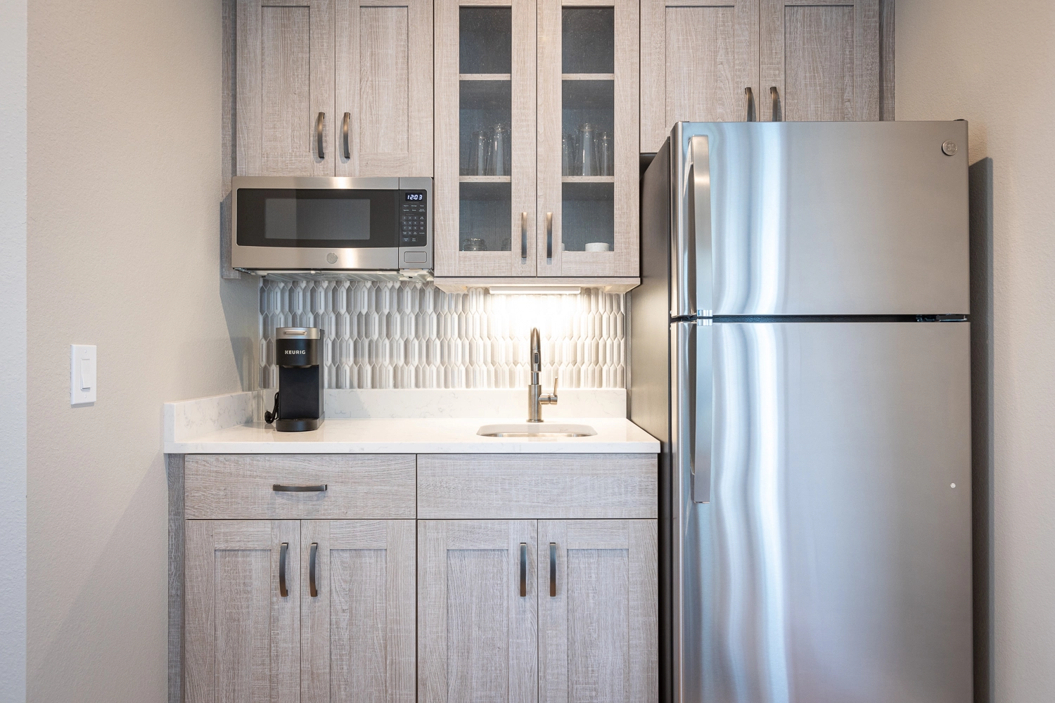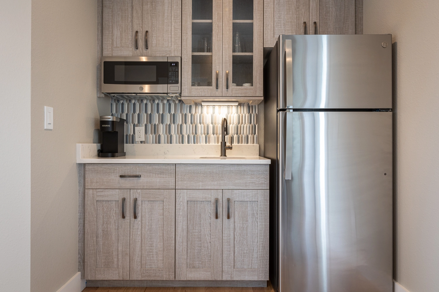 Sitting area with wet bar and refrigerator.