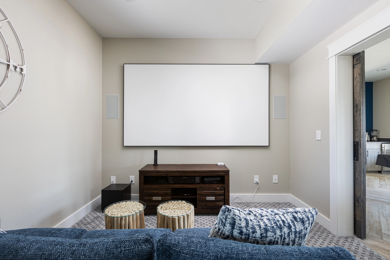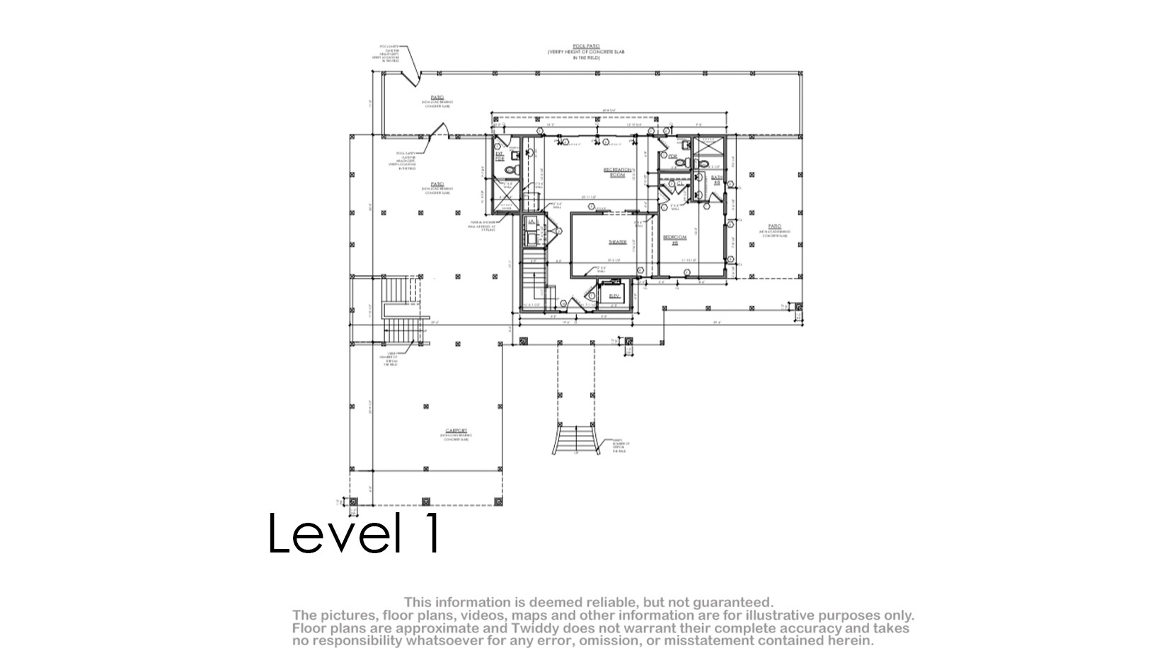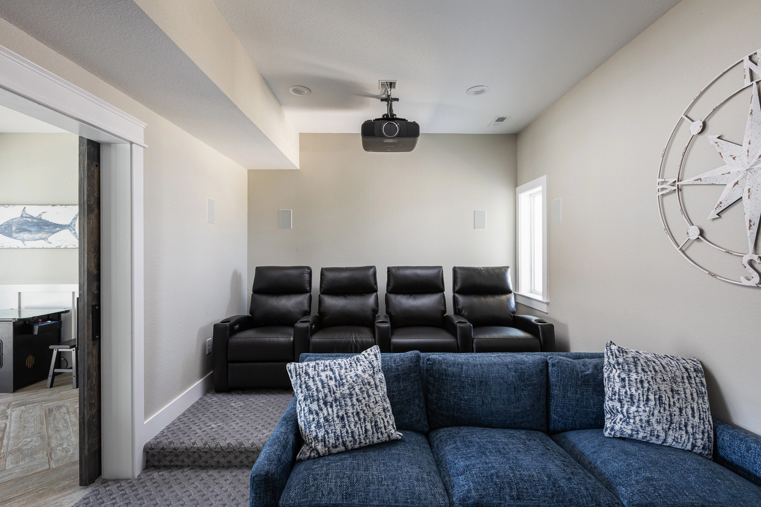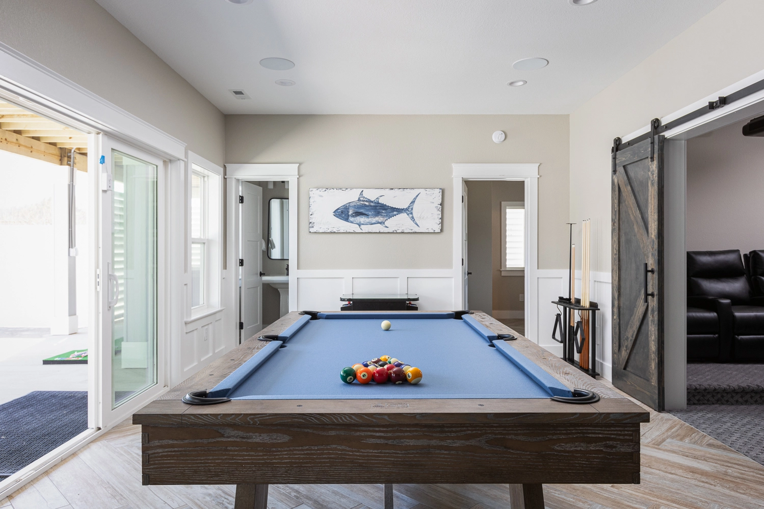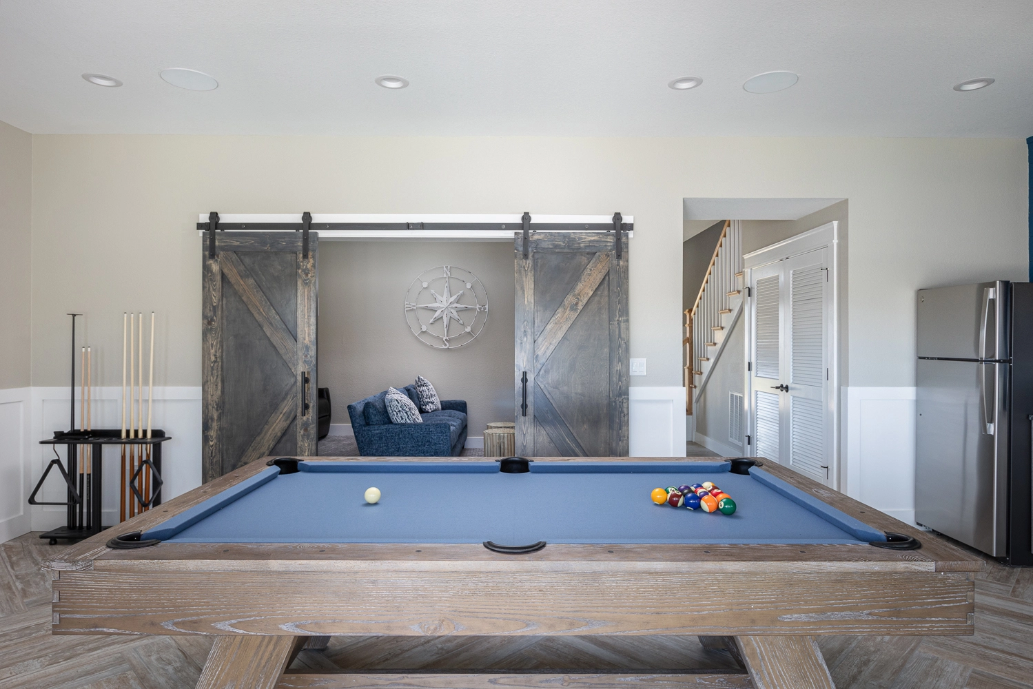 Theater room; rec room with pool table, card table, arcade, and kitchenette with refrigerator; laundry.