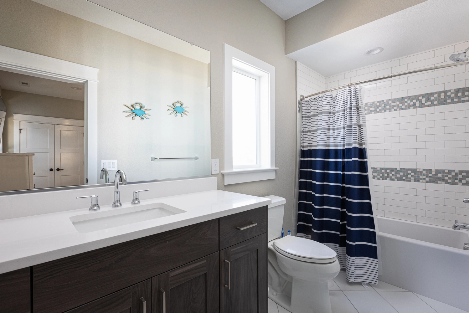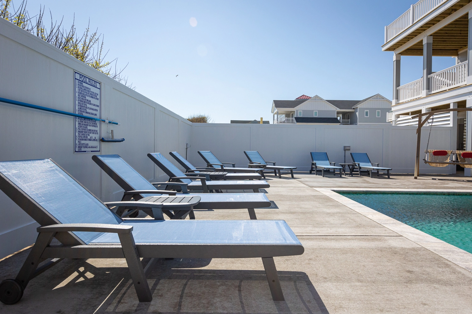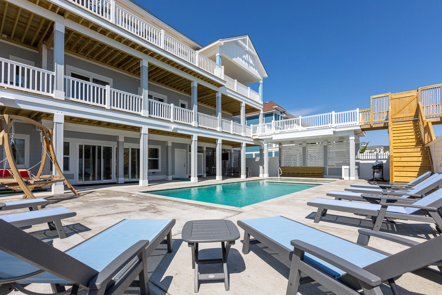 "The house was beautiful and checking in was so nice and easy. The bathrooms were all custom and a nice modern style. The designer did a nice job on the furniture and décor. The kitchen was fully stocked with cooking and baking hardware. The beds ands pillows were comfortable. The guest house was a nice feature. We had small children with us. They went to sleep early in the guest house, while we stayed up and didn't have to worry about being quite. The outdoor living space was awesome. There was an outdoor sitting area with a TV which was a great feature. We loved the pool with the water fall and the shallow area for the babies was great. All around great house. All the electronics: TV's, movie room, and speakers were easy to use. The only complaint is there was no outside steps going from the 2nd floor to the inside of the house. So if you came off the beach to get to the 3rd floor or the guest house you had to go down to the 1st floor and go inside and up to the 2nd/ 3rd floor. You could cut through someone's bedroom but if it's not your room that's not right. We would rent this house again. The is our 3rd time renting with Twiddy and it's been a great experience."