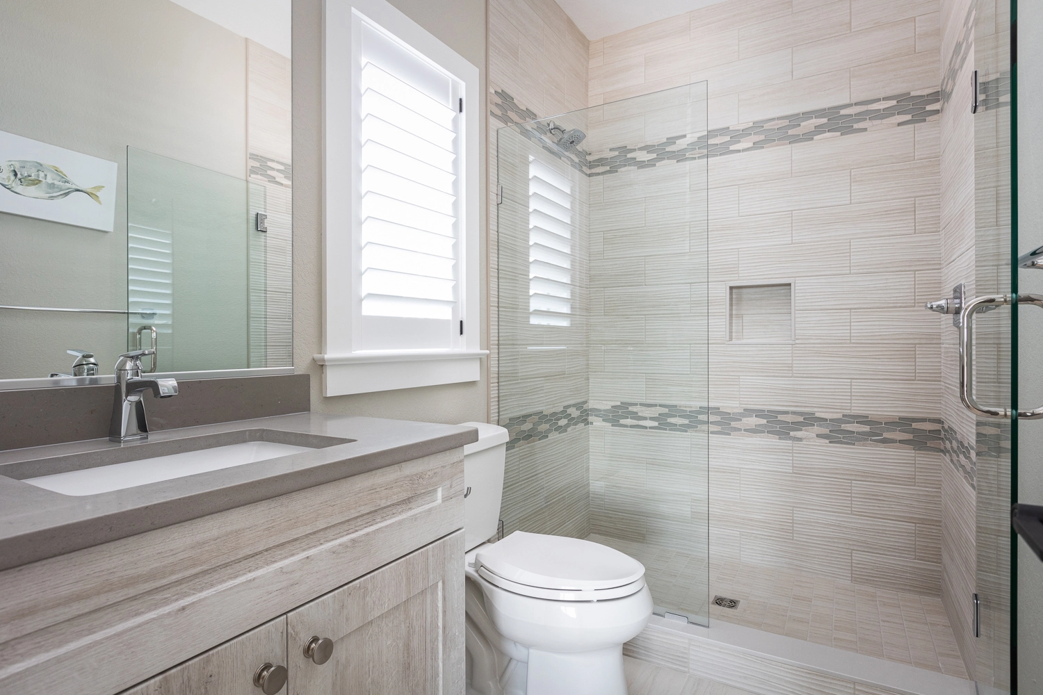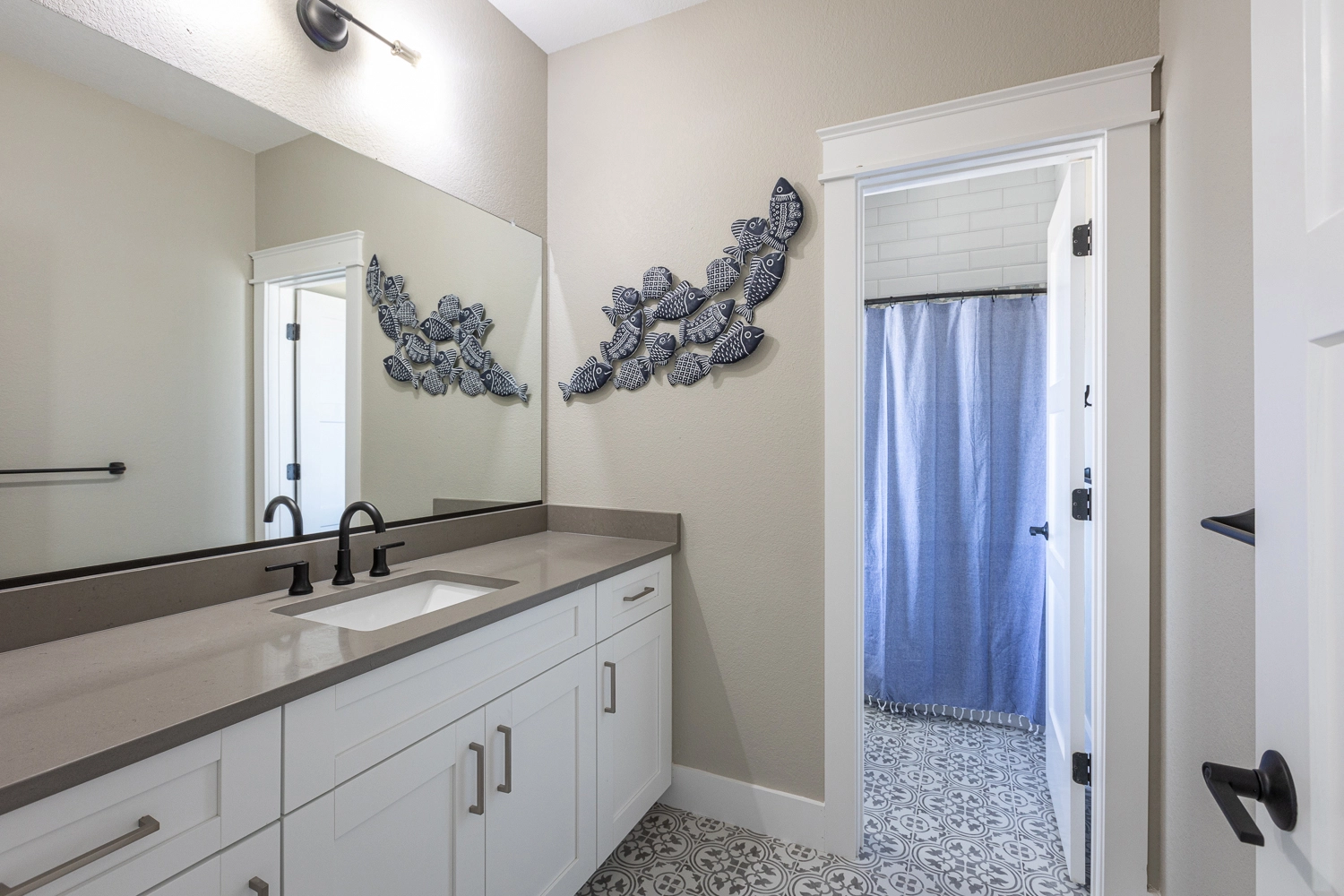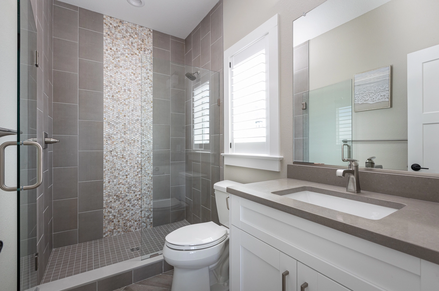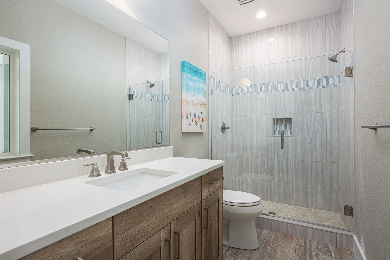 "The house was beautiful and checking in was so nice and easy. The bathrooms were all custom and a nice modern style. The designer did a nice job on the furniture and décor. The kitchen was fully stocked with cooking and baking hardware. The beds ands pillows were comfortable. The guest house was a nice feature. We had small children with us. They went to sleep early in the guest house, while we stayed up and didn't have to worry about being quite. The outdoor living space was awesome. There was an outdoor sitting area with a TV which was a great feature. We loved the pool with the water fall and the shallow area for the babies was great. All around great house. All the electronics: TV's, movie room, and speakers were easy to use. The only complaint is there was no outside steps going from the 2nd floor to the inside of the house. So if you came off the beach to get to the 3rd floor or the guest house you had to go down to the 1st floor and go inside and up to the 2nd/ 3rd floor. You could cut through someone's bedroom but if it's not your room that's not right. We would rent this house again. The is our 3rd time renting with Twiddy and it's been a great experience."