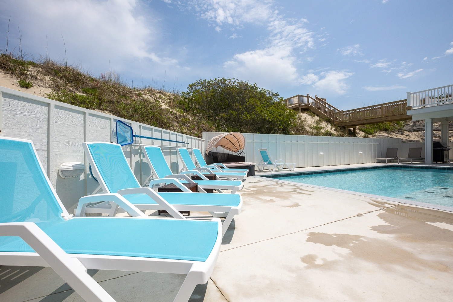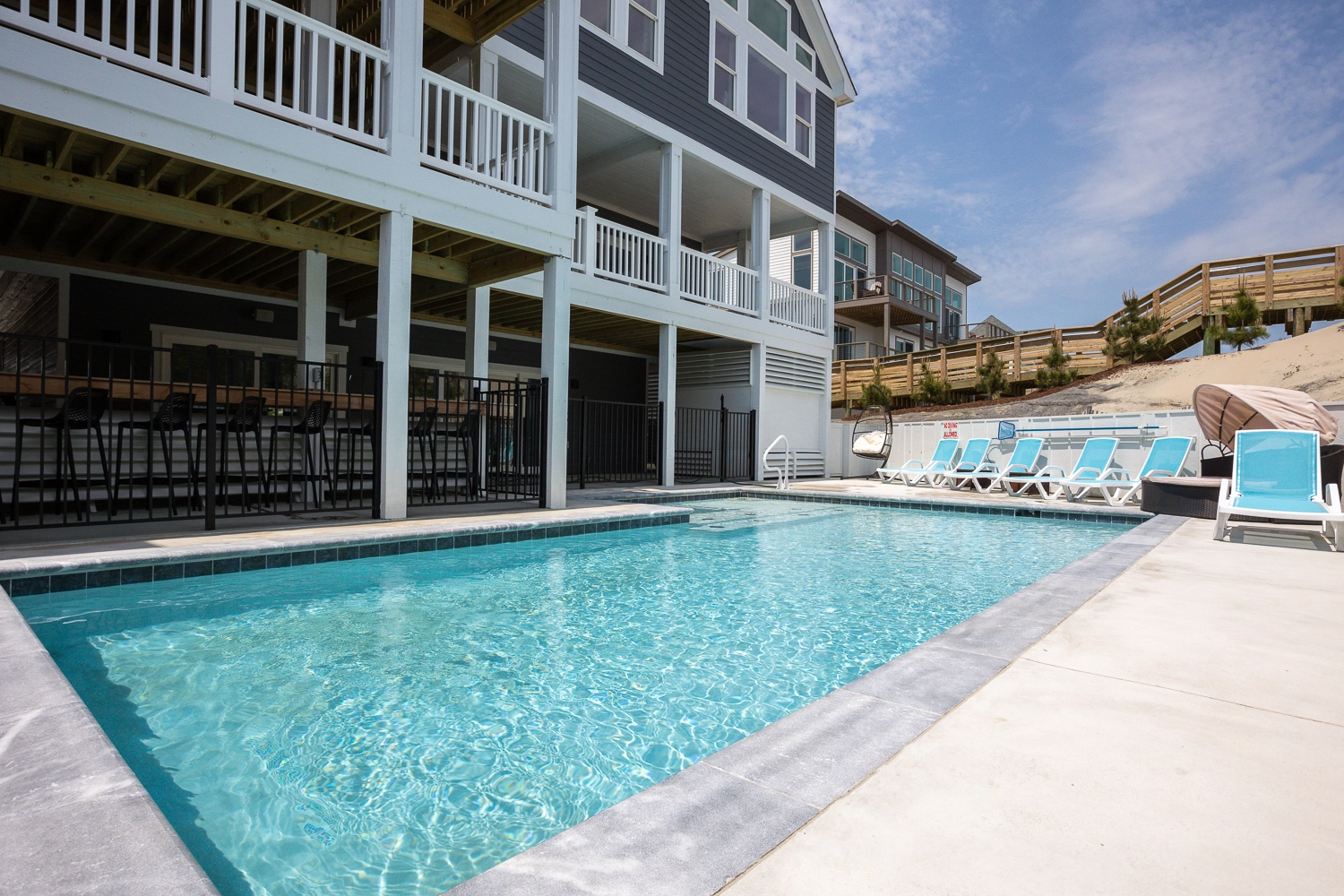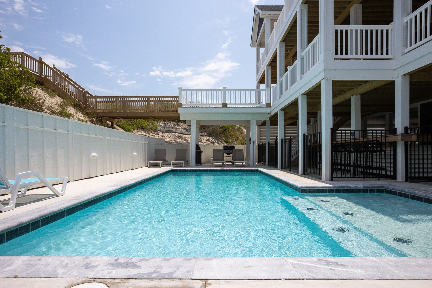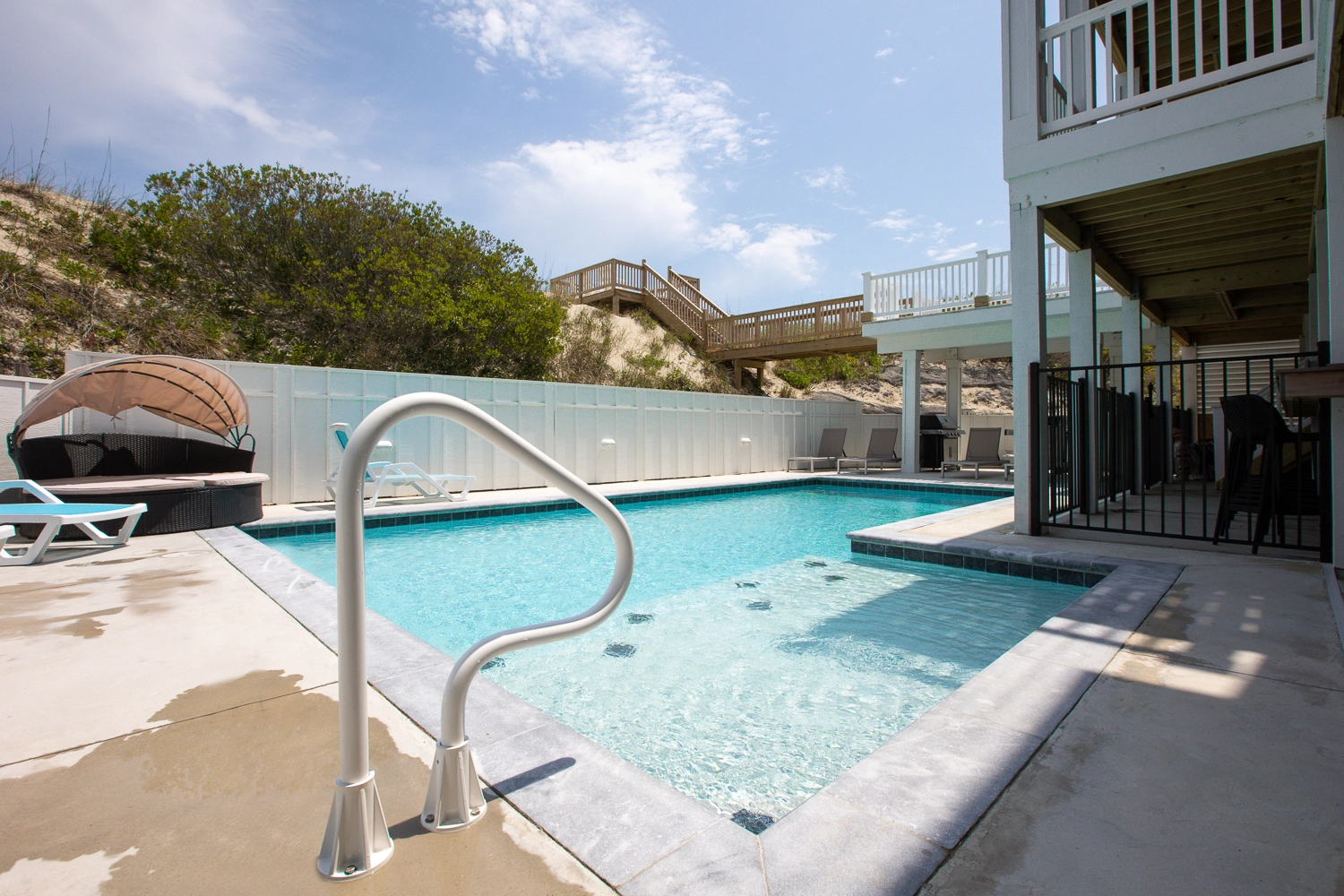 "Our extended family loved the roominess of the main room, kitchen and upper level. We enjoyed the poo in a week filled with extreme heat and were thankful to have direct beach access."