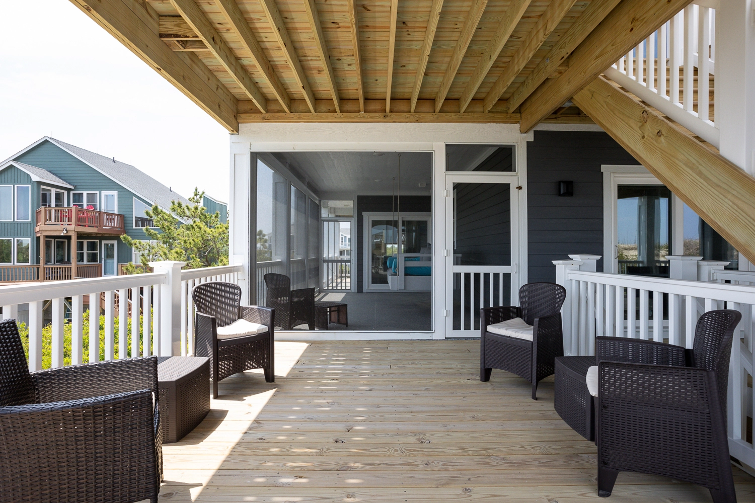 "Nice pool. Lots of covered decks. The screened in porches. The rain shower heads were a nice feature in many of the bathrooms. Kitchen well supplied with plates and silverware etc. Good access to the beach from the second floor."
