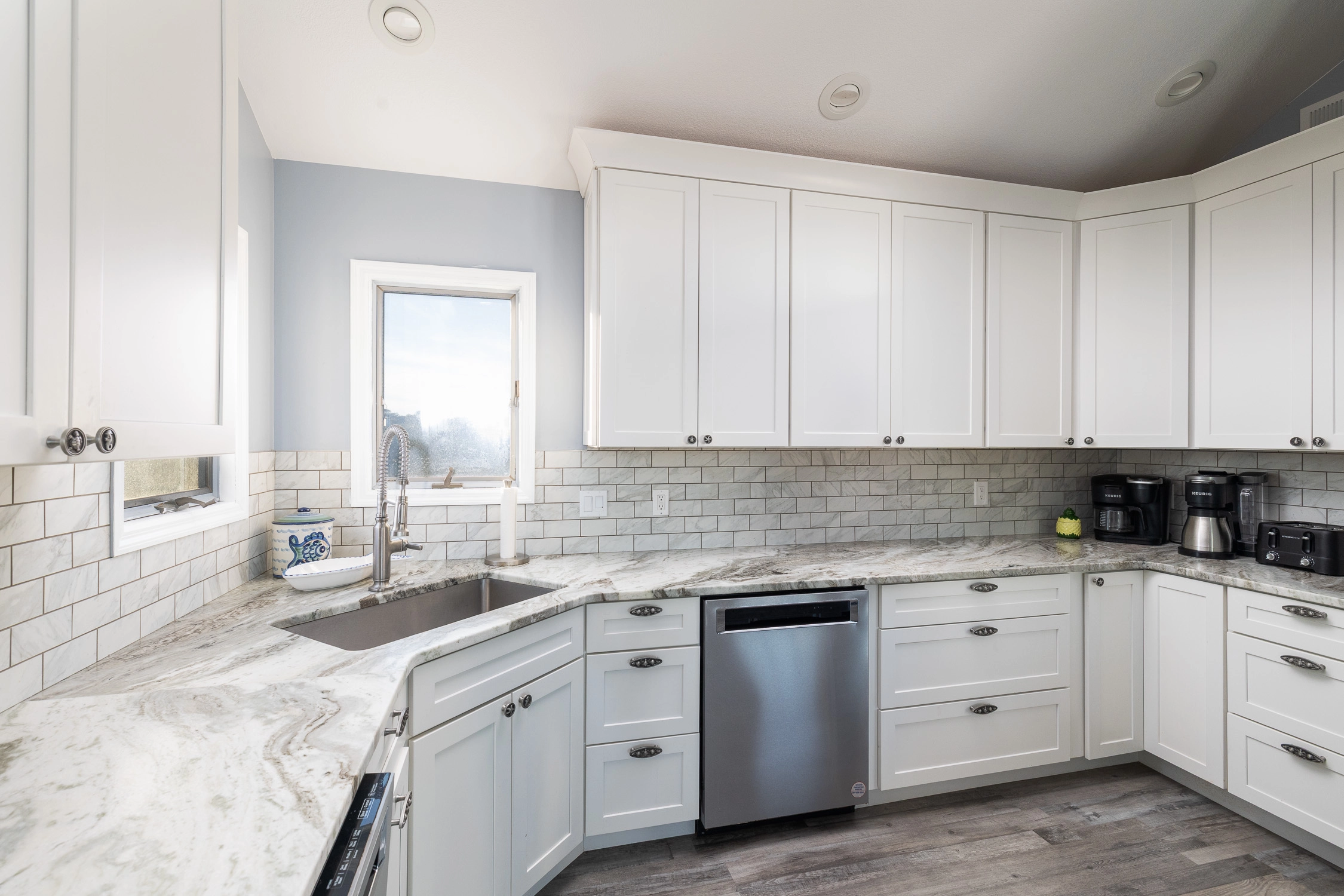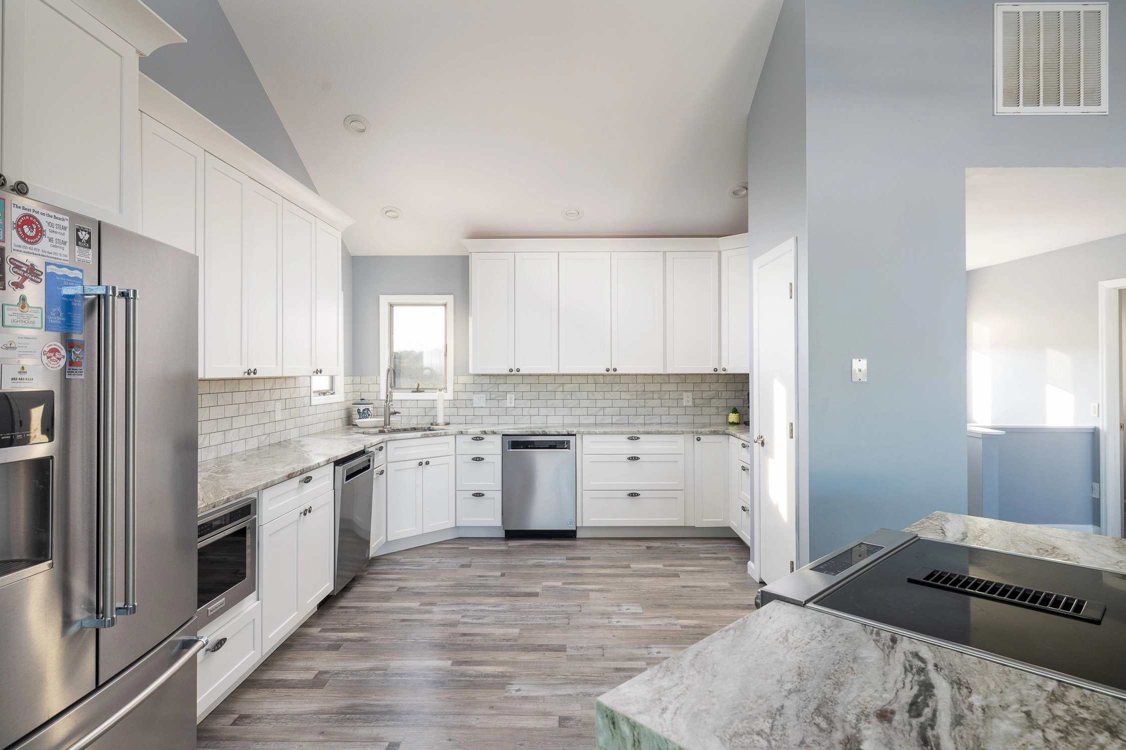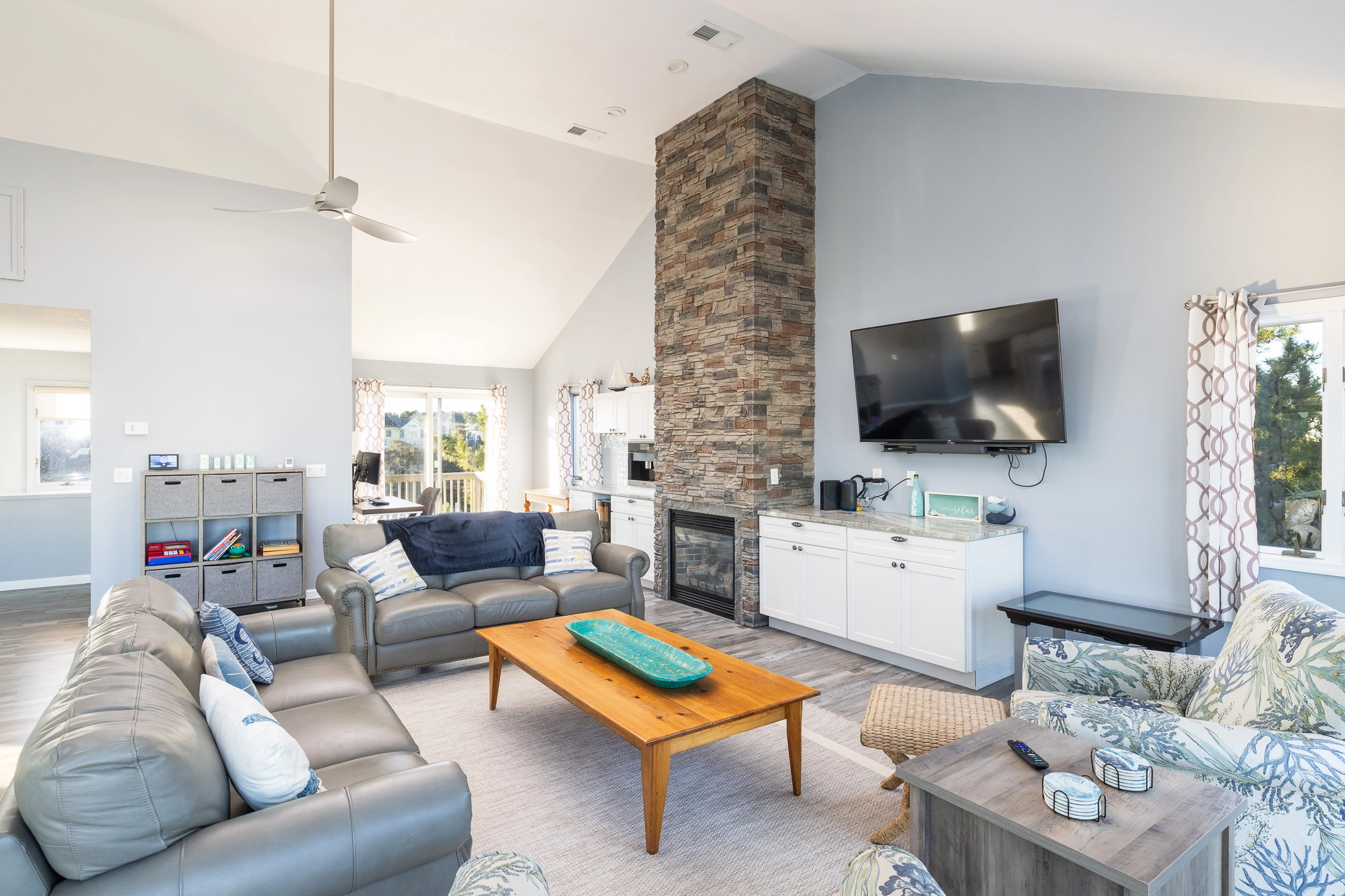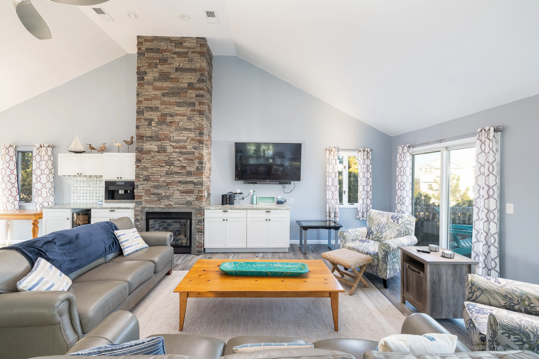Great room with gas fireplace, coffee bar, and wine cooler; kitchen; dining area; sunroom.