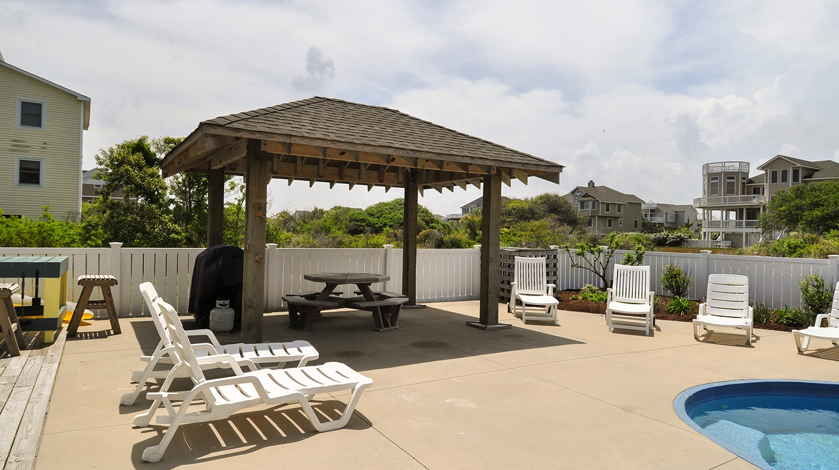 Covered gazebo on pool deck, multiple TVs, non-smoking.