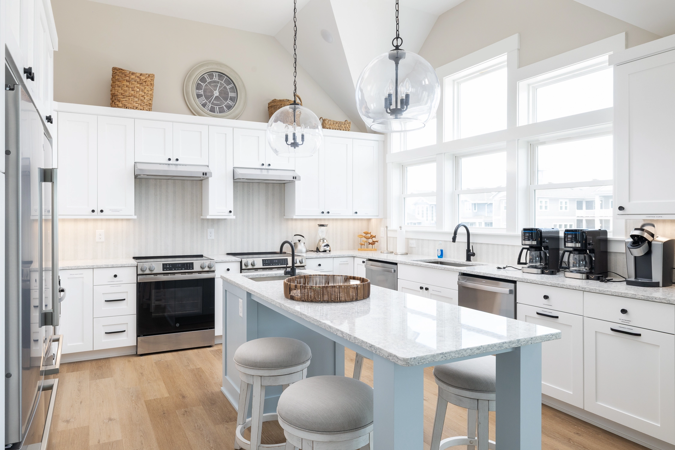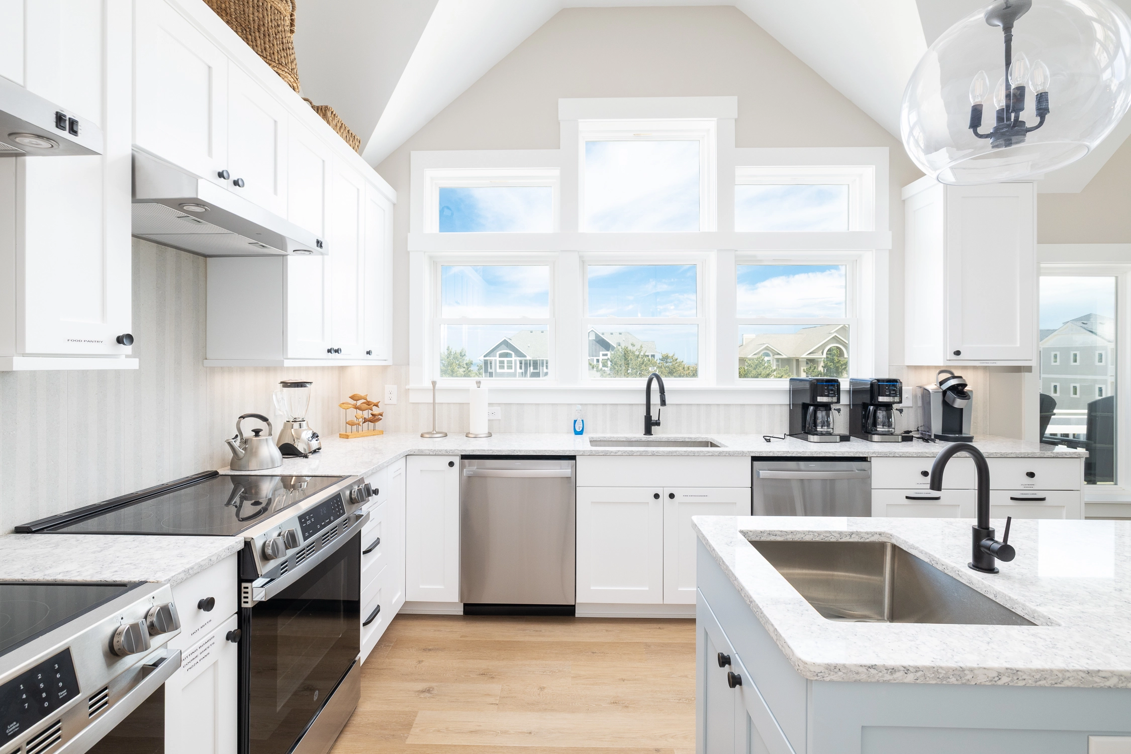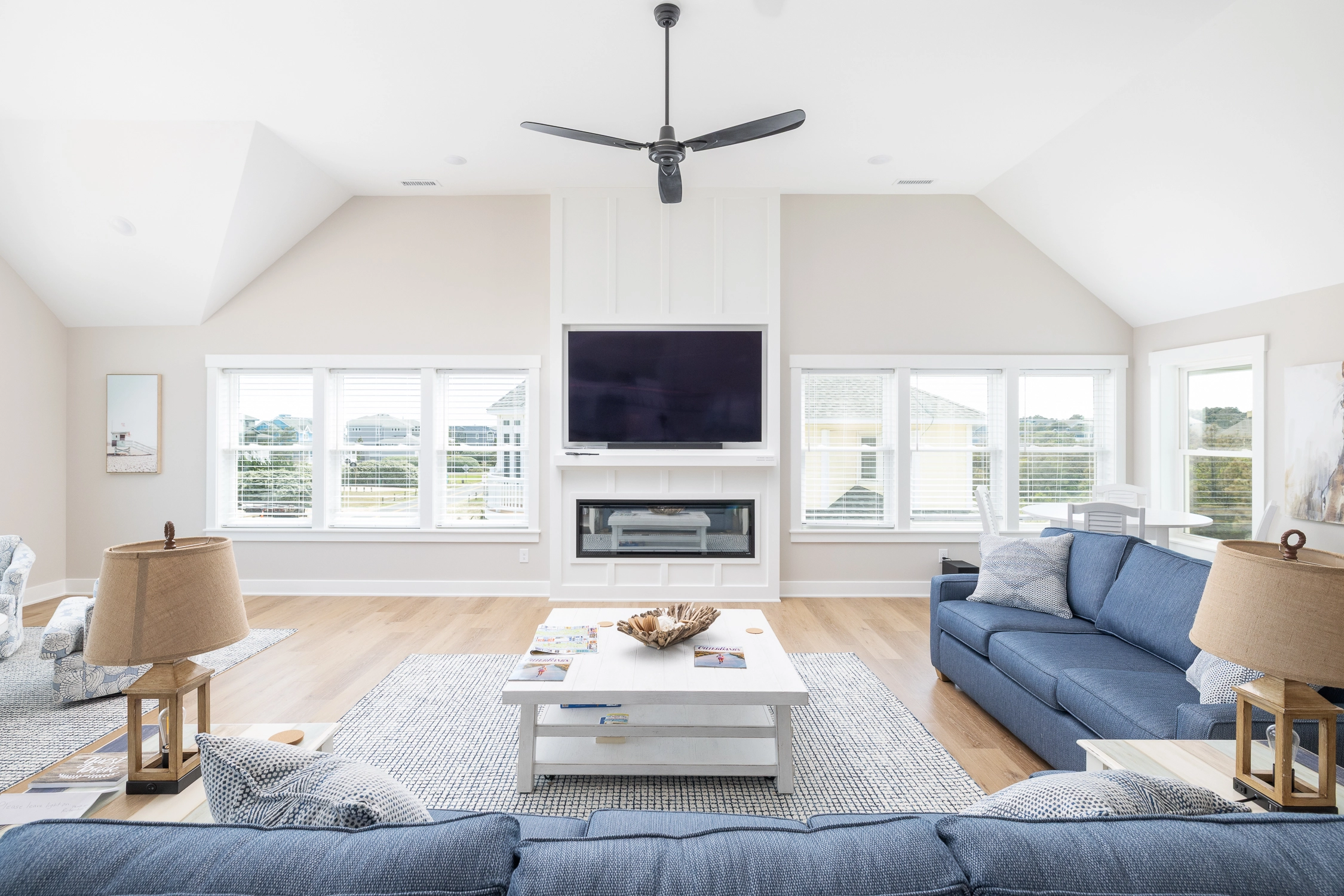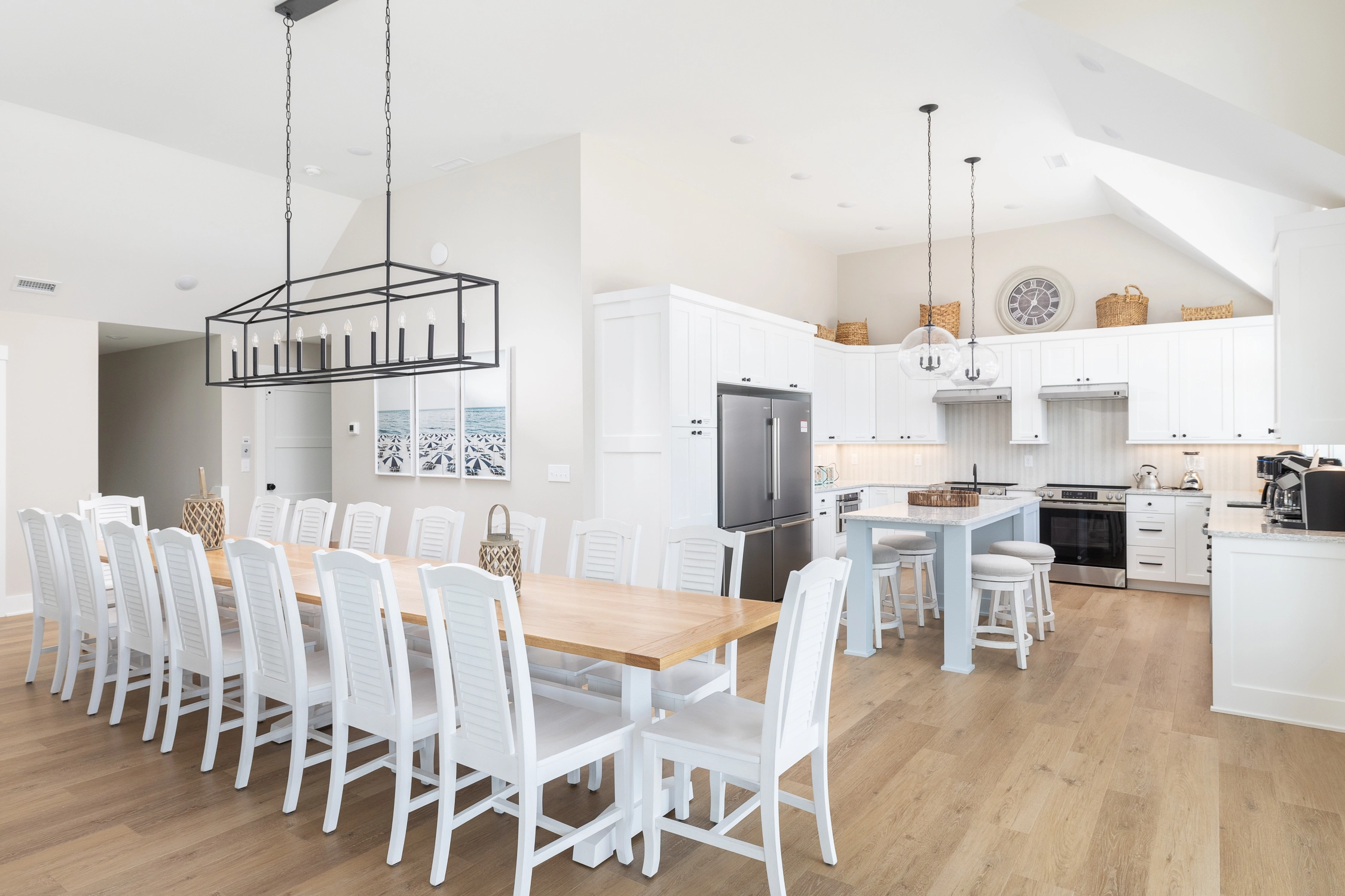 Great room with electric fireplace; kitchen with two stoves, two refrigerators, and two dishwashers; dining area.
