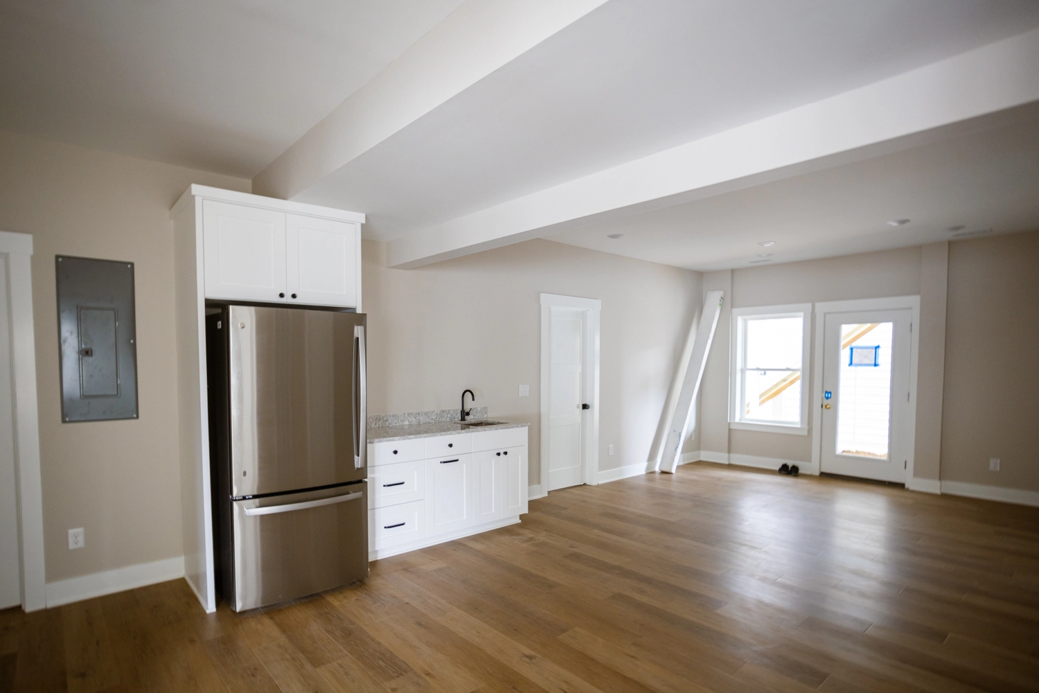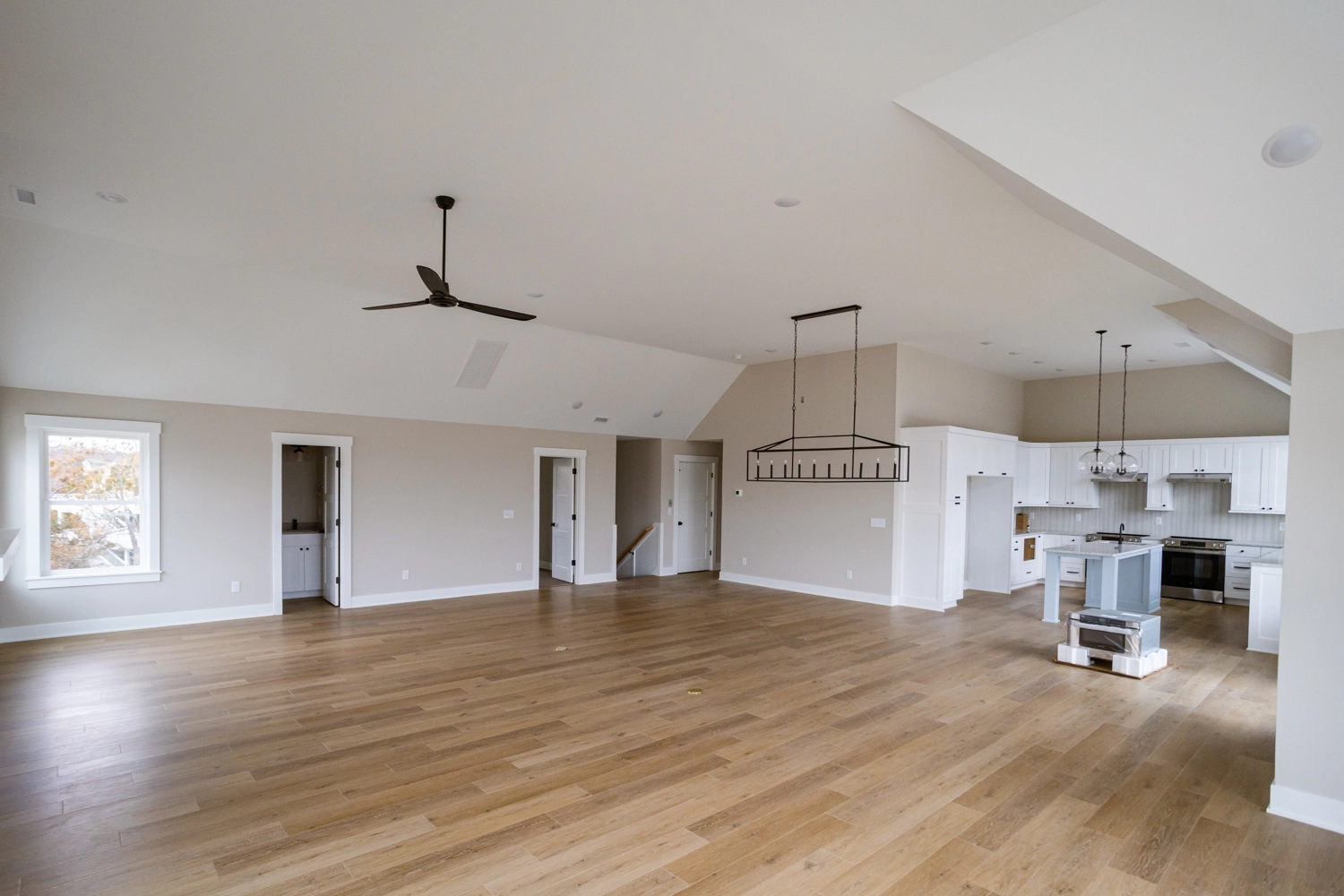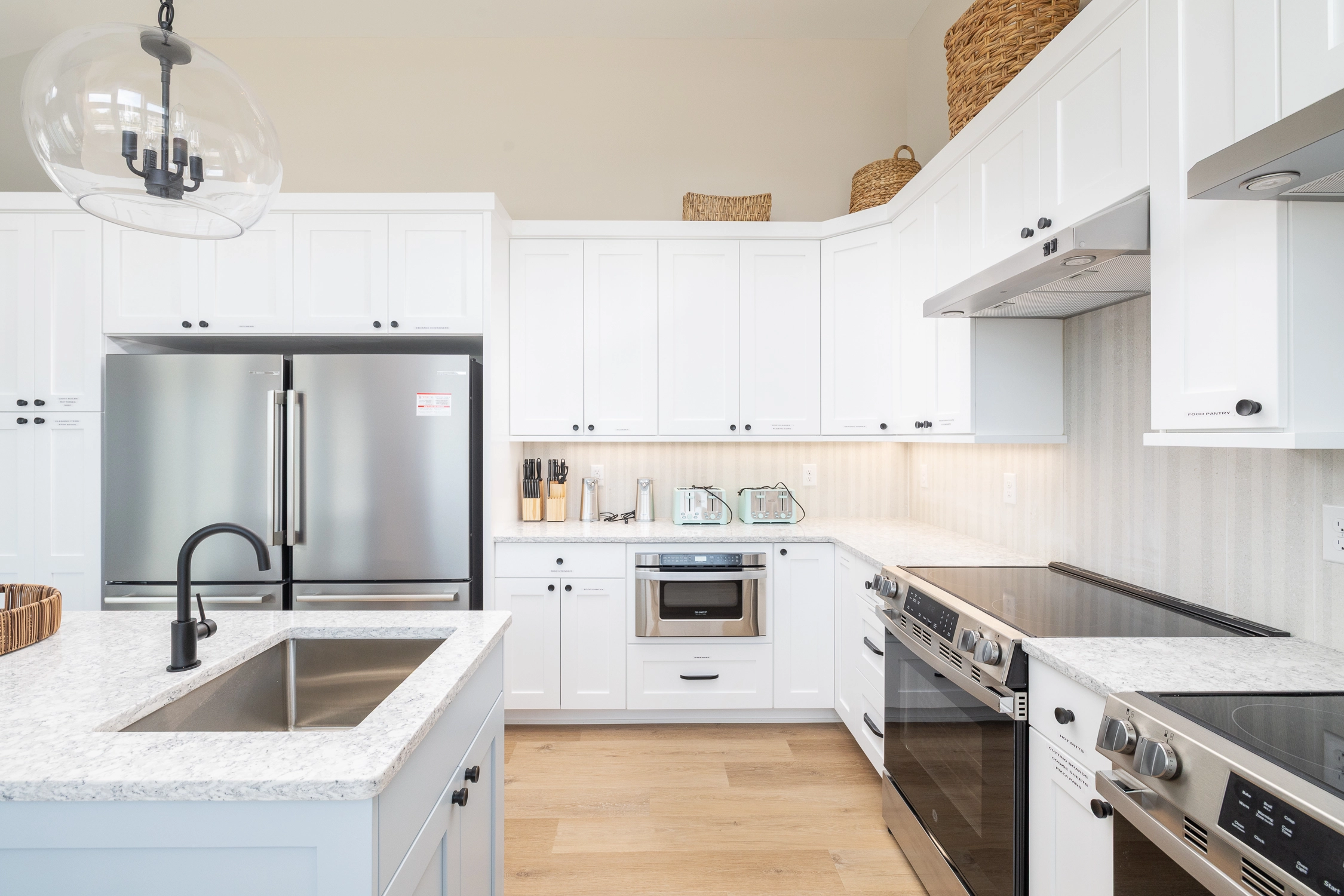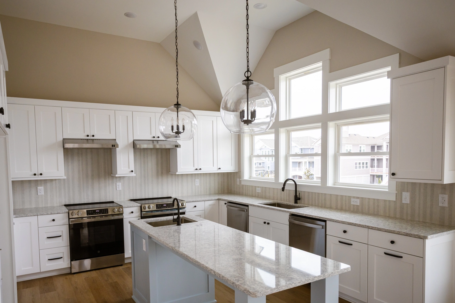 Great room with electric fireplace; kitchen with two stoves, two refrigerators, and two dishwashers; dining area.