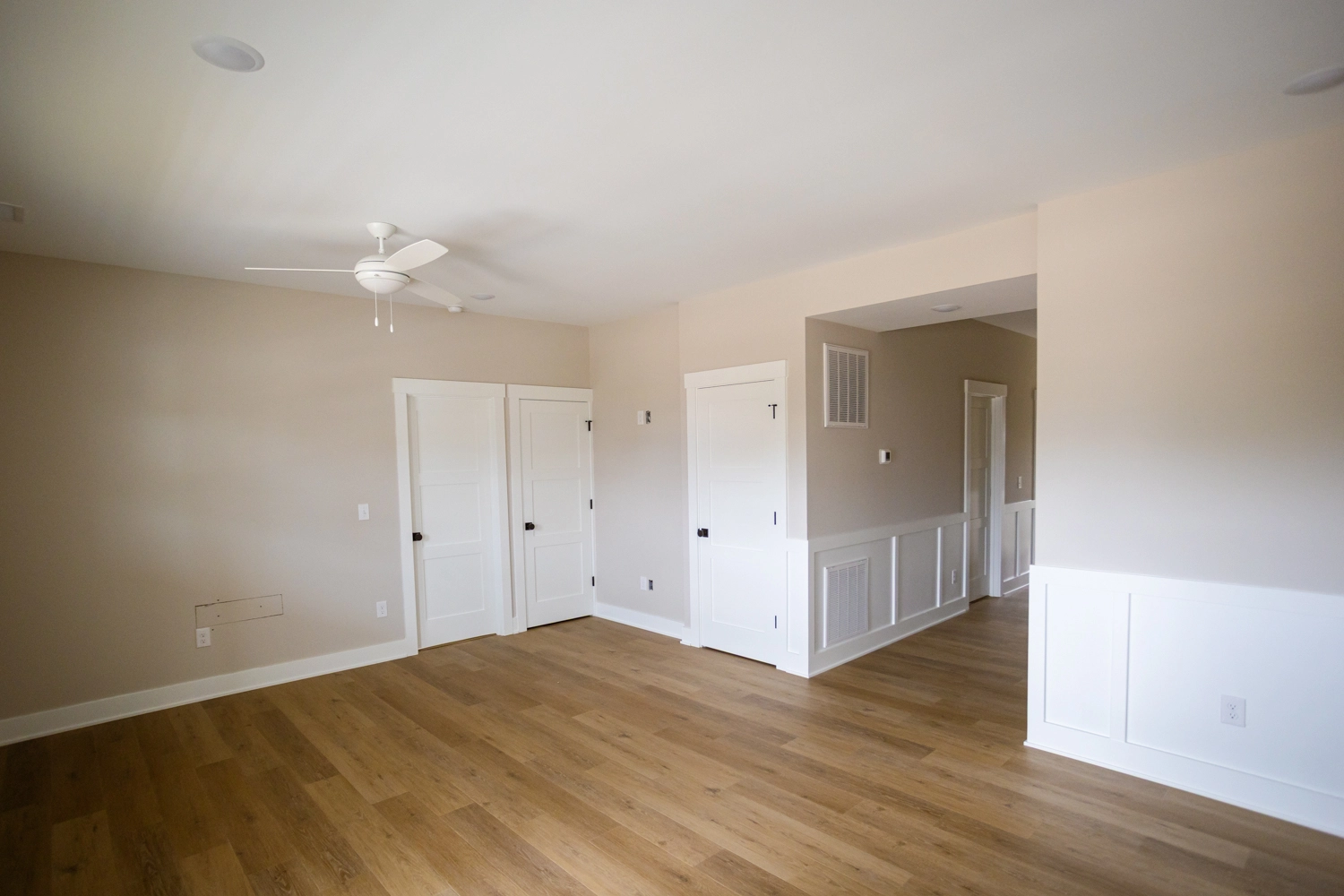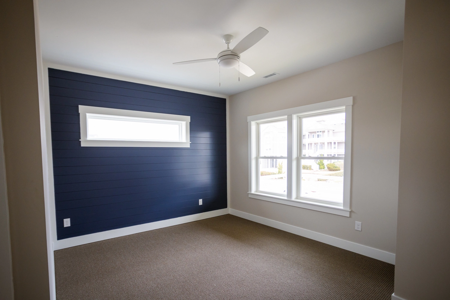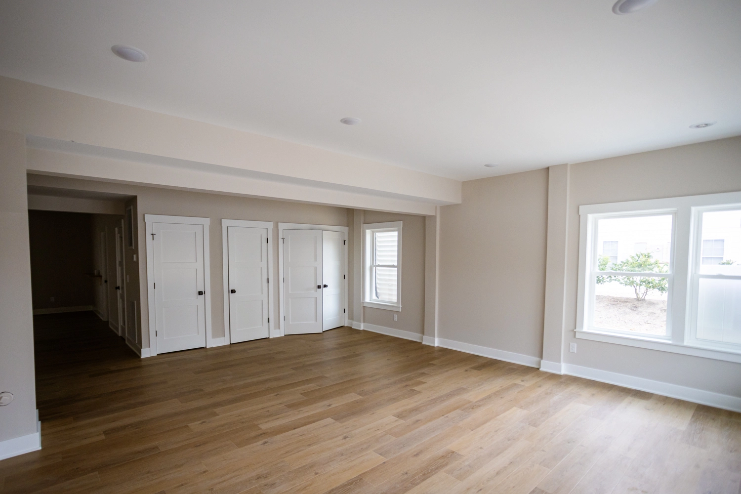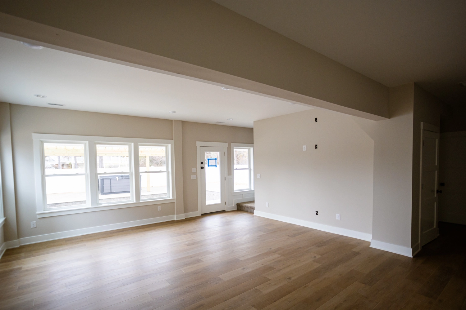 Great room with electric fireplace; kitchen with two stoves, two refrigerators, and two dishwashers; dining area.