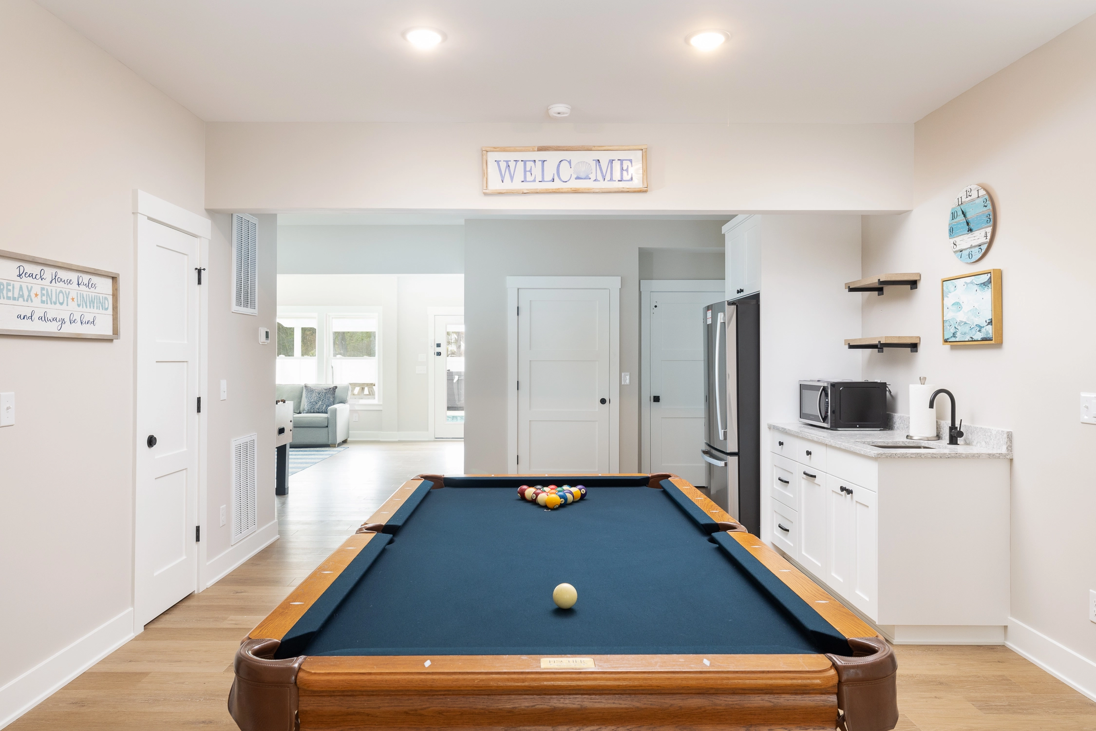 Rec room with pool table and wet bar; media room; laundry.