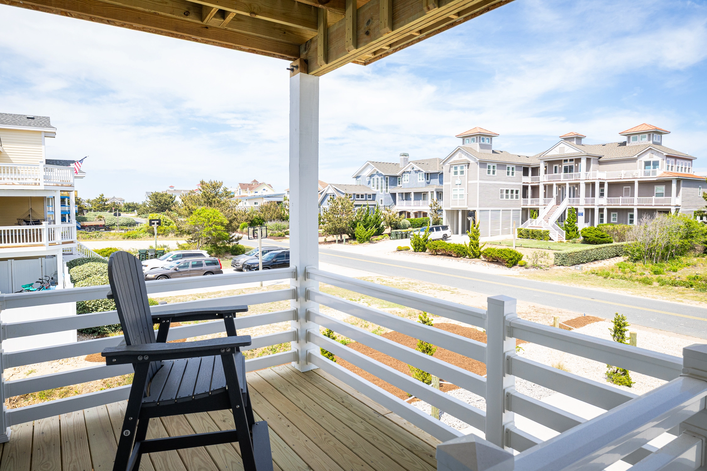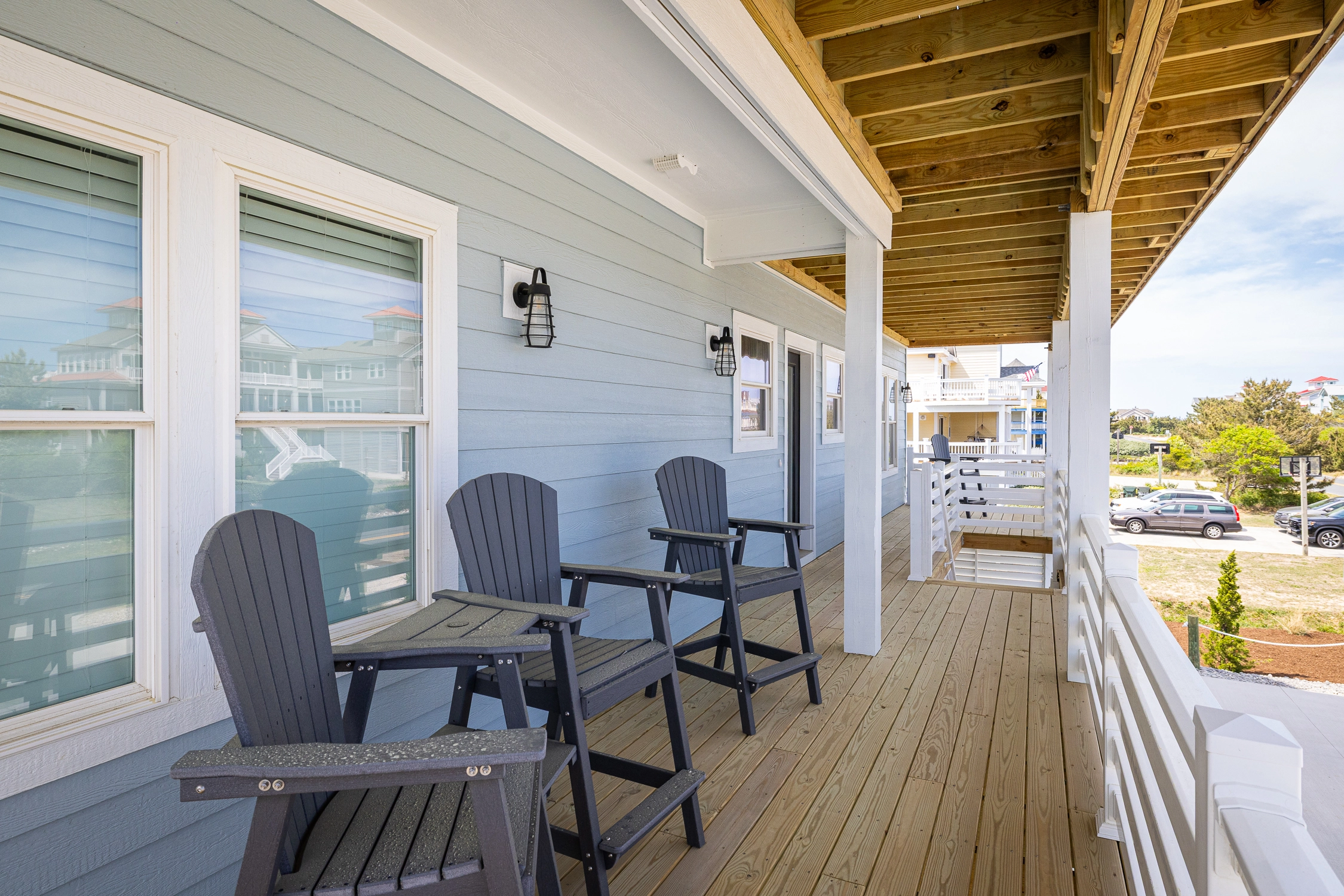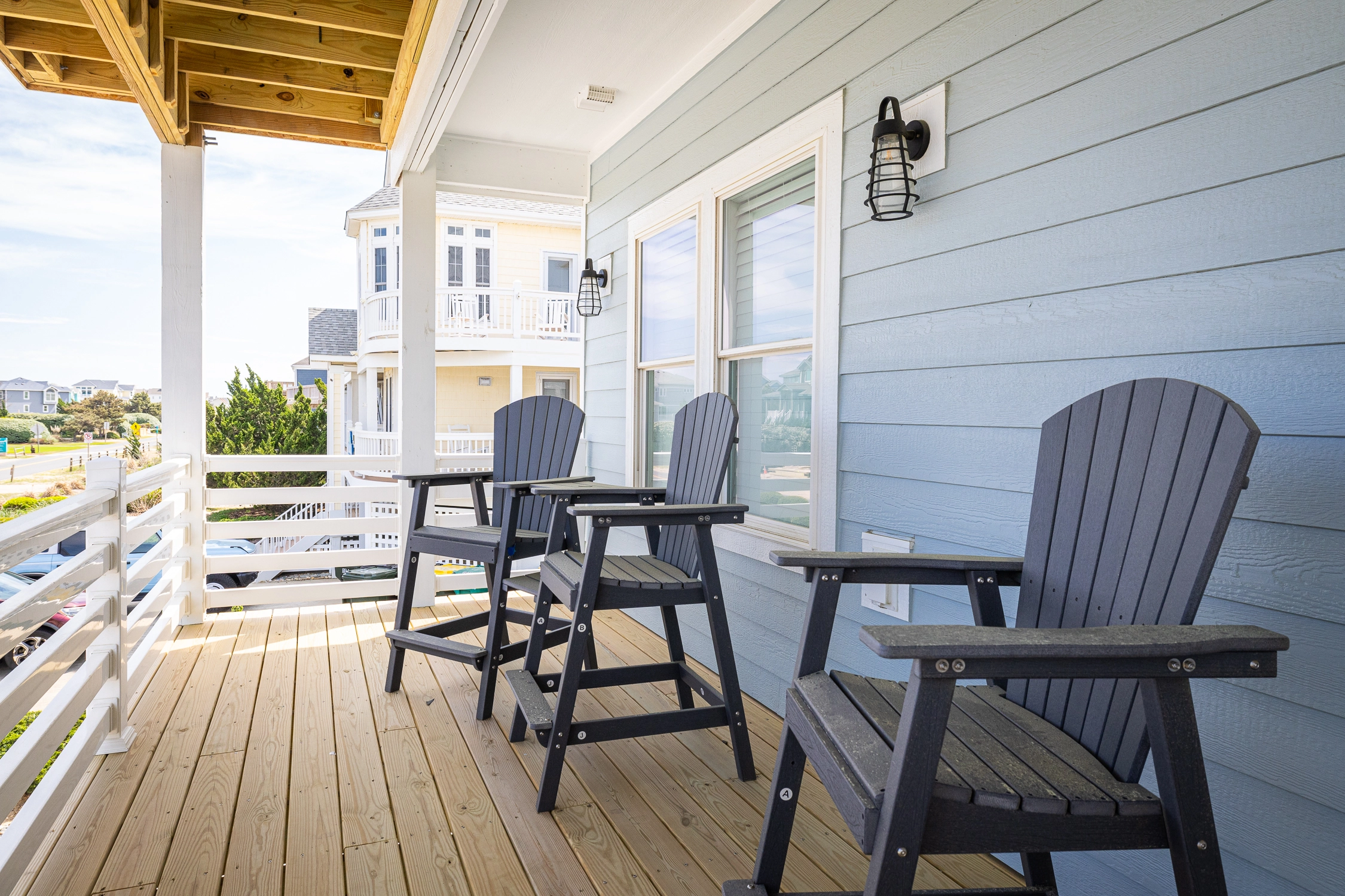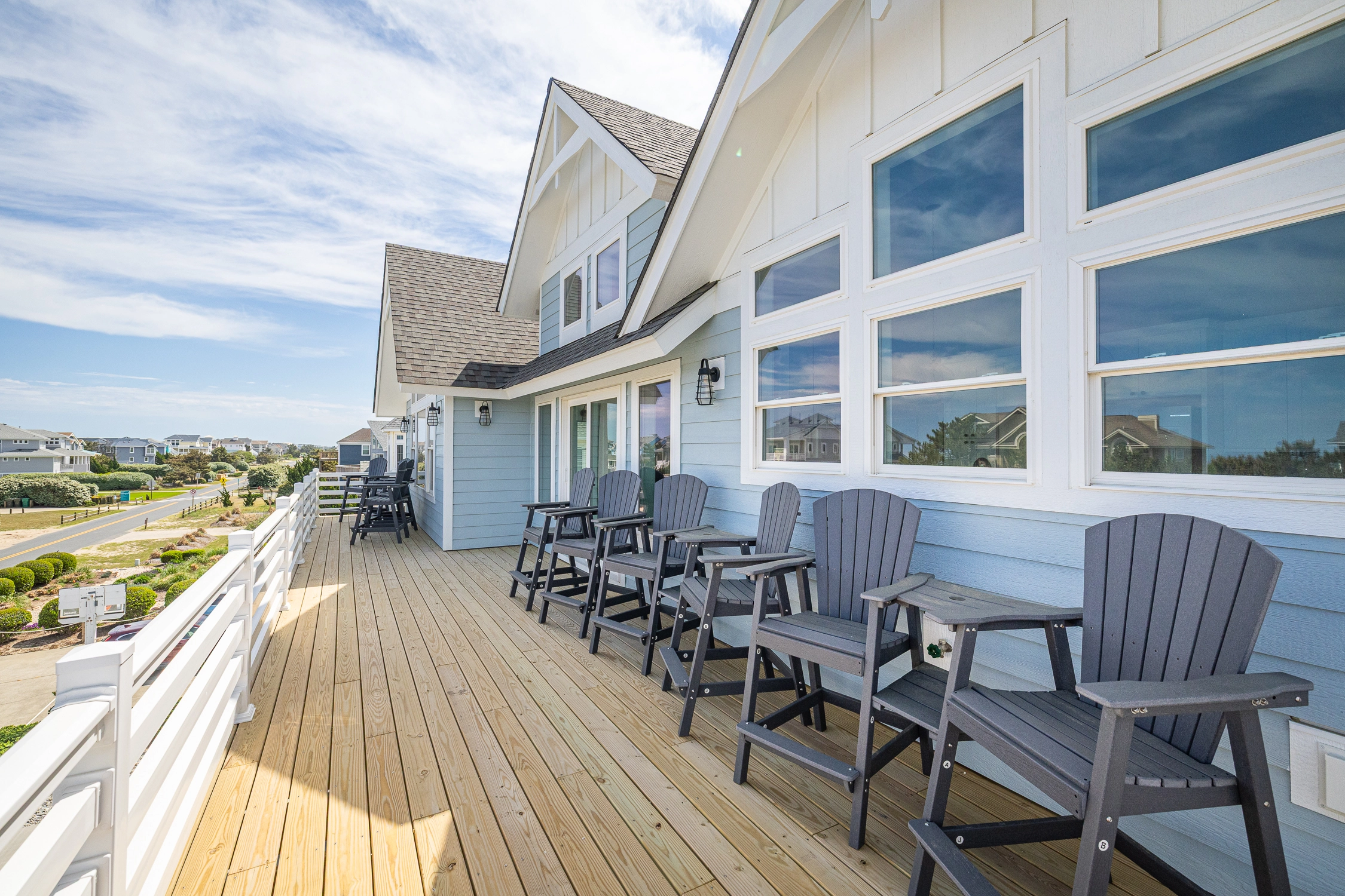 Inside the main house, you’ll find thoughtfully designed spaces that make vacation living effortless. On the top floor, you’ll find the great room, which is the heart of the home. The living area is comfortably furnished, perfect for movie nights, game-day viewing, or quiet reading, and it includes an electric fireplace for chillier evenings. Across the room, the large kitchen is built for group cooking and entertaining, featuring two refrigerators, two stoves, two dishwashers, and plenty of counter space. Adjacent to the kitchen is the dining area, ideally situated for your group to dine together. An elevator makes getting groceries and luggage into the home effortless. Outside on the deck, sip your morning coffee as you watch the sunrise over the ocean, or simply bask in the salty ocean breeze.