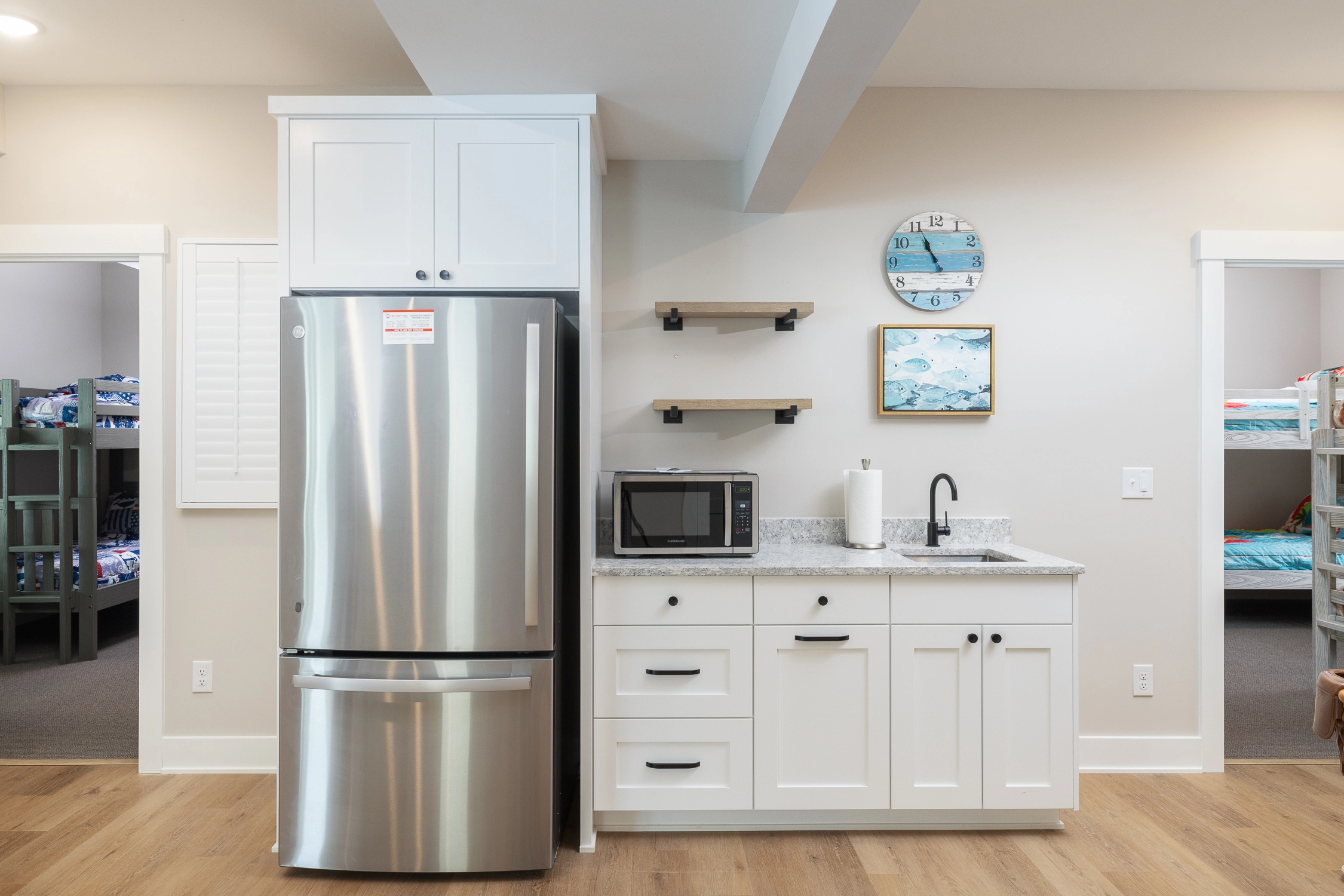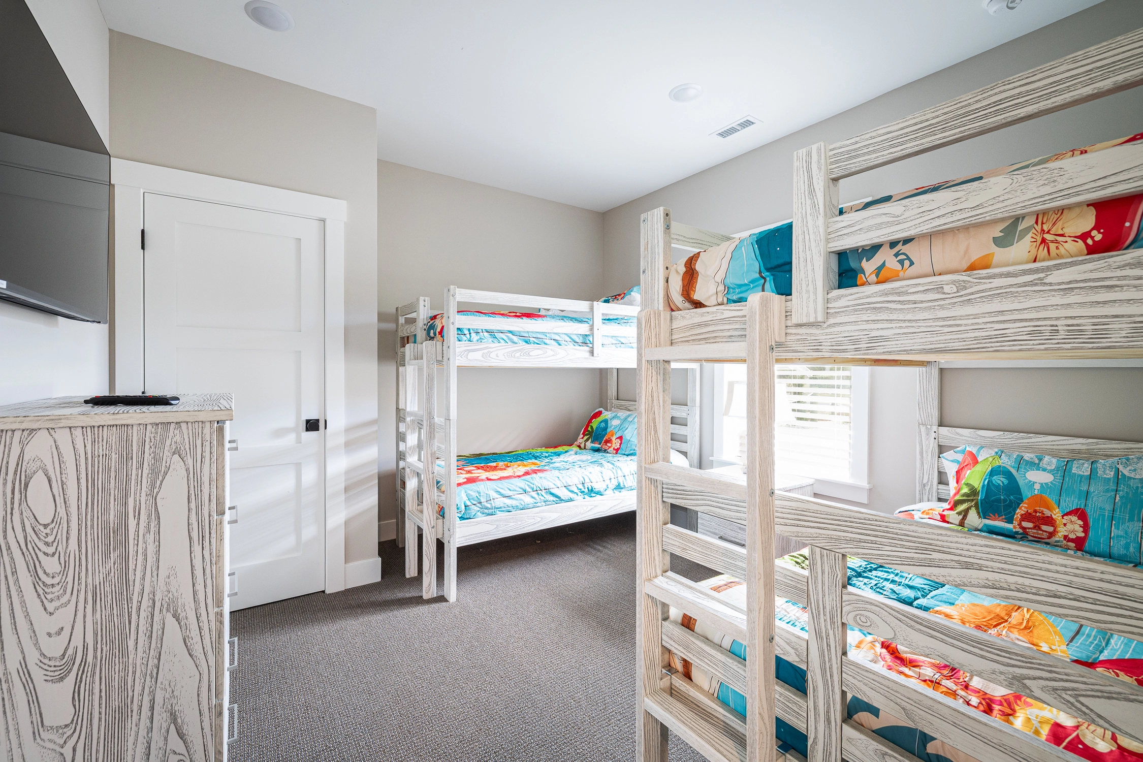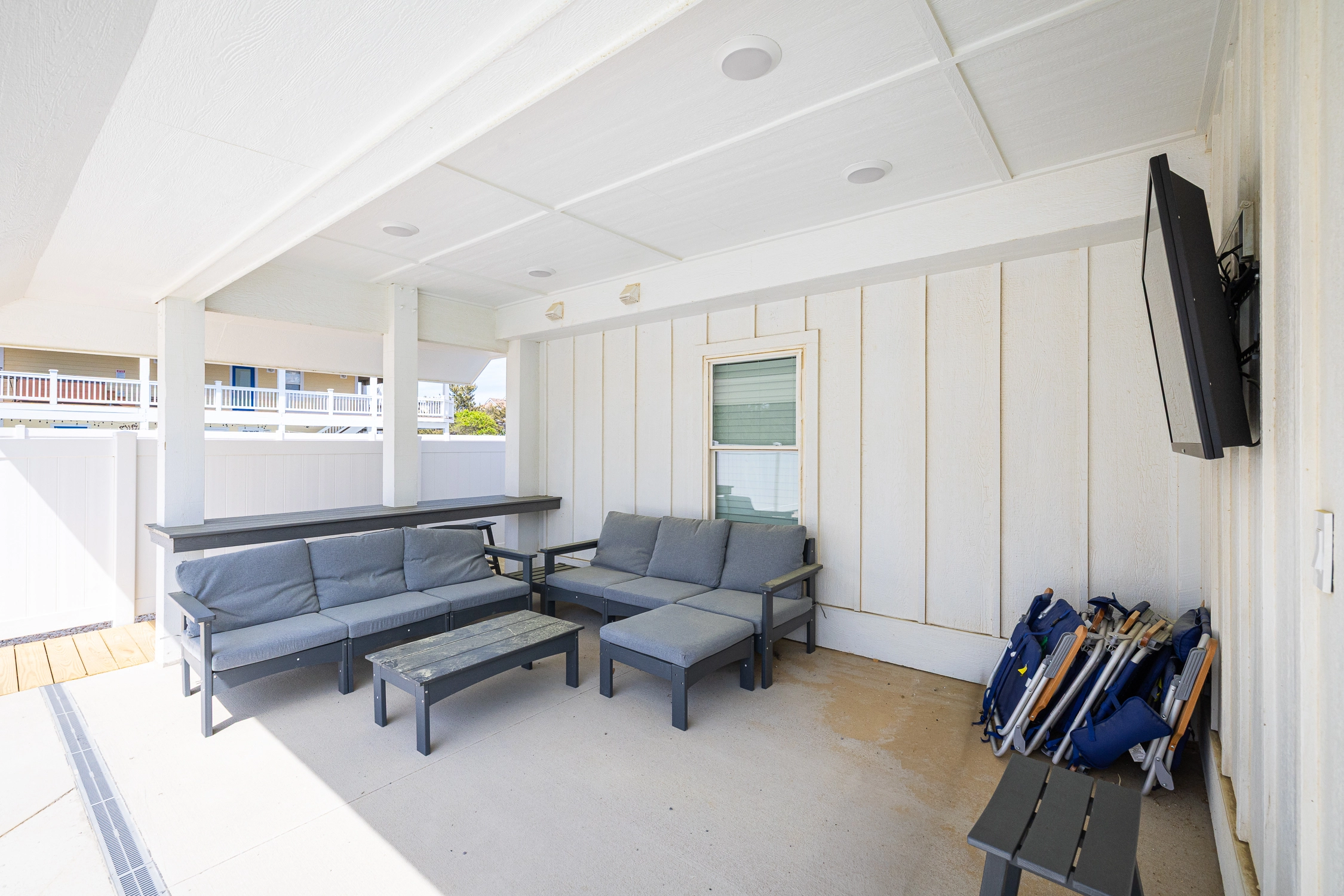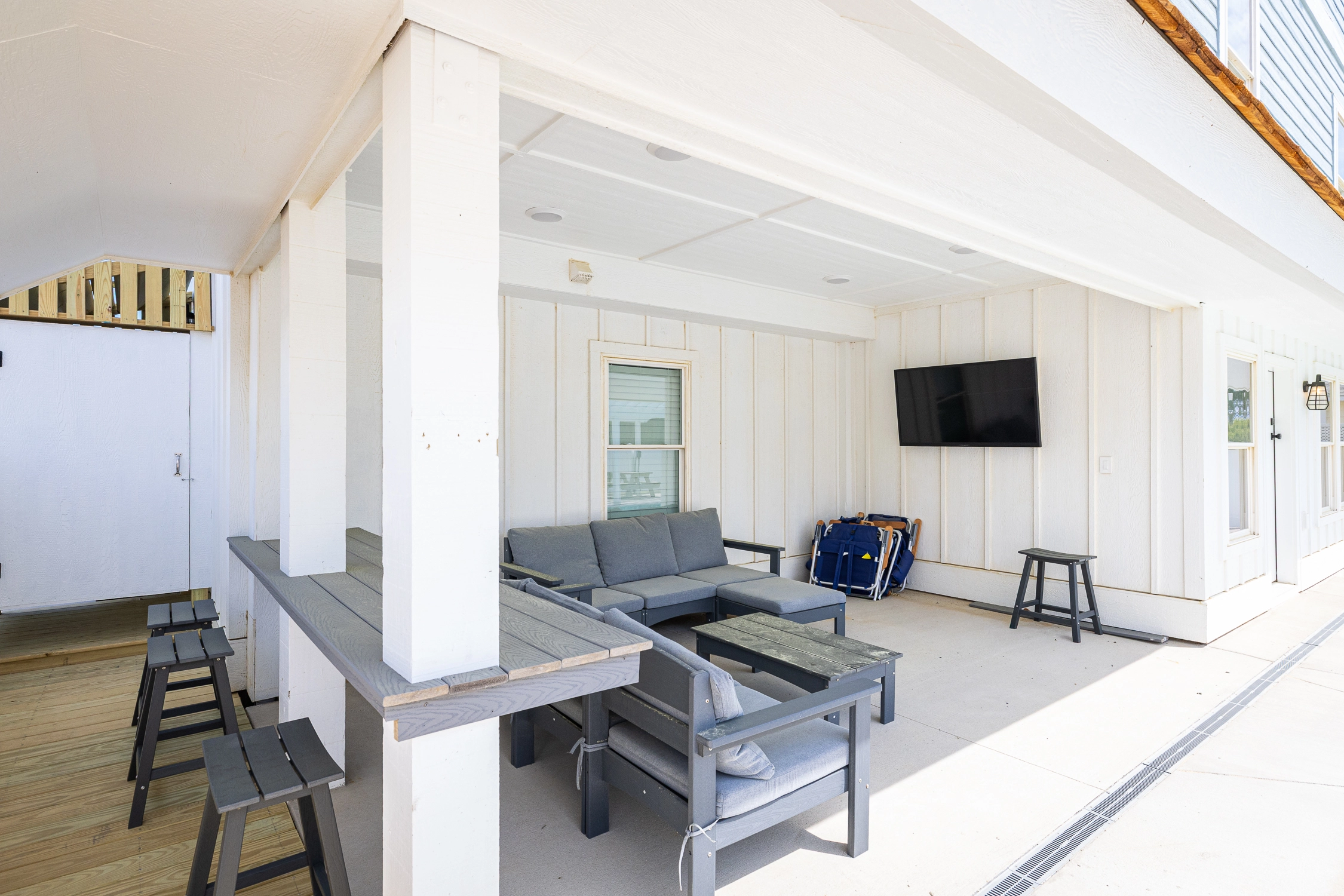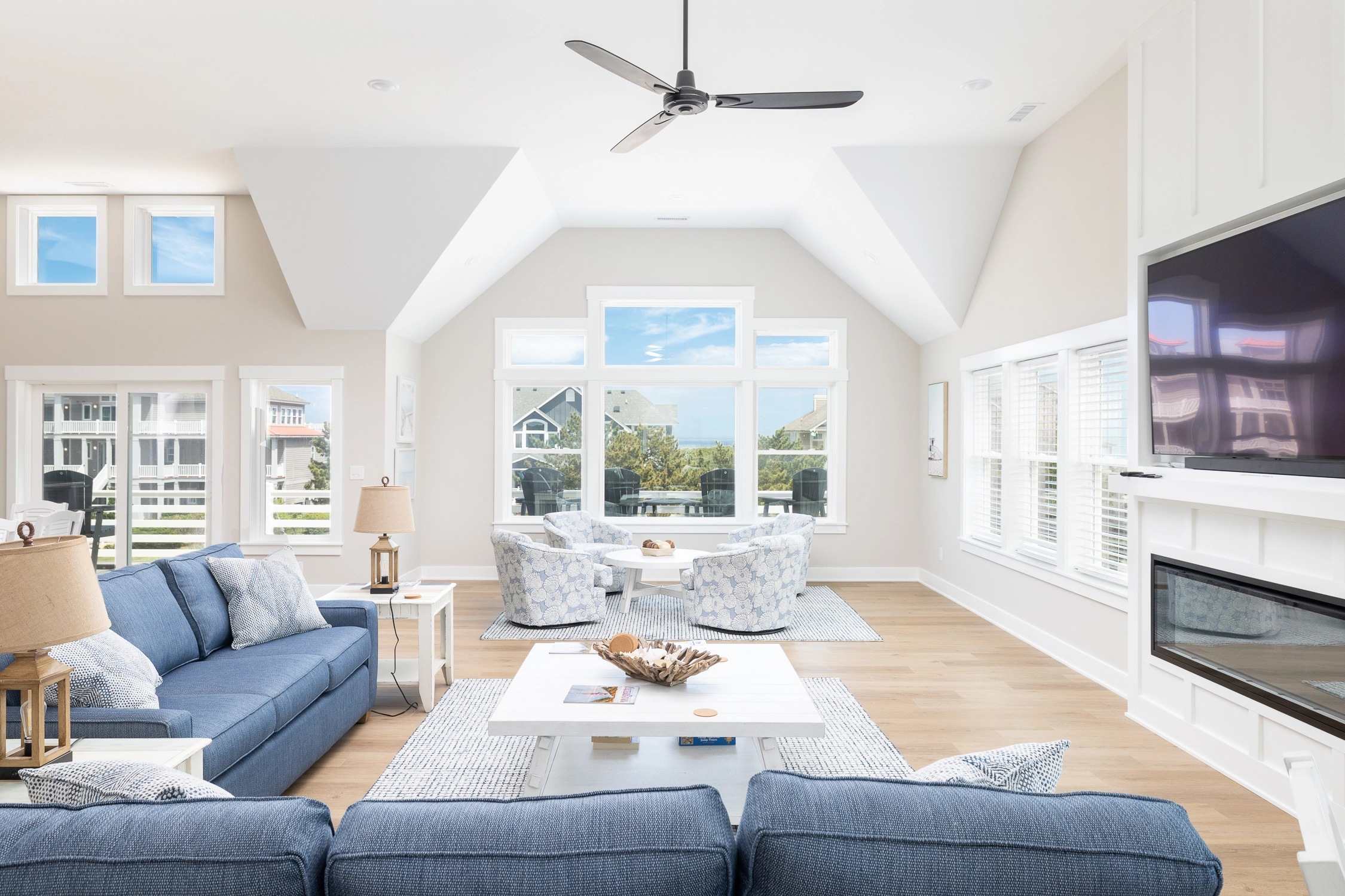 Inside the main house, you’ll find thoughtfully designed spaces that make vacation living effortless. On the top floor, you’ll find the great room, which is the heart of the home. The living area is comfortably furnished, perfect for movie nights, game-day viewing, or quiet reading, and it includes an electric fireplace for chillier evenings. Across the room, the large kitchen is built for group cooking and entertaining, featuring two refrigerators, two stoves, two dishwashers, and plenty of counter space. Adjacent to the kitchen is the dining area, ideally situated for your group to dine together. An elevator makes getting groceries and luggage into the home effortless. Outside on the deck, sip your morning coffee as you watch the sunrise over the ocean, or simply bask in the salty ocean breeze.