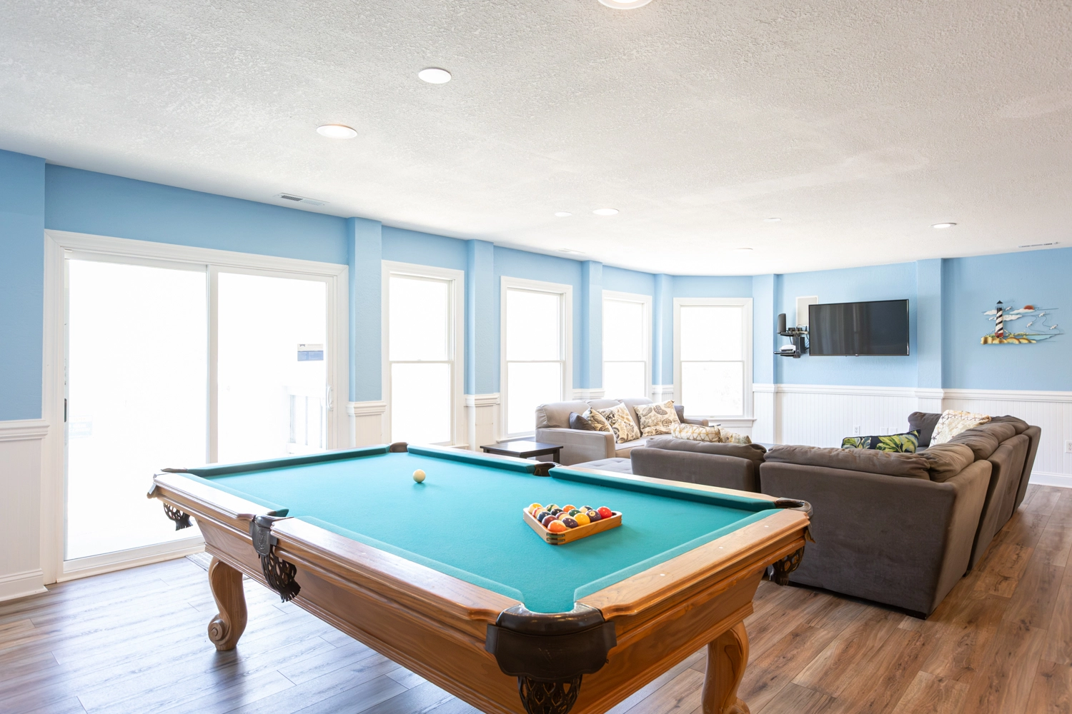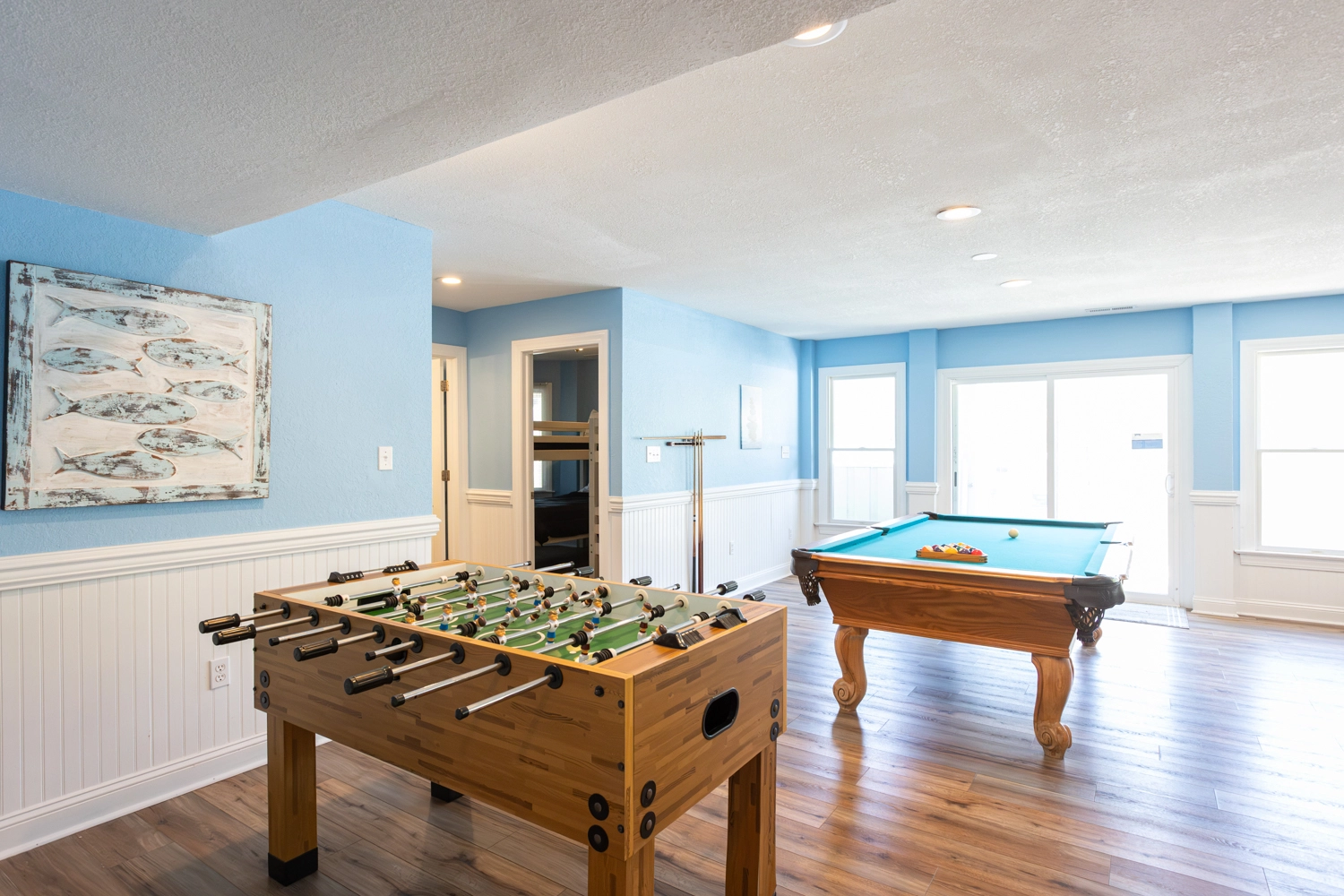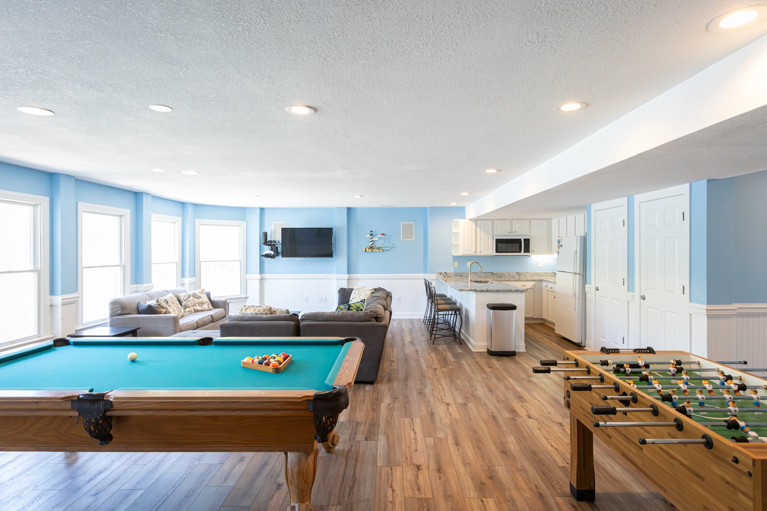 Rec room (QSS) with pool table, foosball and kitchenette with full-size refrigerator.