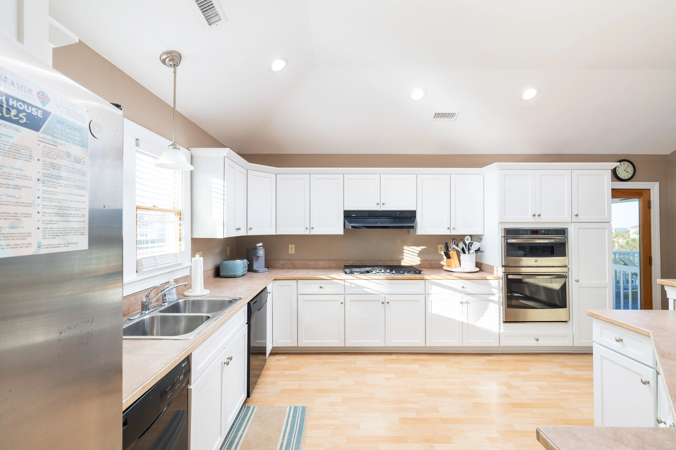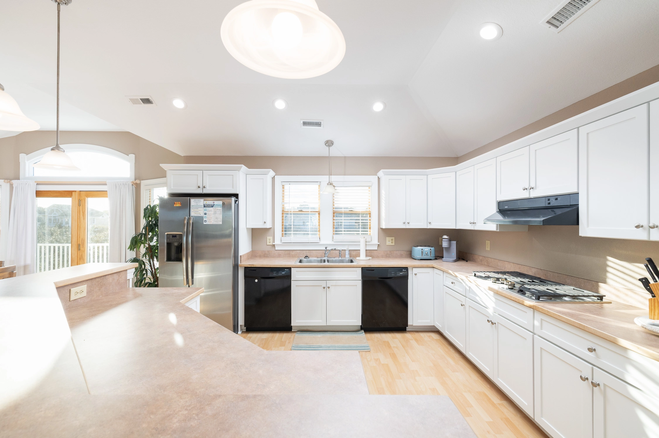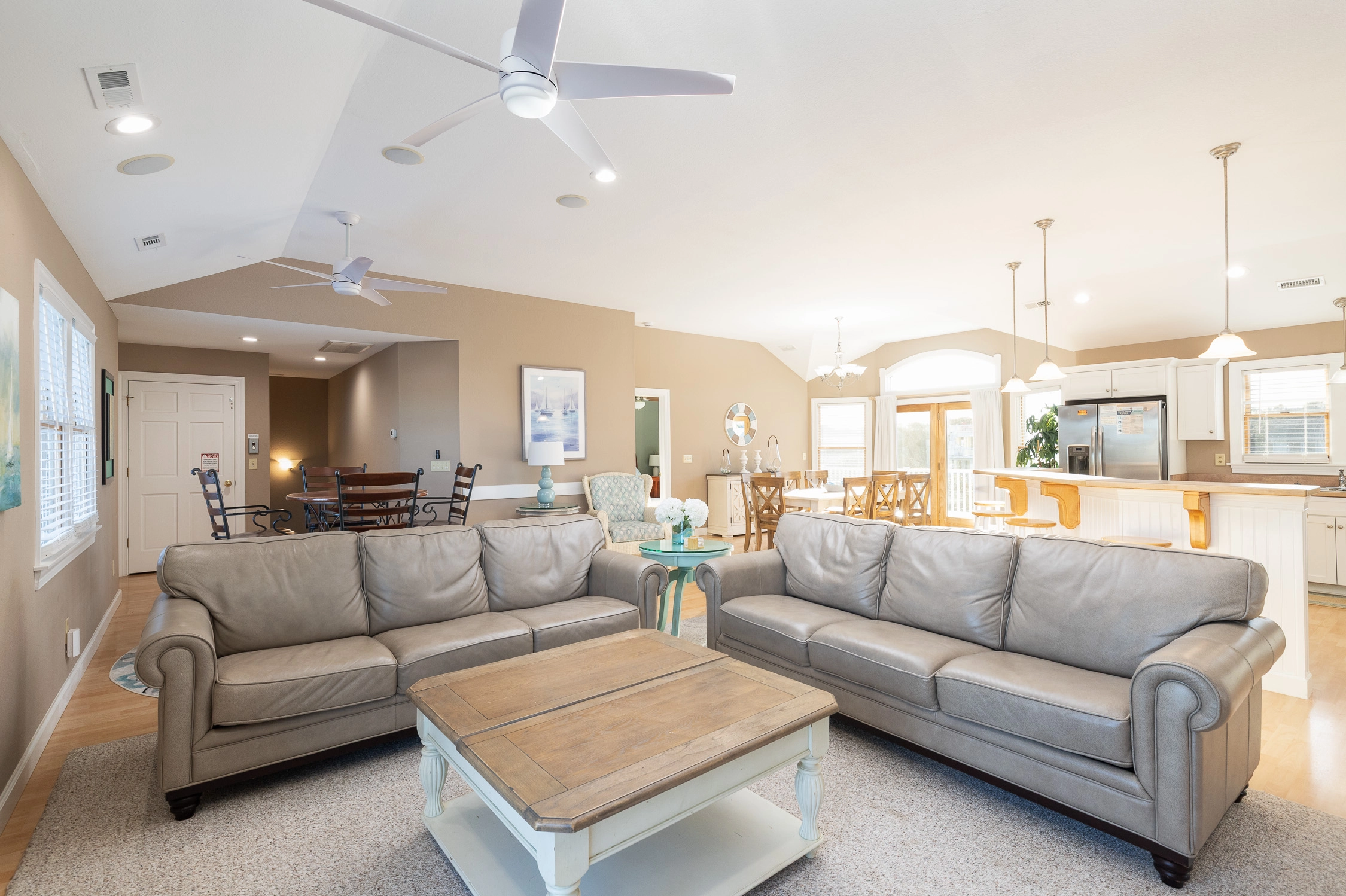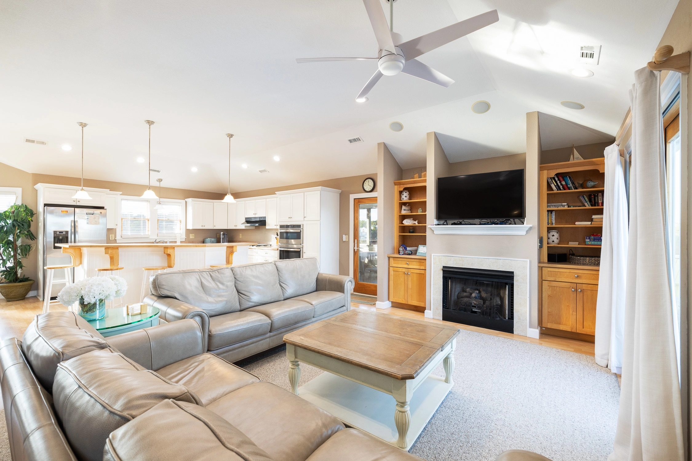 Great room with gas fireplace; kitchen with gas stove and two dishwashers; dining area; screened porch.