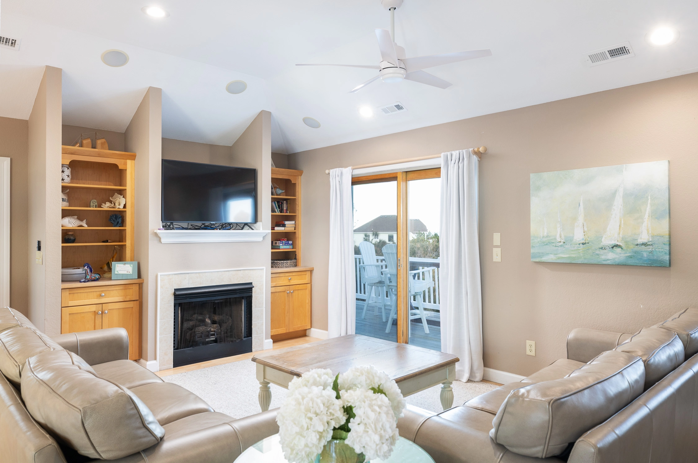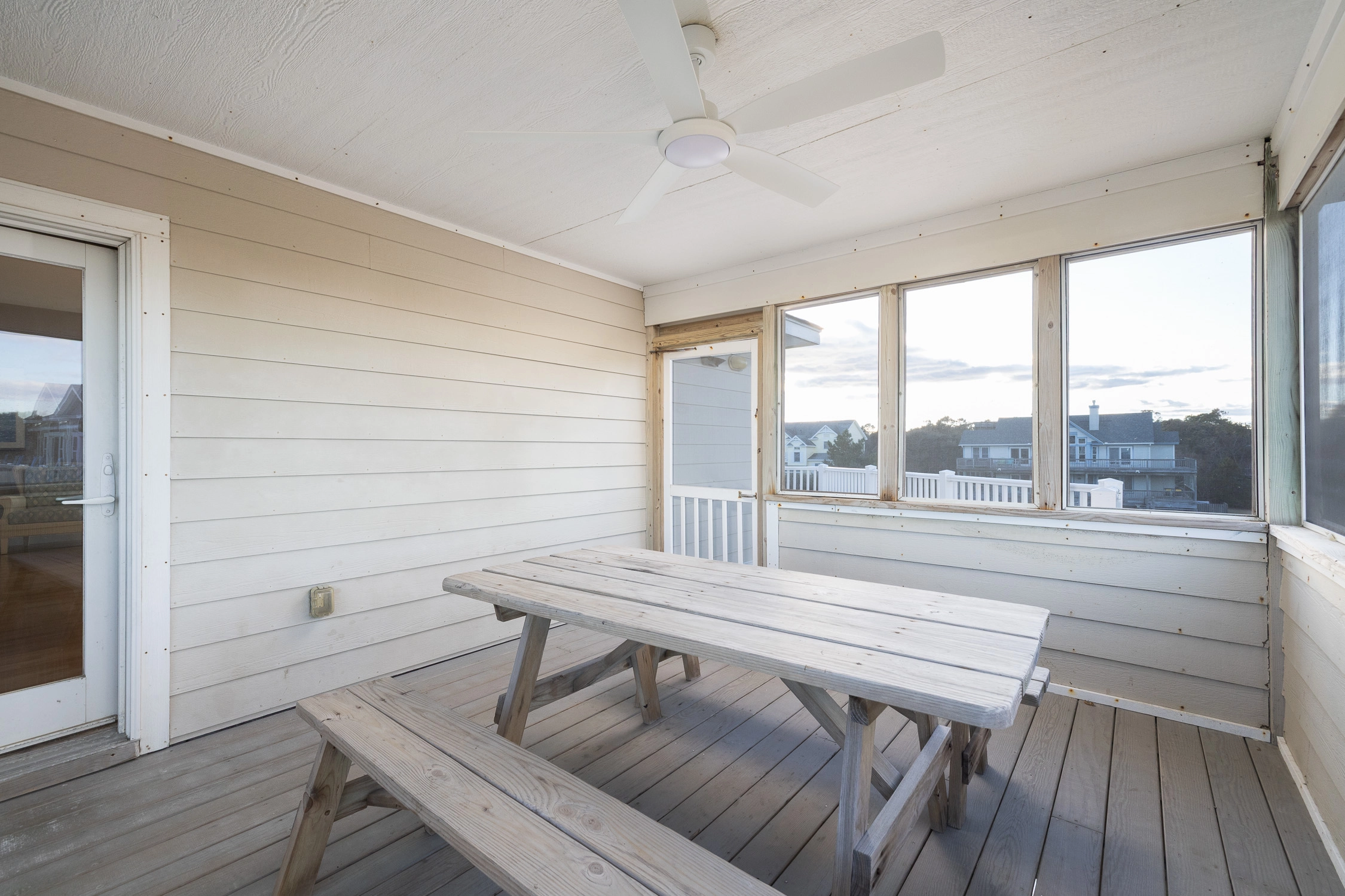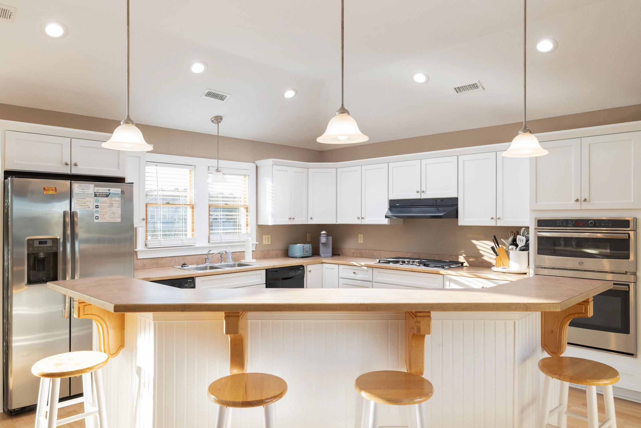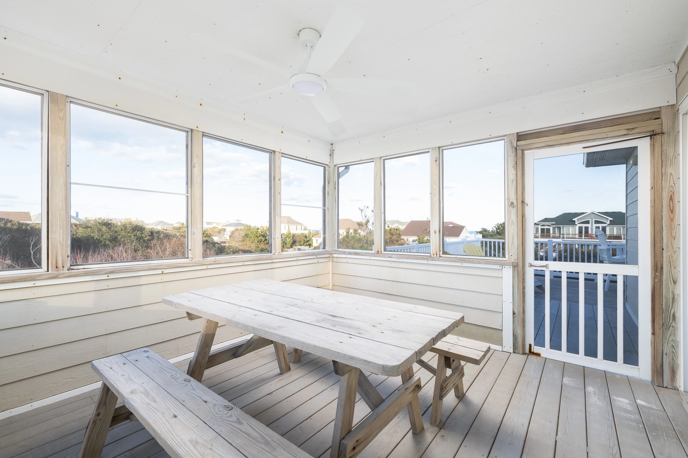 Great room with gas fireplace; kitchen with gas stove and two dishwashers; dining area; screened porch.