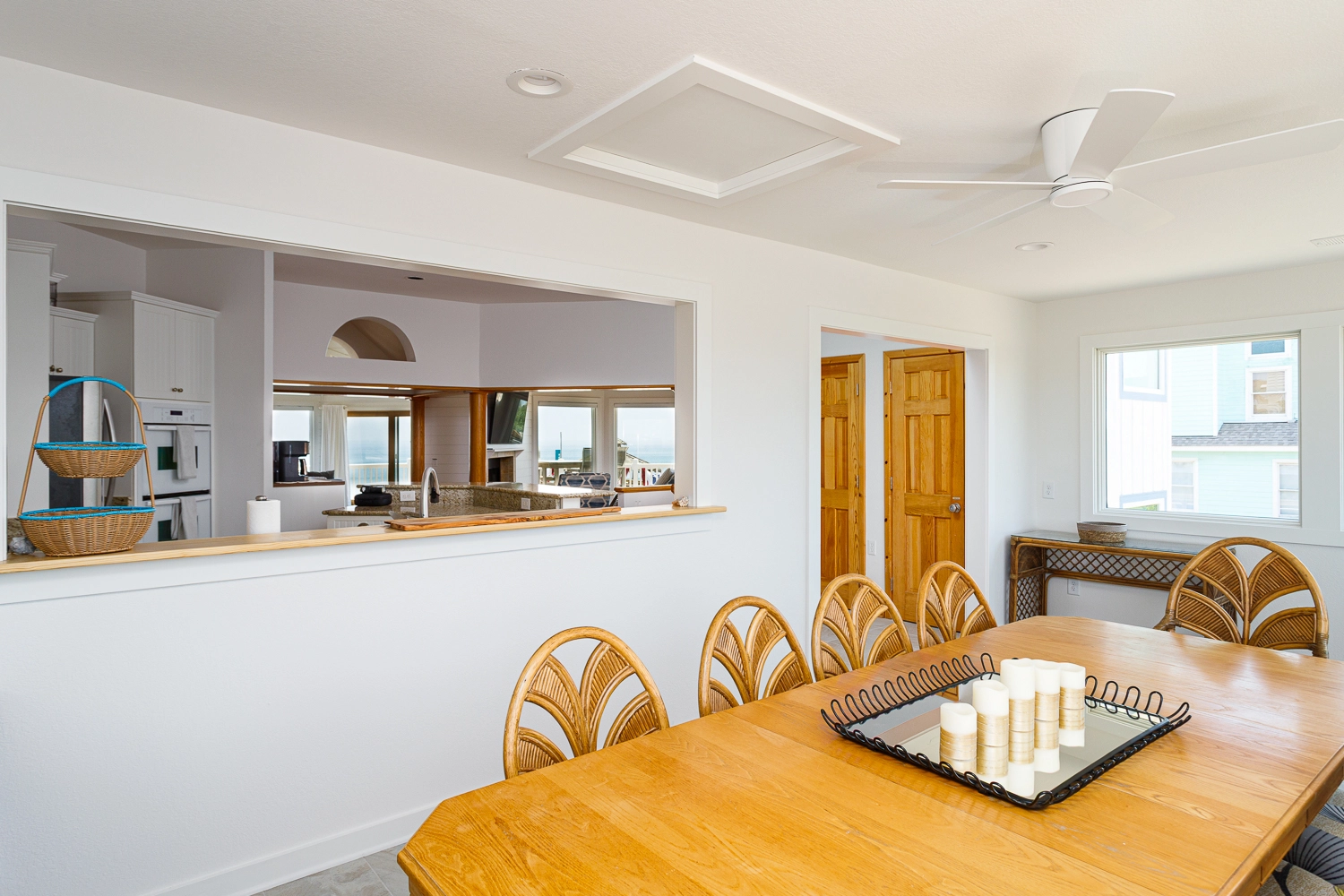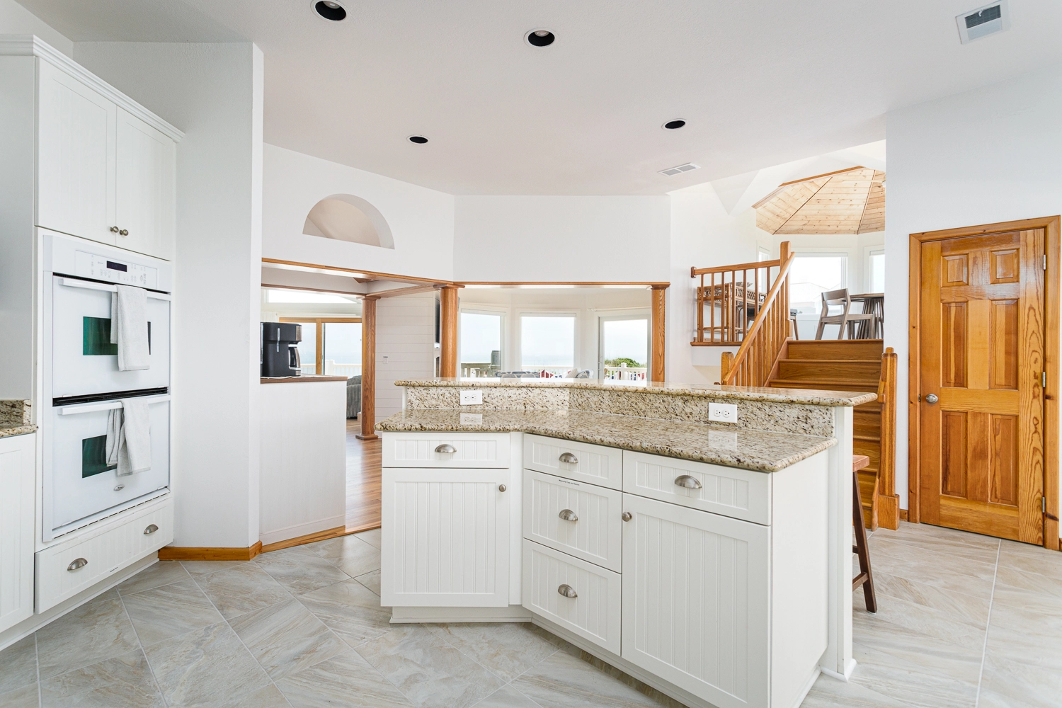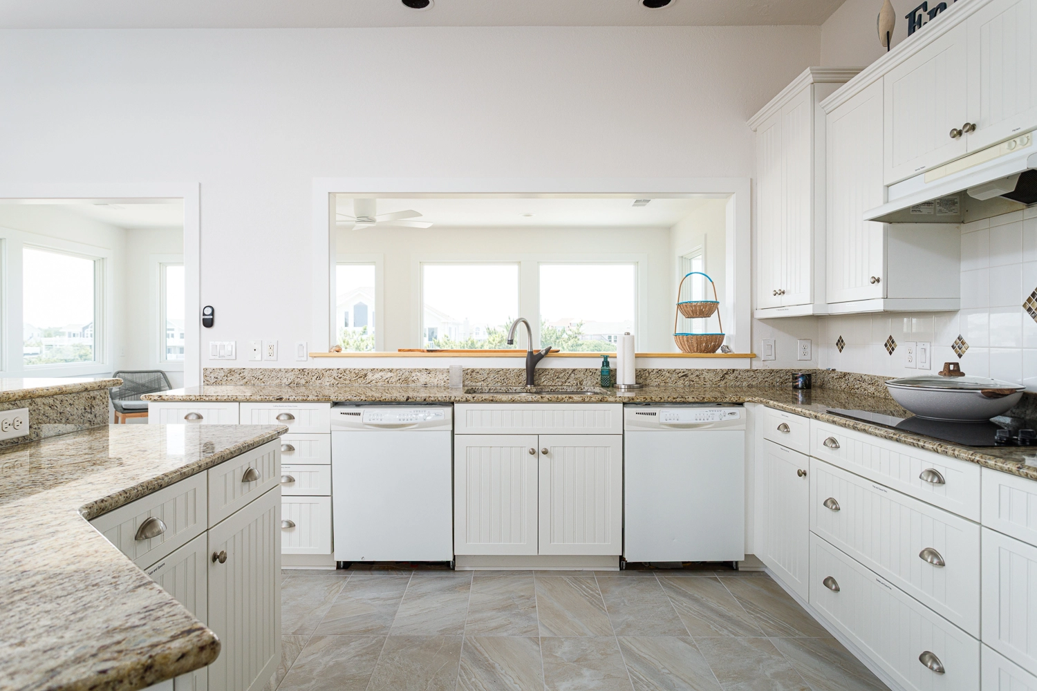 Great room; kitchen with two ovens and two dishwashers; dining area.