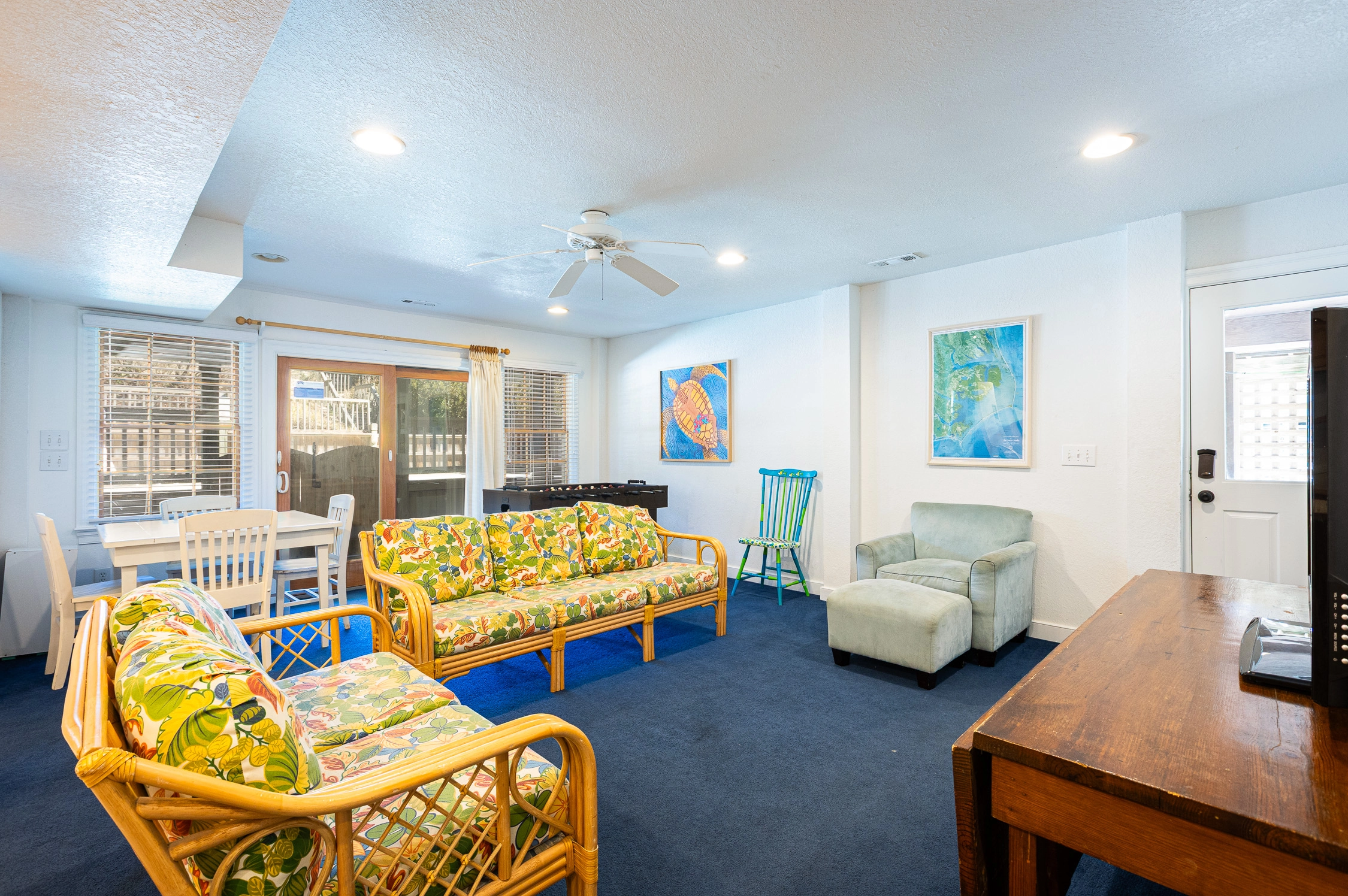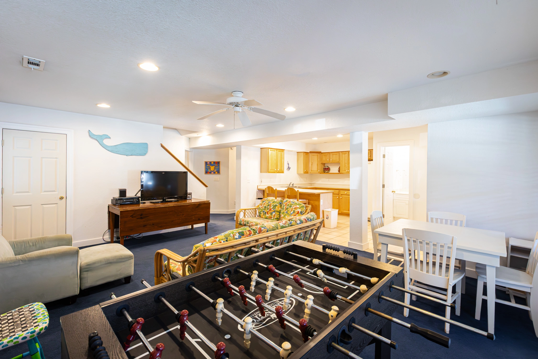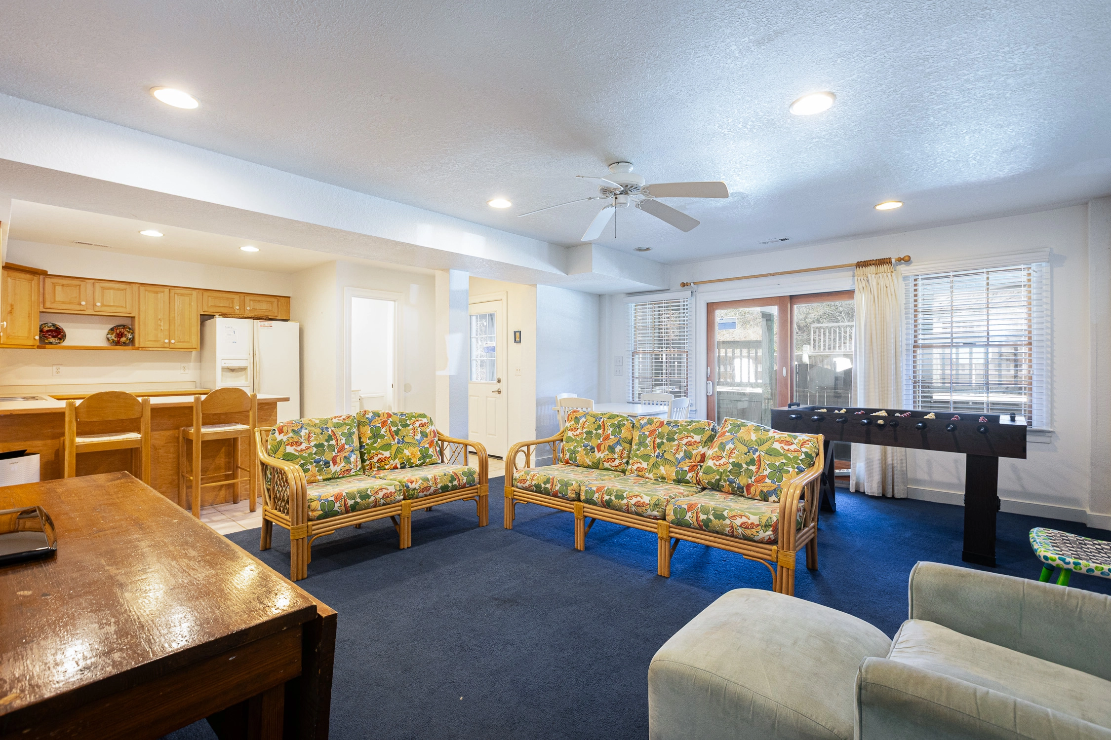 Game room with foosball and kitchenette; hot tub; walkway with covered dune deck gazebo.