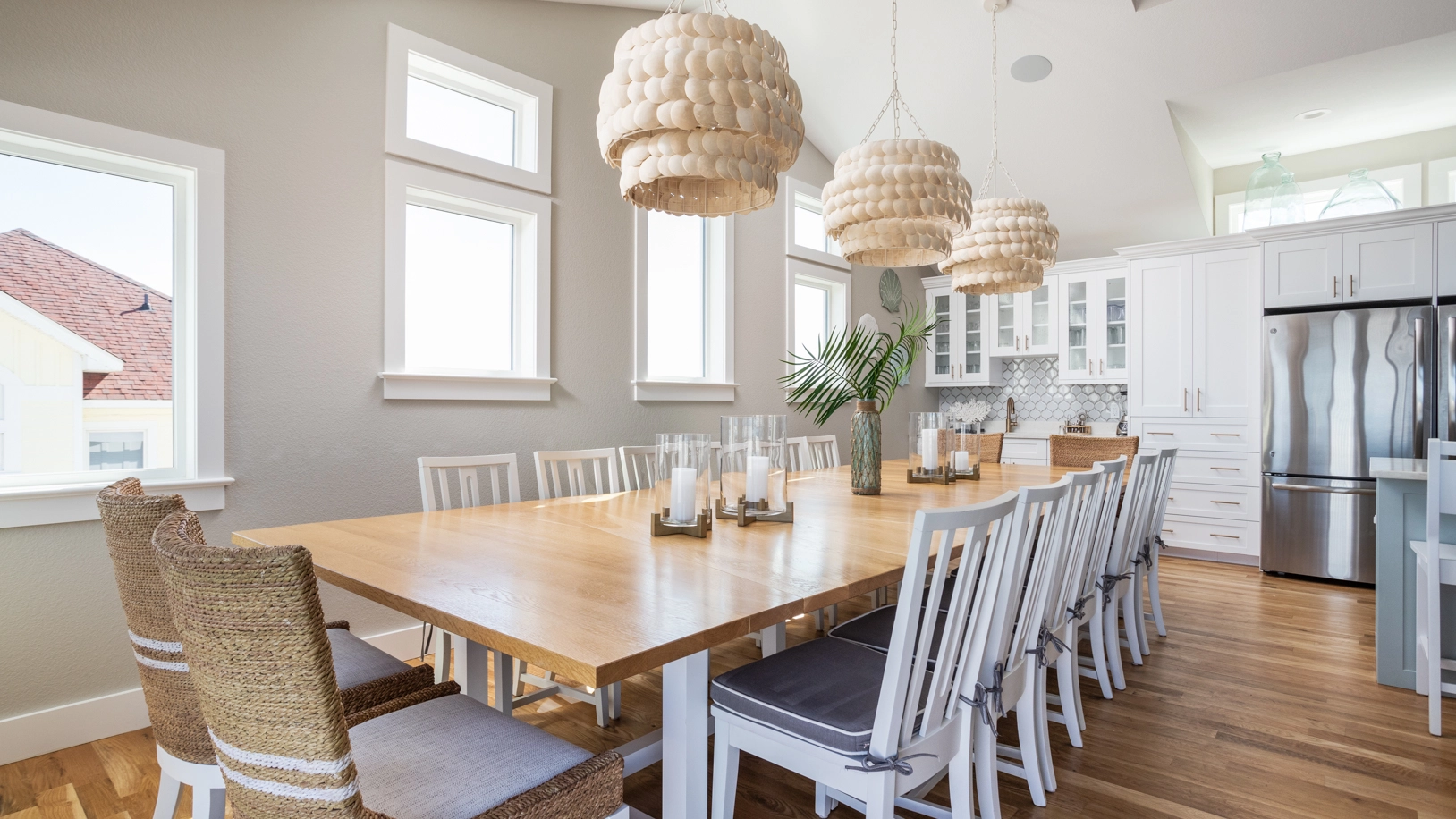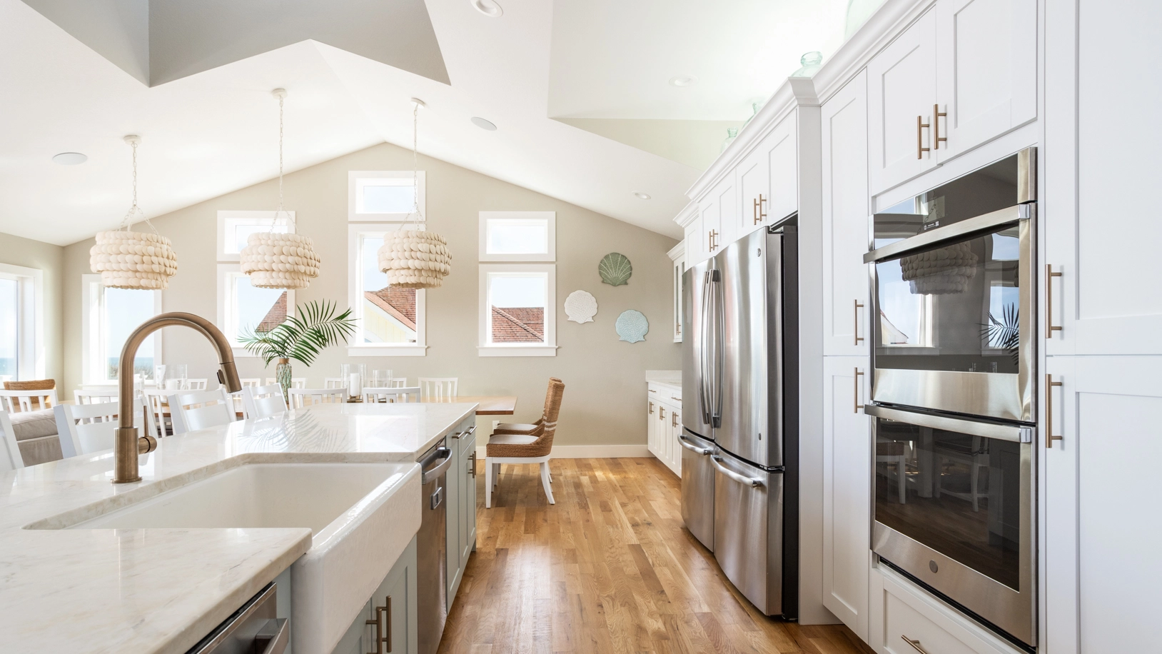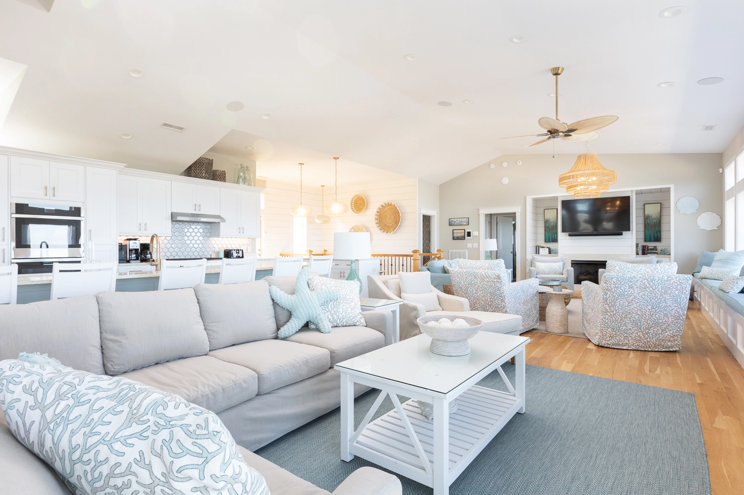Great room with fireplace; kitchen with six-burner gas stove, two refrigerators, two dishwashers, double oven, and stand-alone ice machine; dining area.